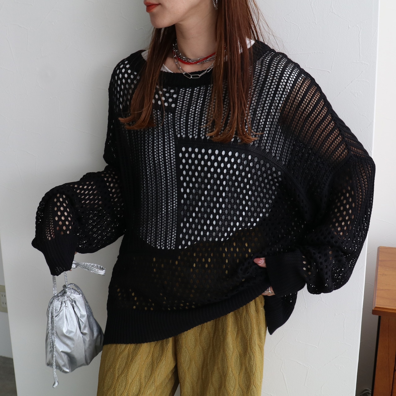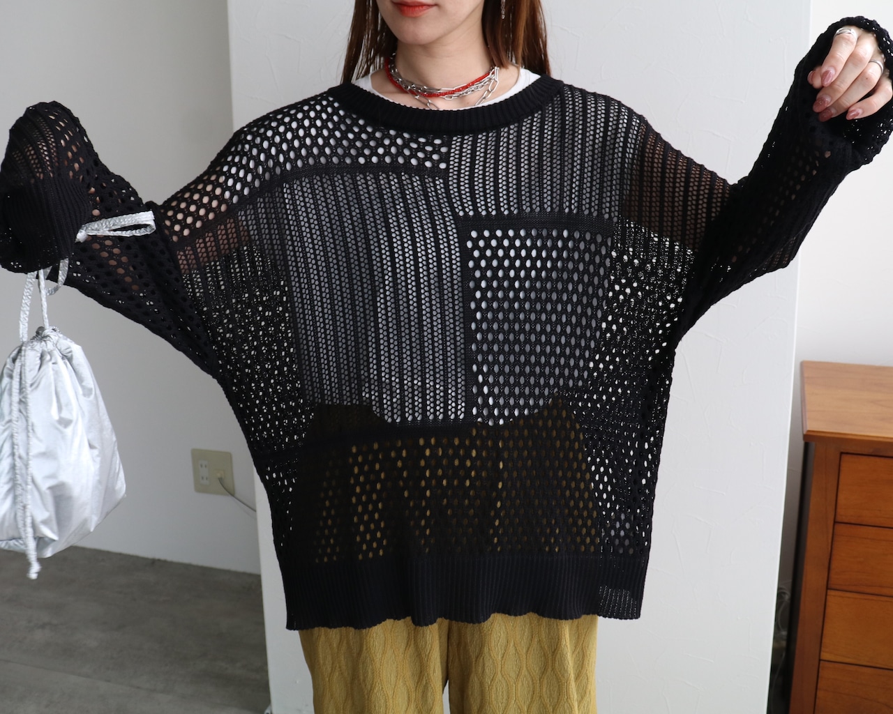 シンプルなコーディネートに映える透かし編みがポイントのニット。