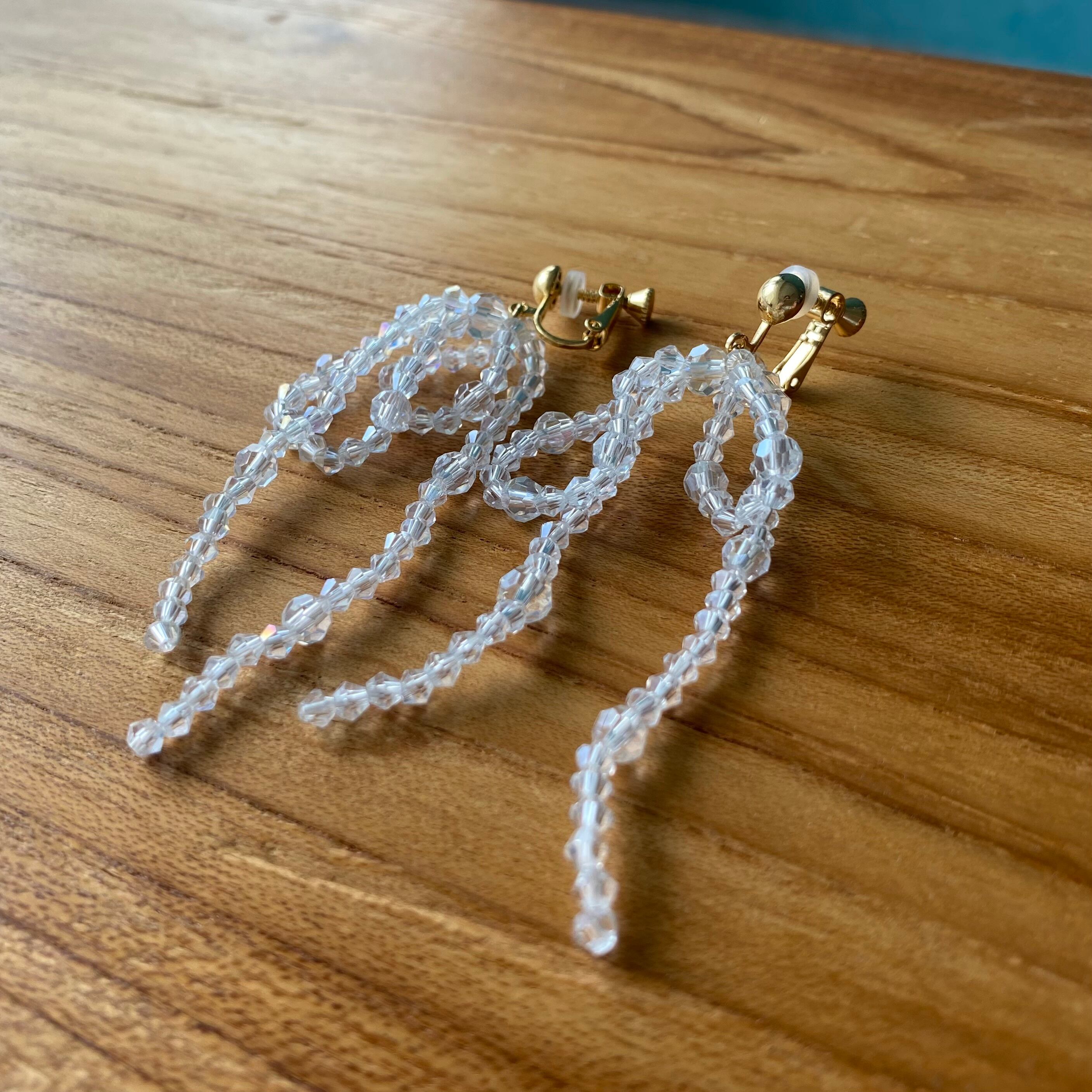 ガラスのビーズで仕立てたリボンモチーフのピアス。