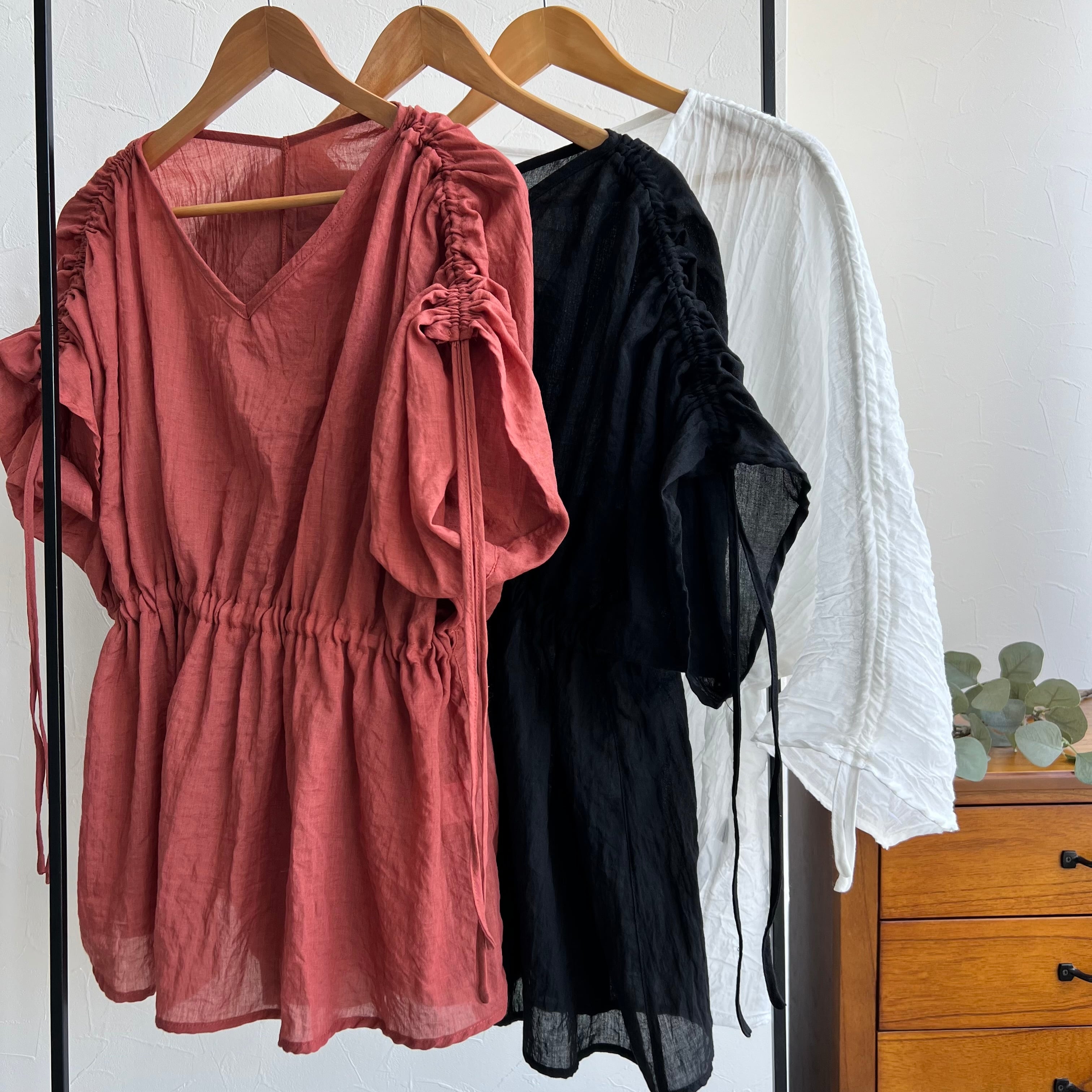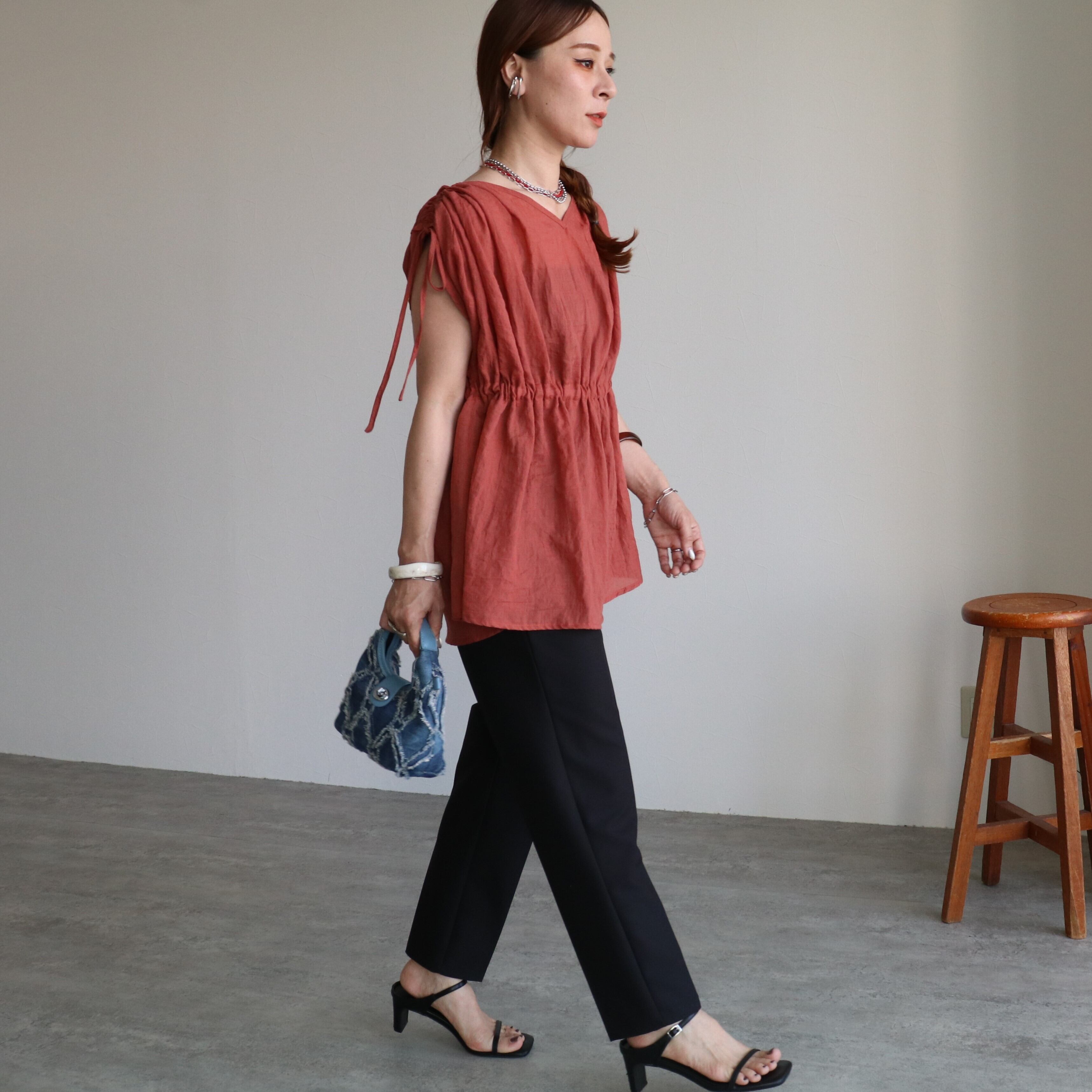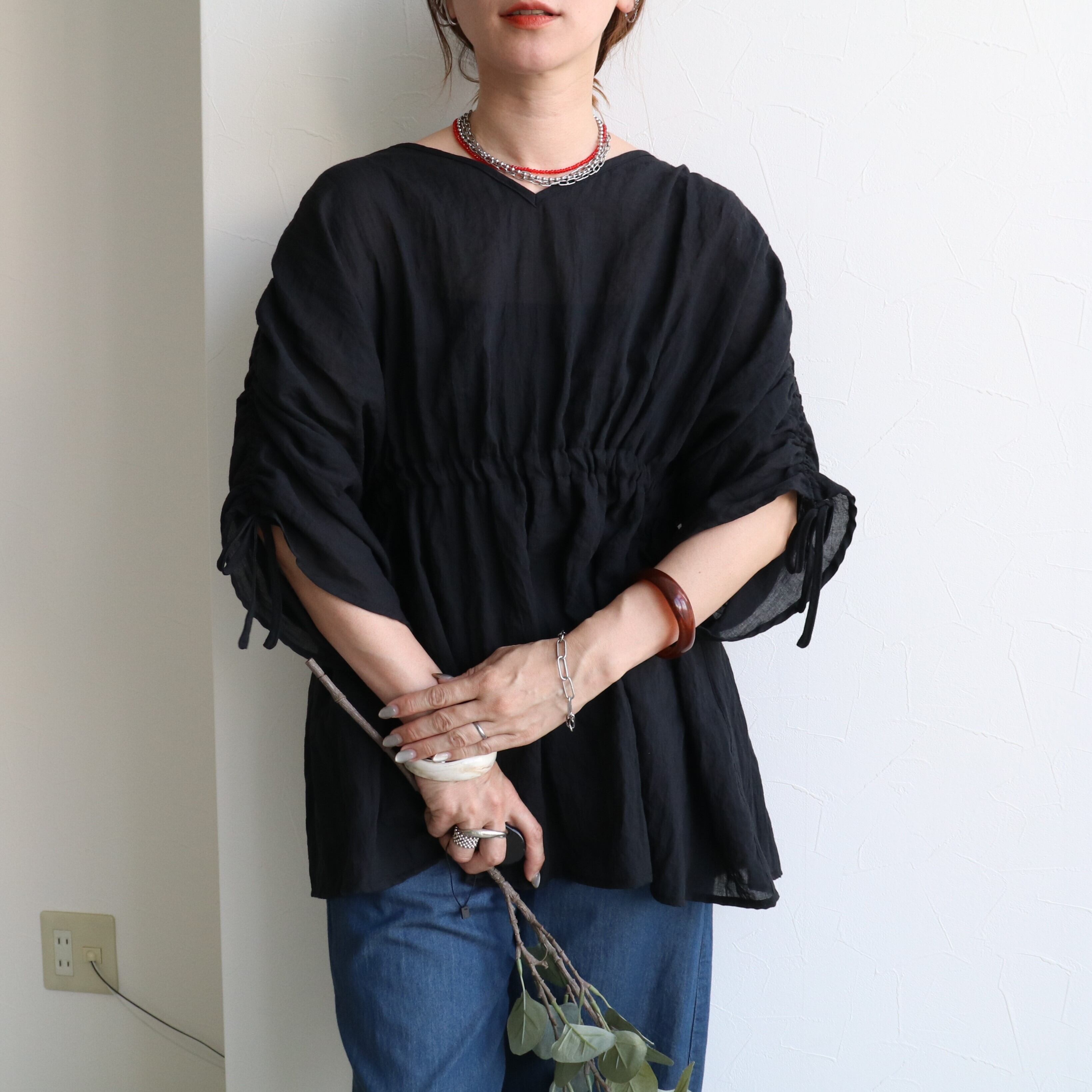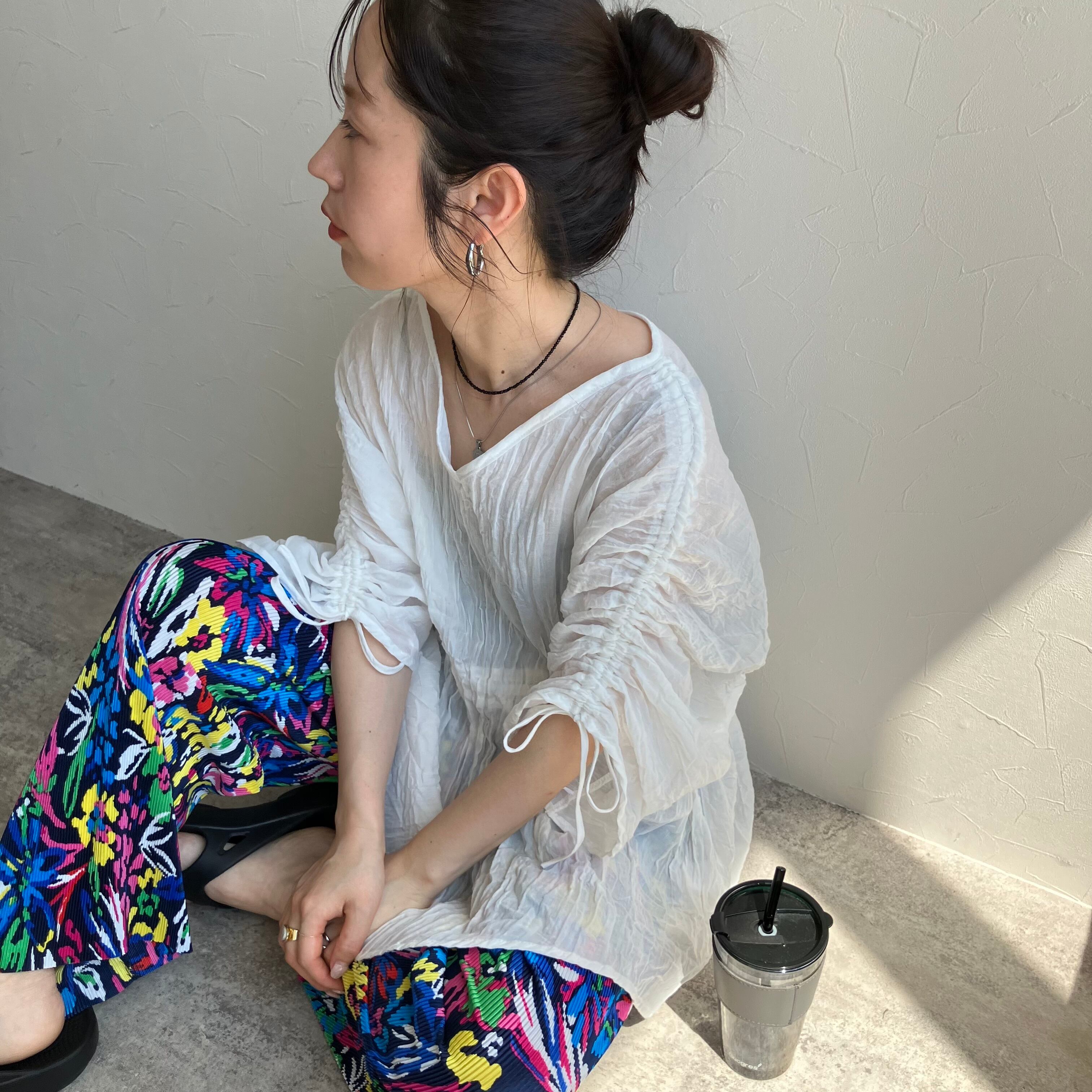 ほんのり透け感とたっぷりのギャザーが今季らしいVネックブラウス。