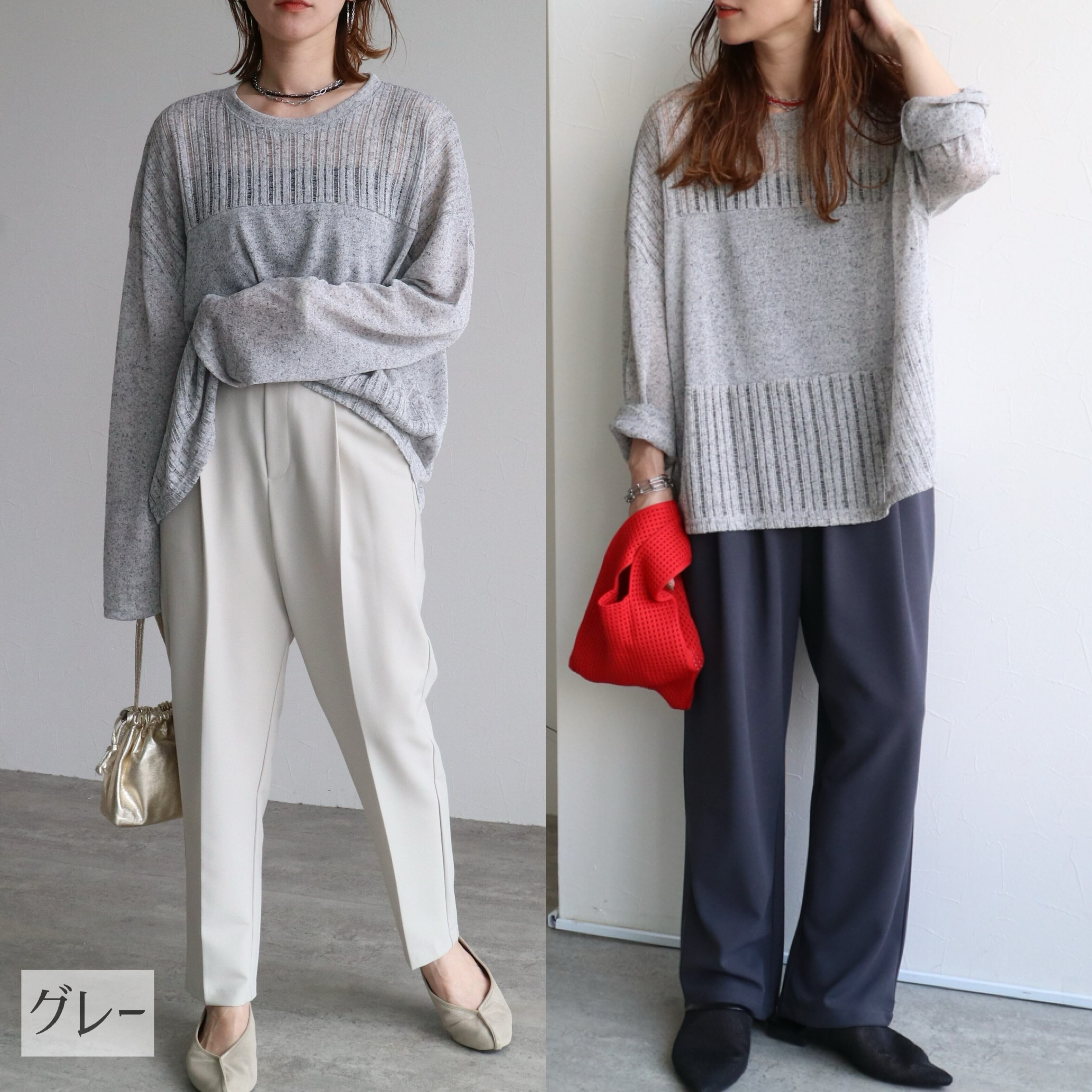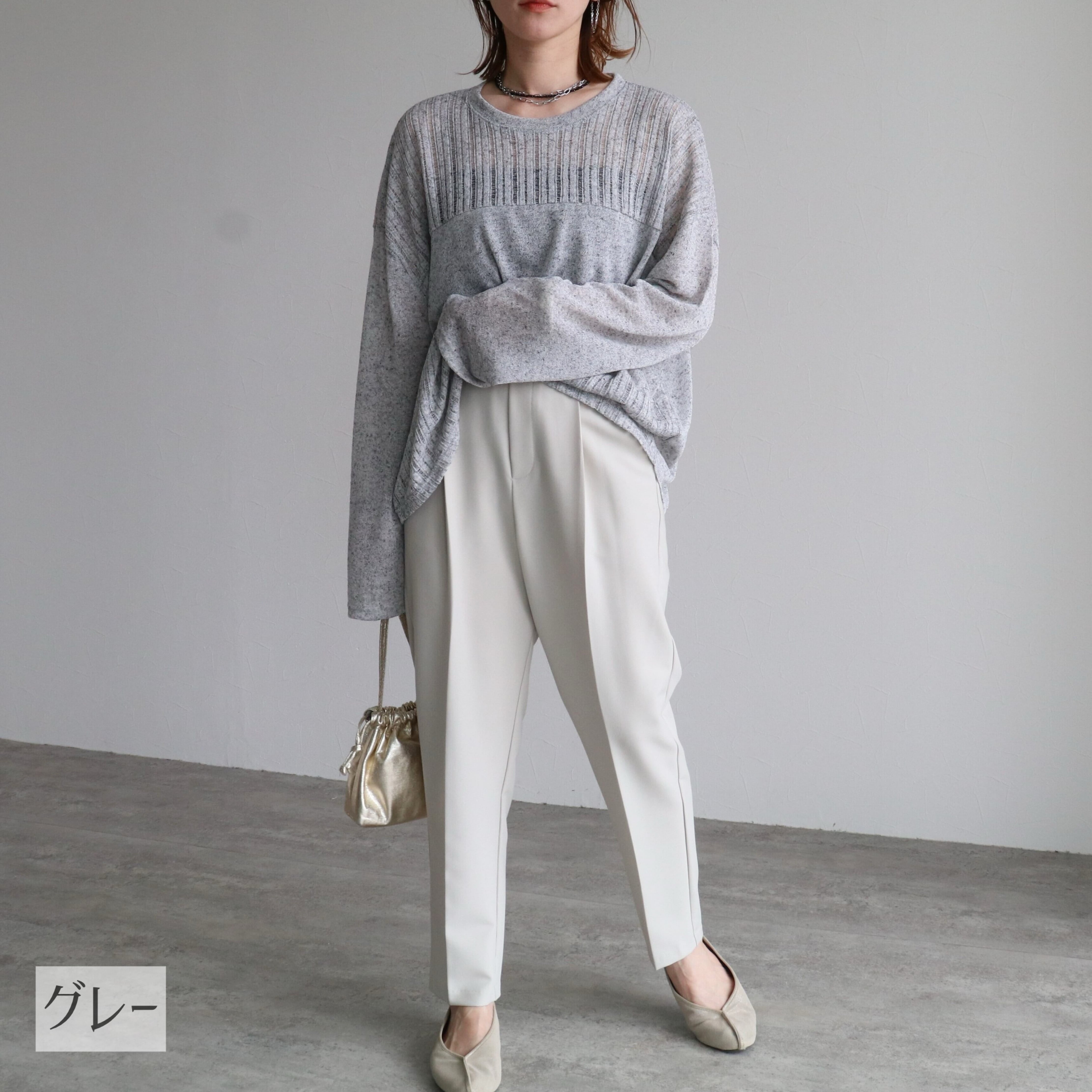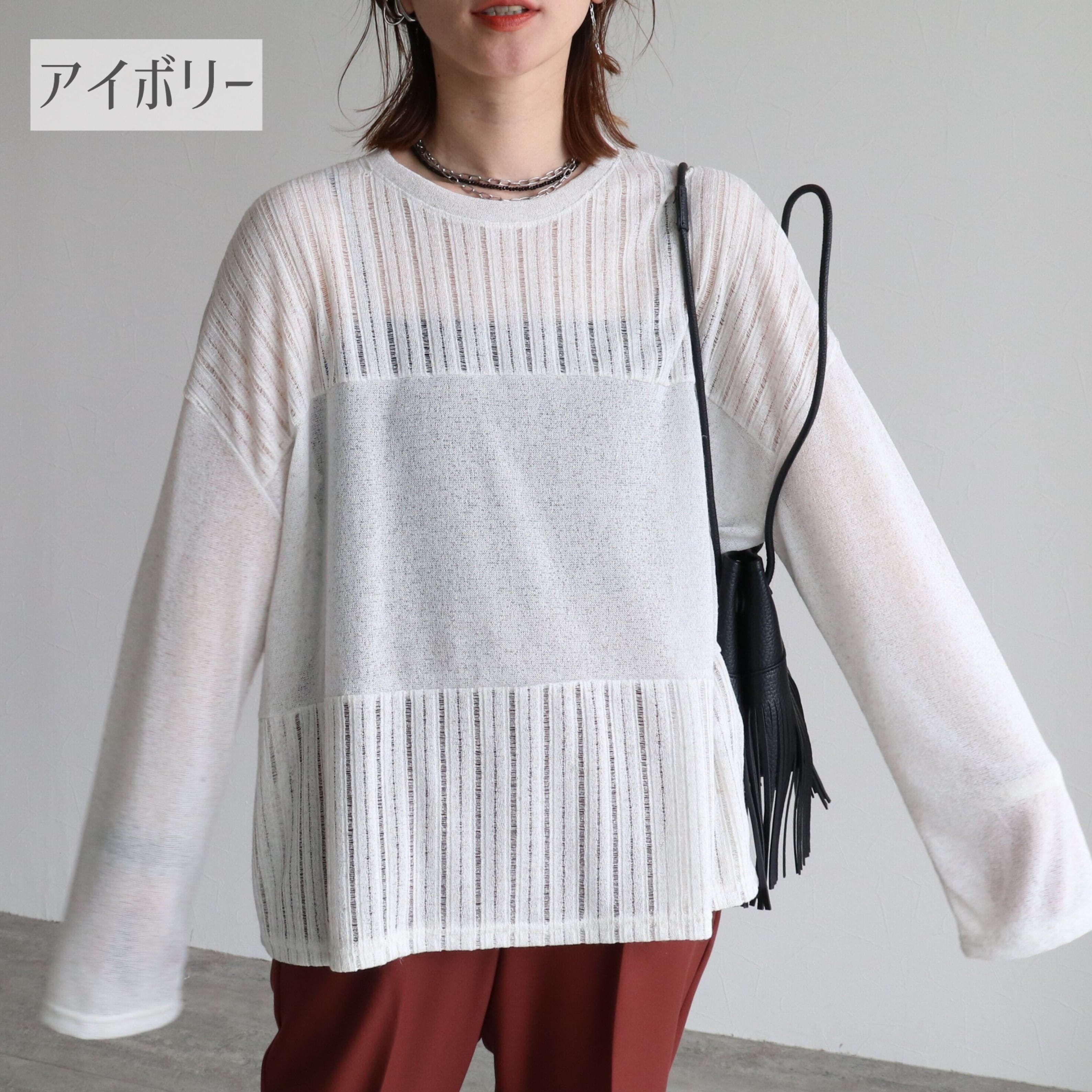 首周りはやや広めのクルーネックで、すっきりとした印象で程よい上品な透け感。