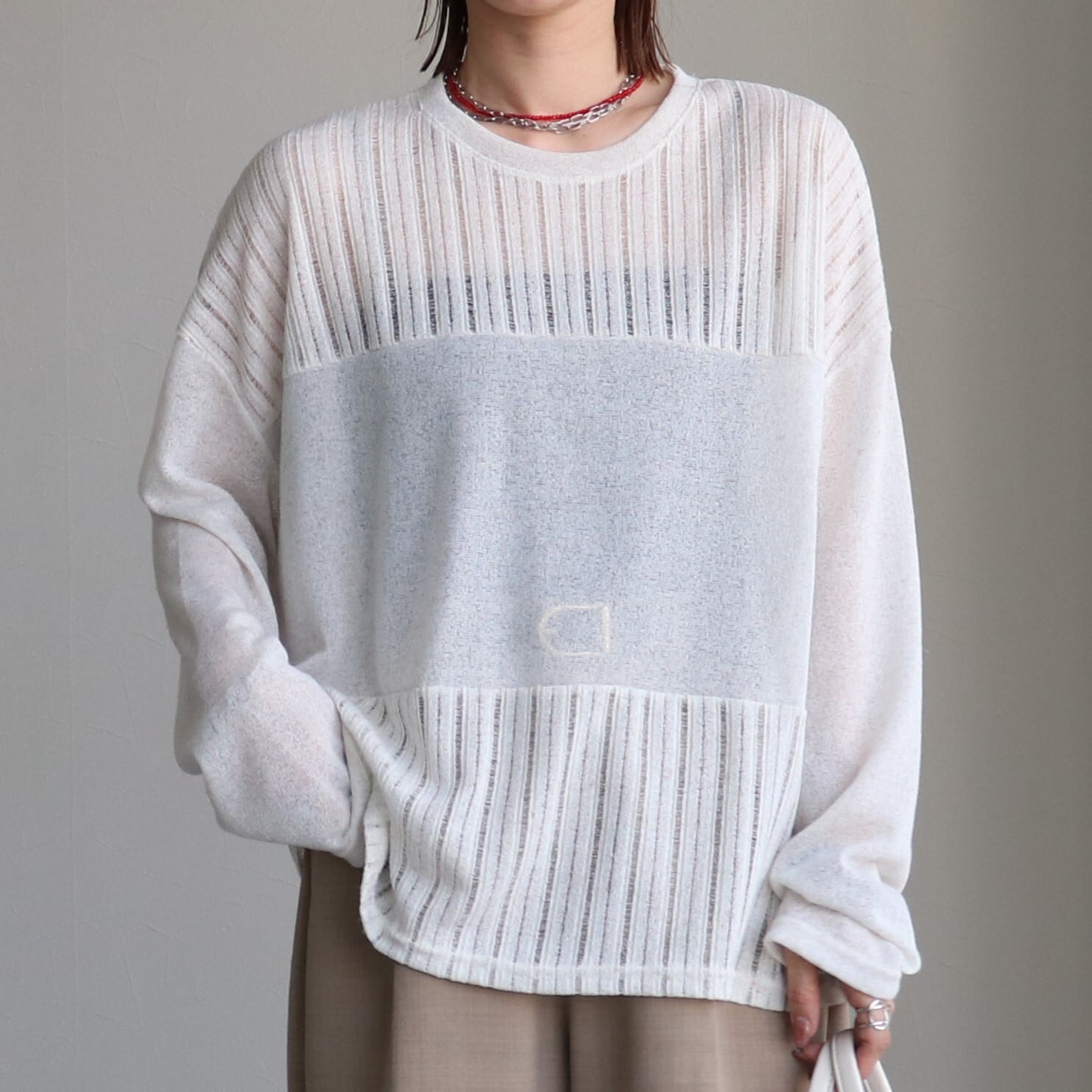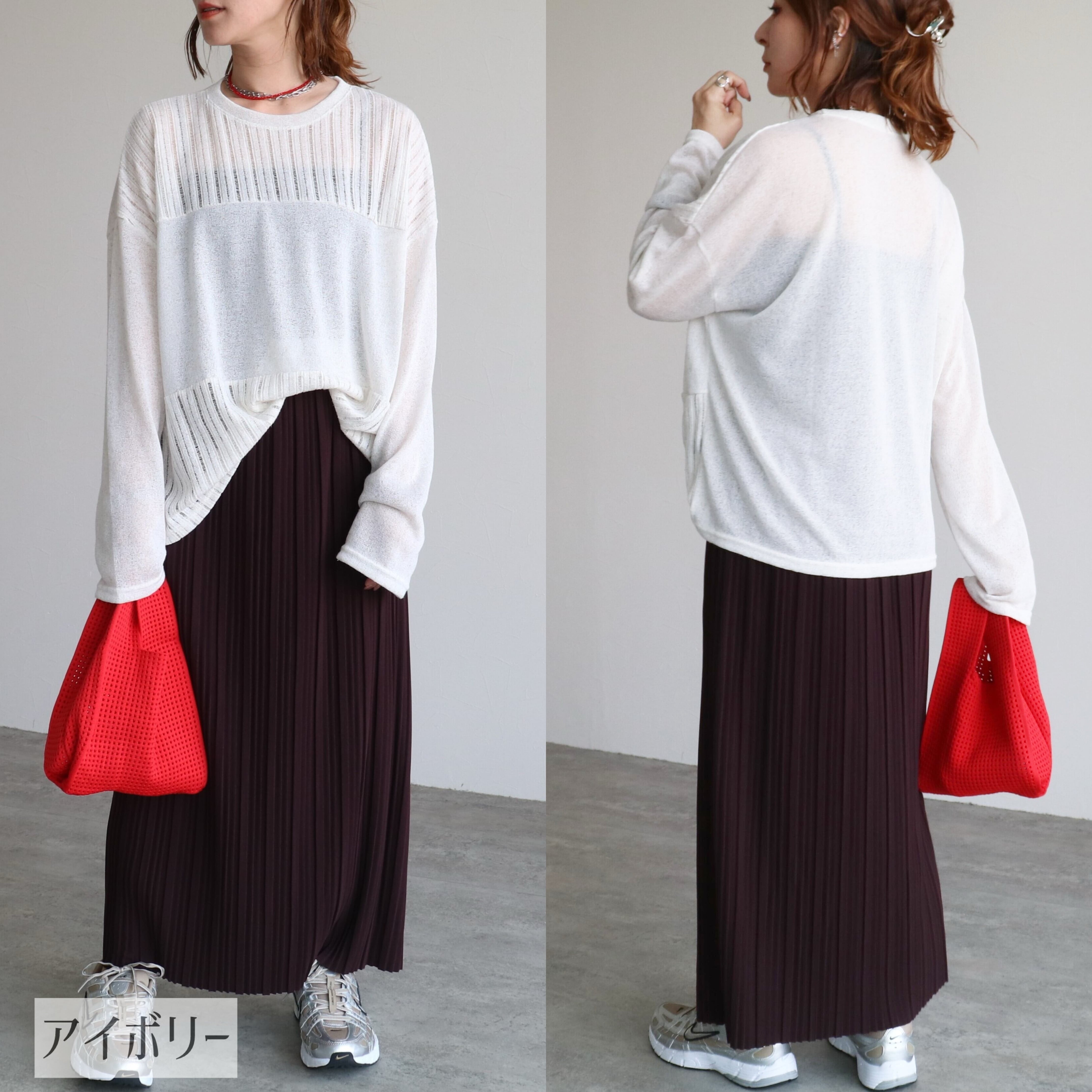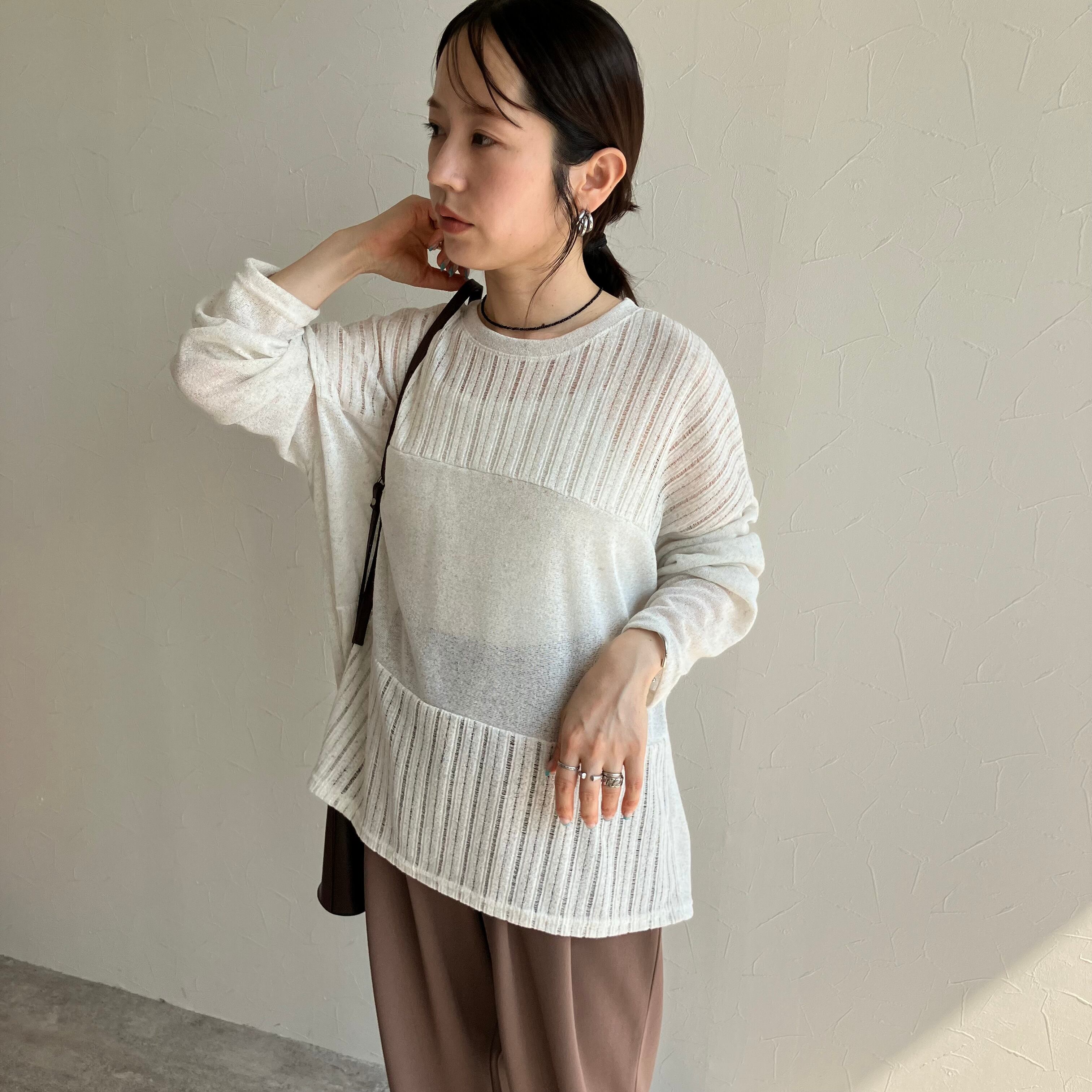 首周りはやや広めのクルーネックで、すっきりとした印象で程よい上品な透け感。