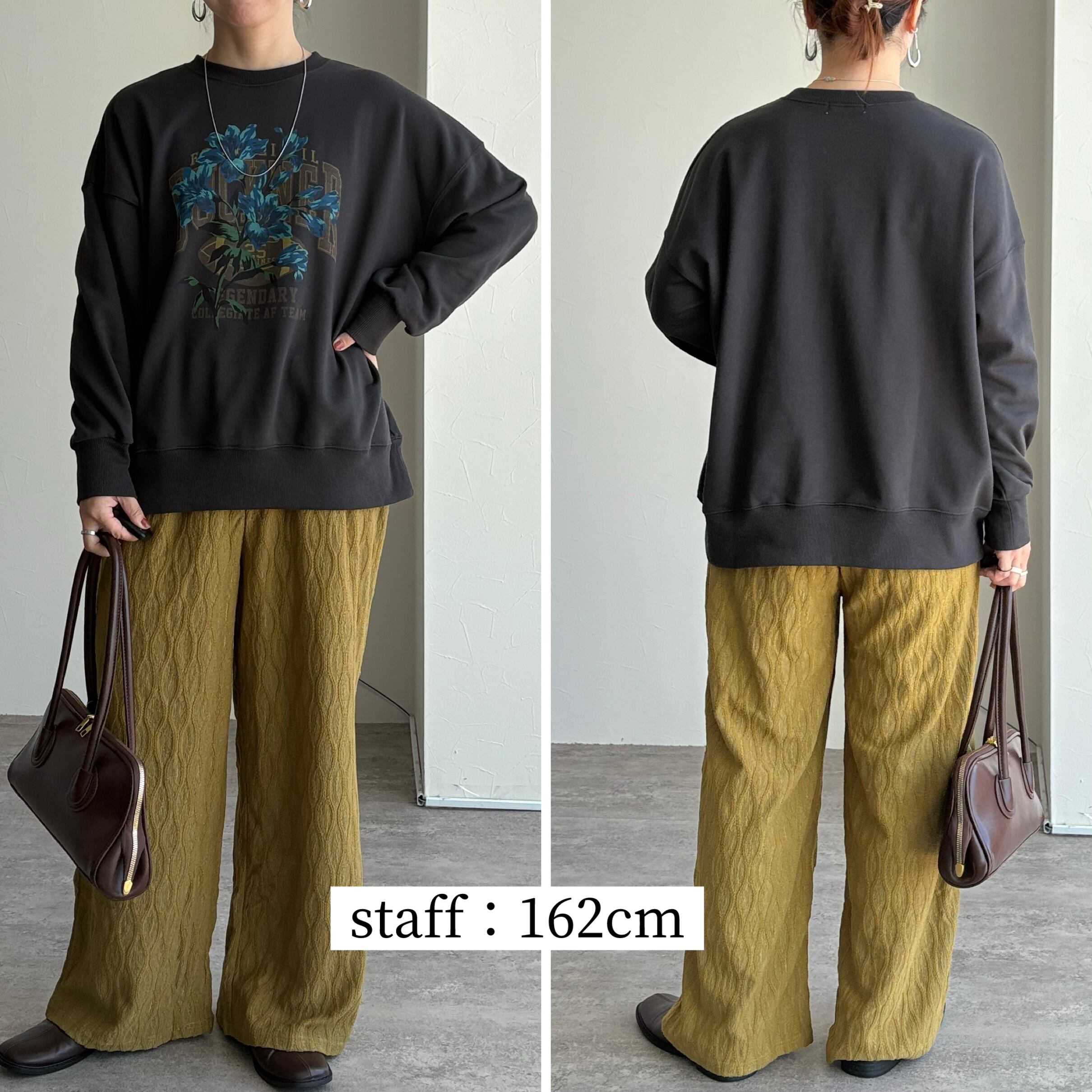大人の雰囲気のフラワープリントとカレッジロゴの組み合わせが可愛い裏毛スウェット。