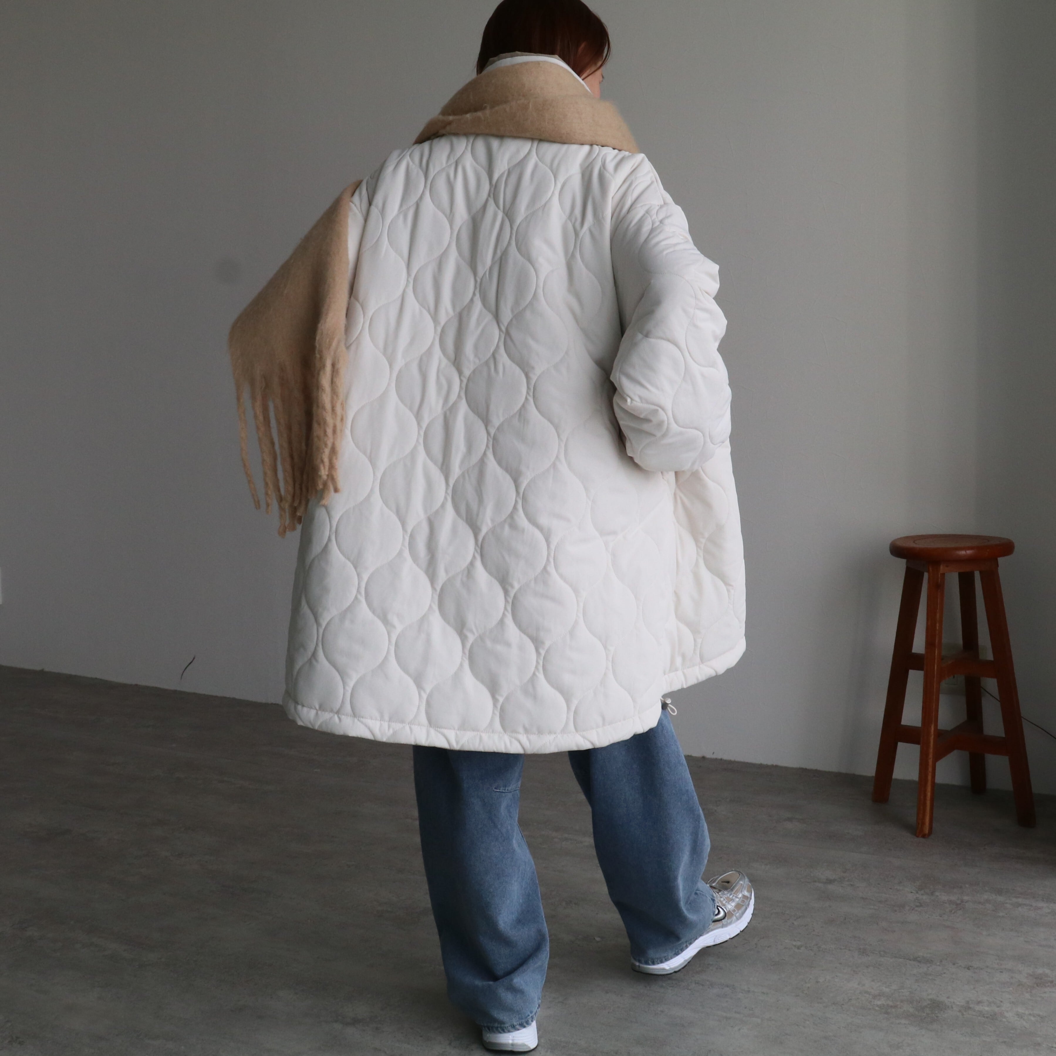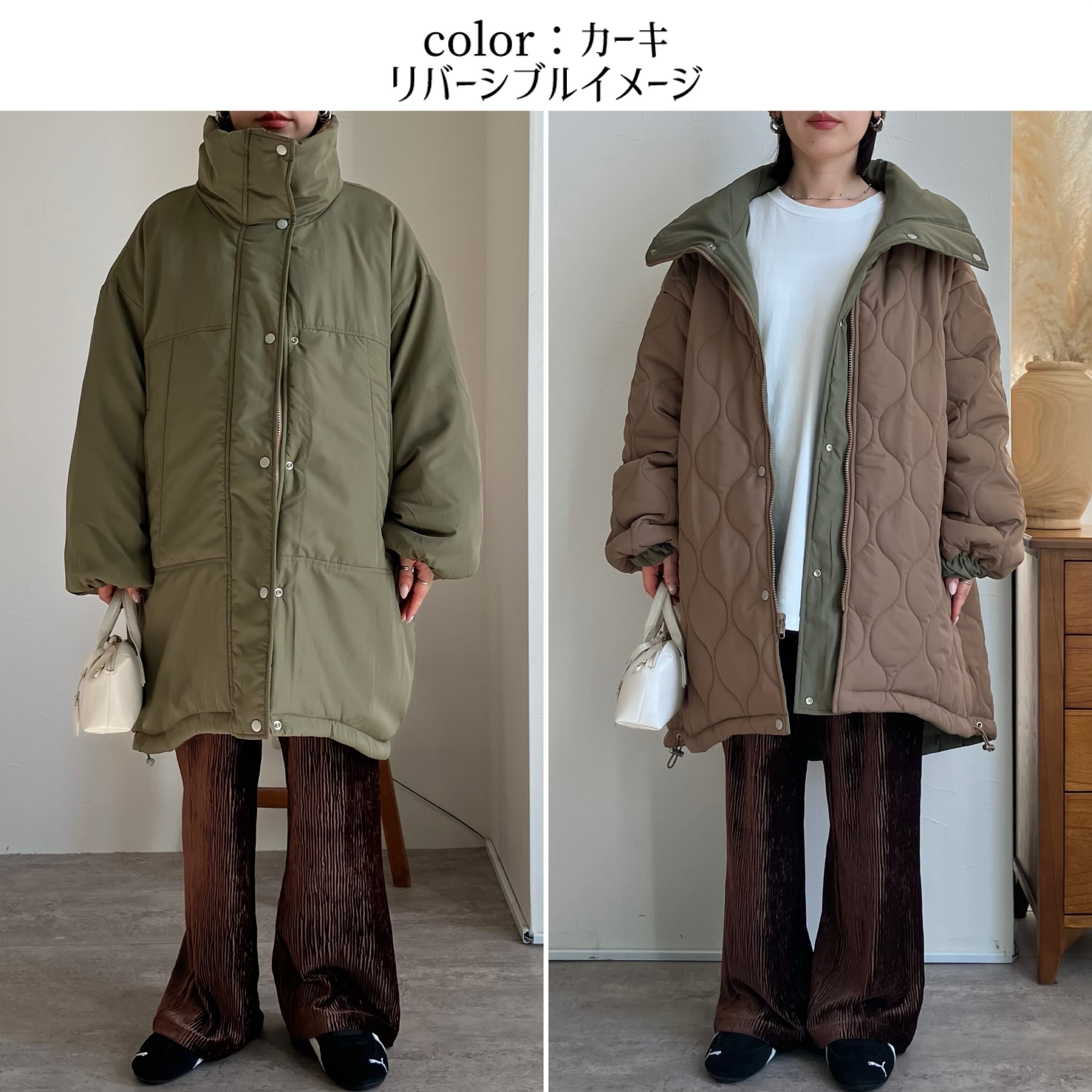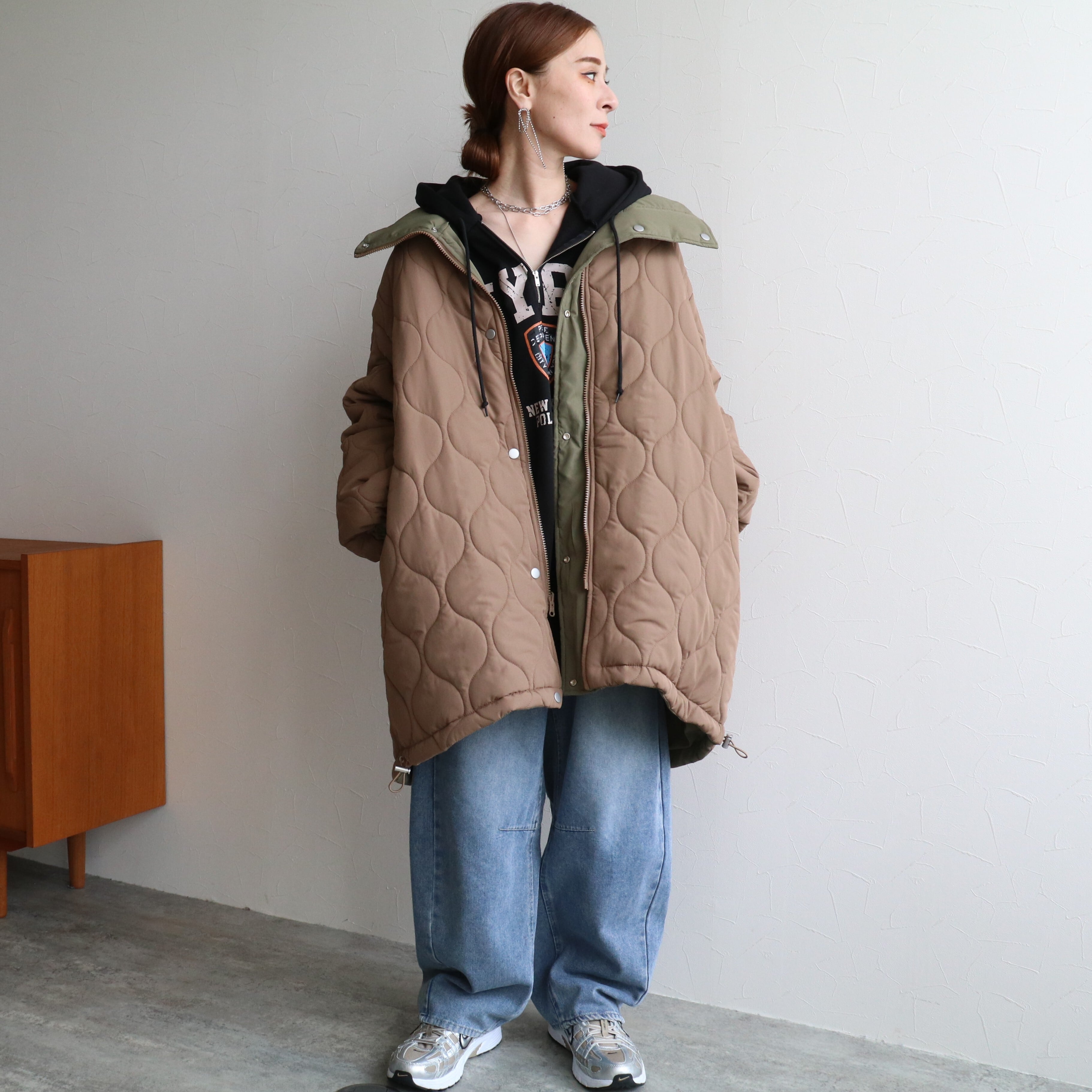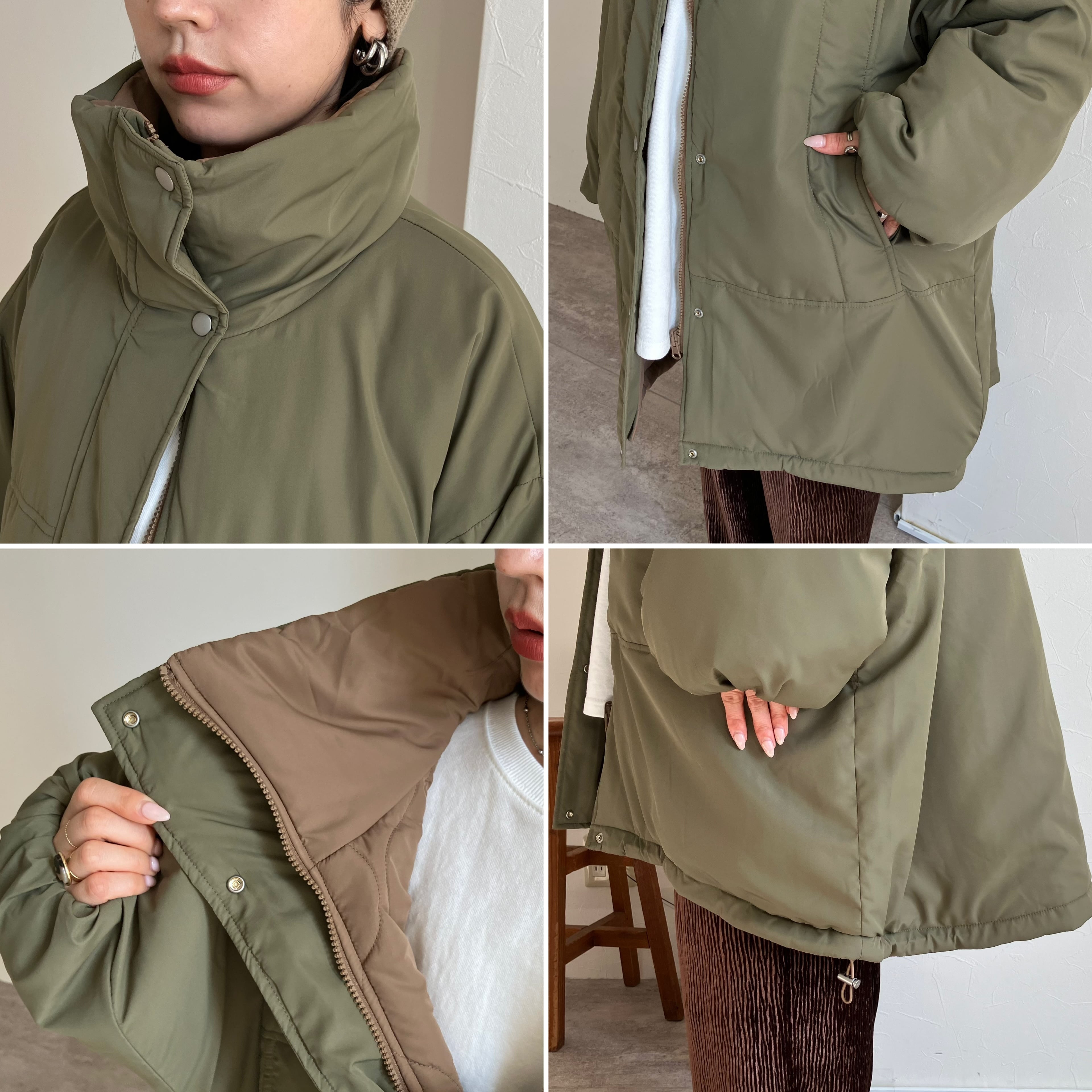 ボリューム感たっぷりのシルエットで防寒性が高く、寒い季節の頼れる一枚として活躍します。なめらかな肌触りの生地とダイヤ柄のキルト生地を使用。