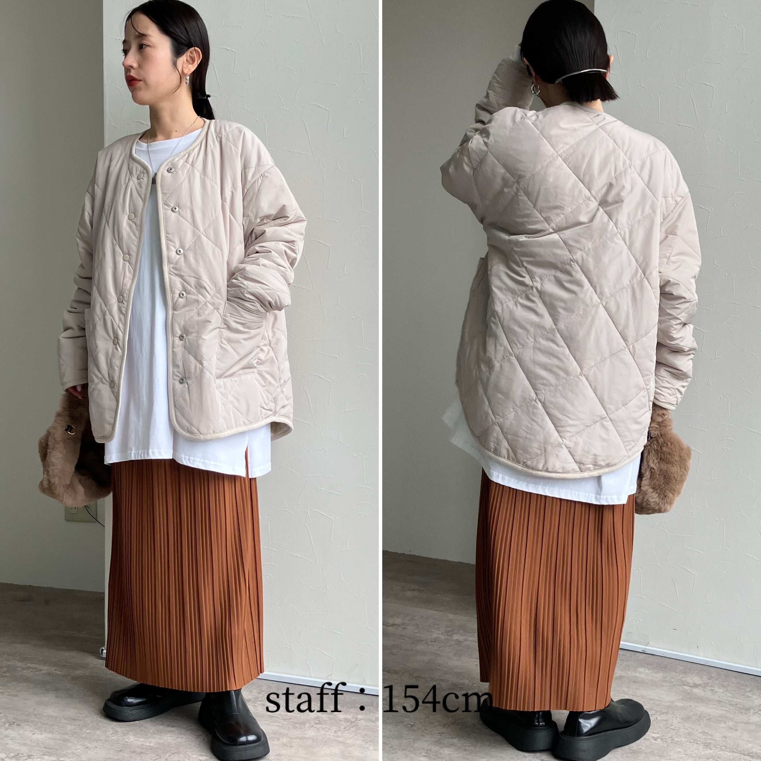 大人カジュアルな印象のキルティングと、きれいめ上品な印象のフェイクファーで、