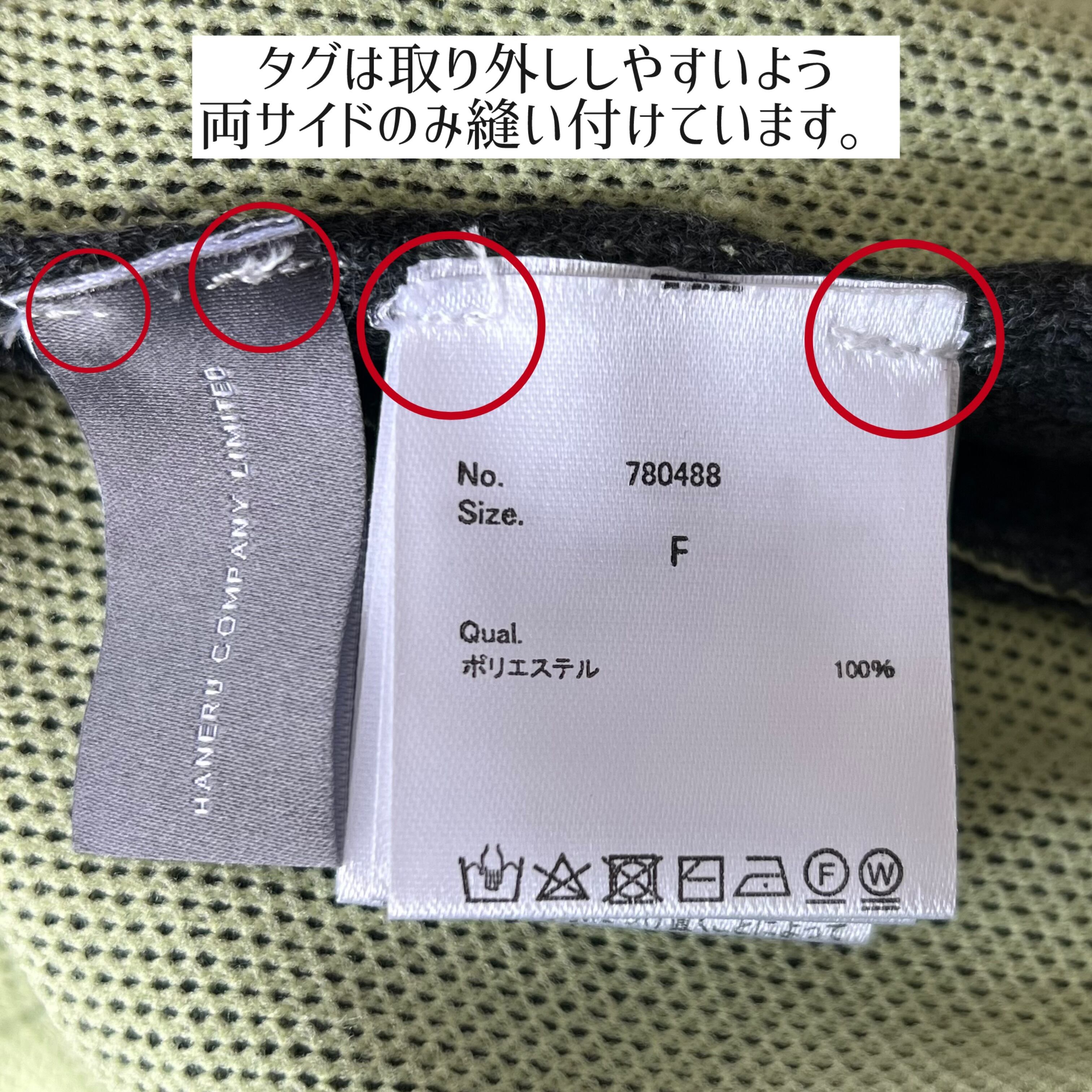 ポケット部分に縫い付けてある洗濯ネームおよびブランドタグを