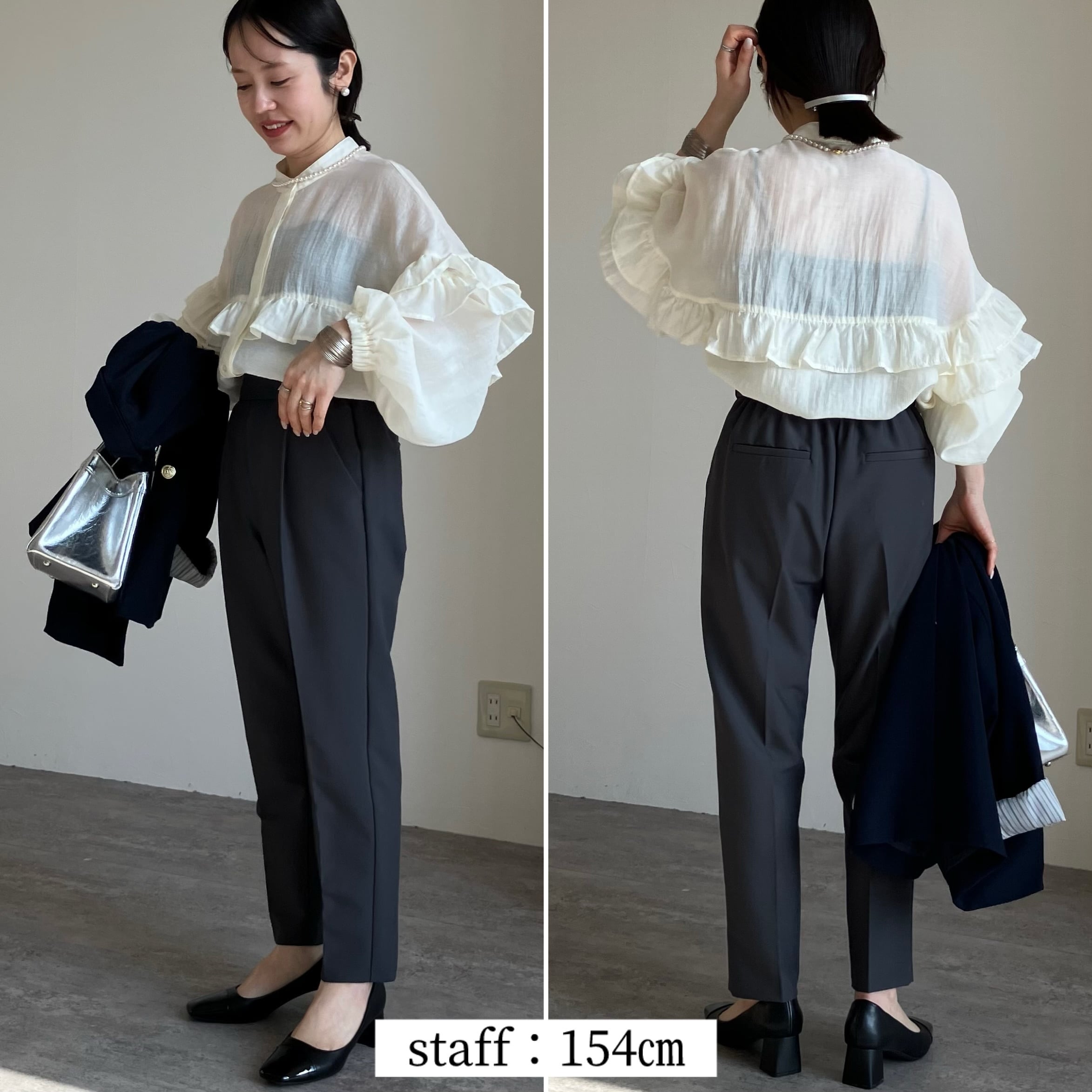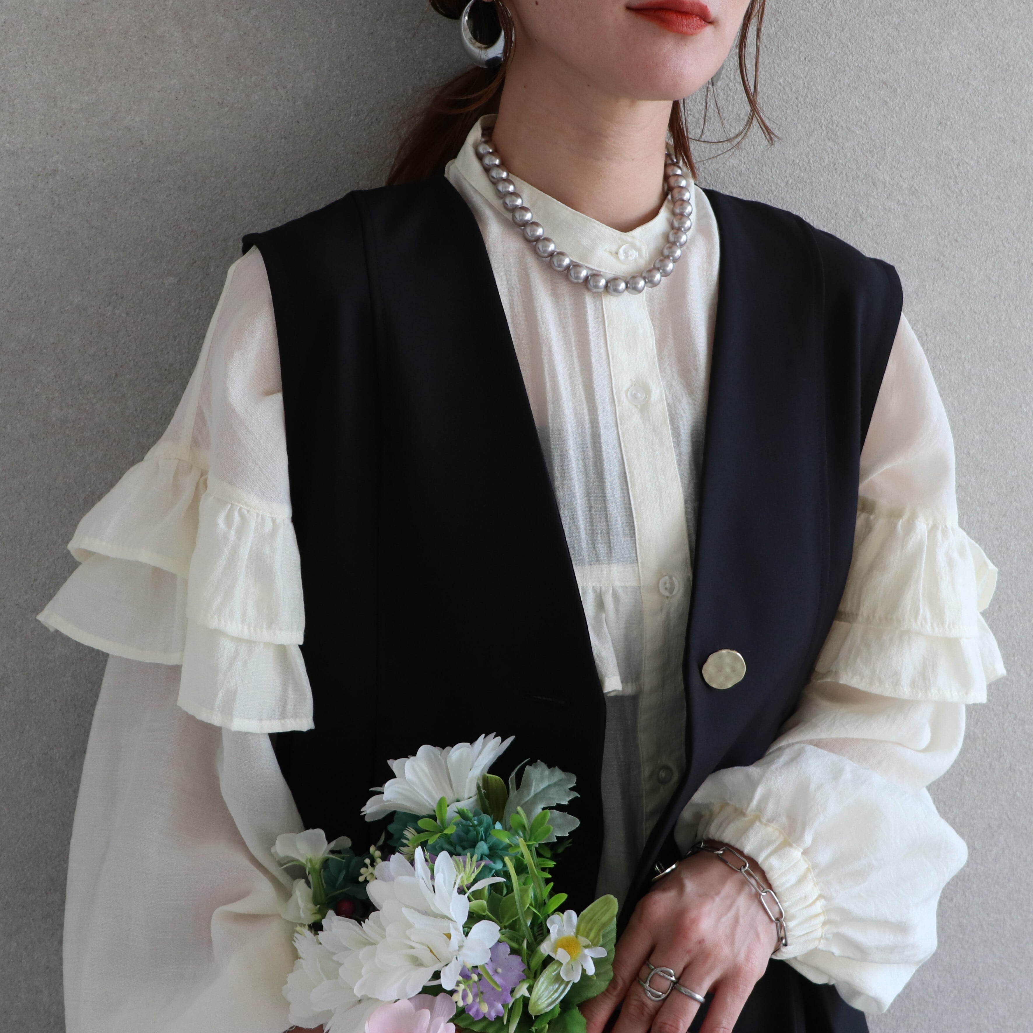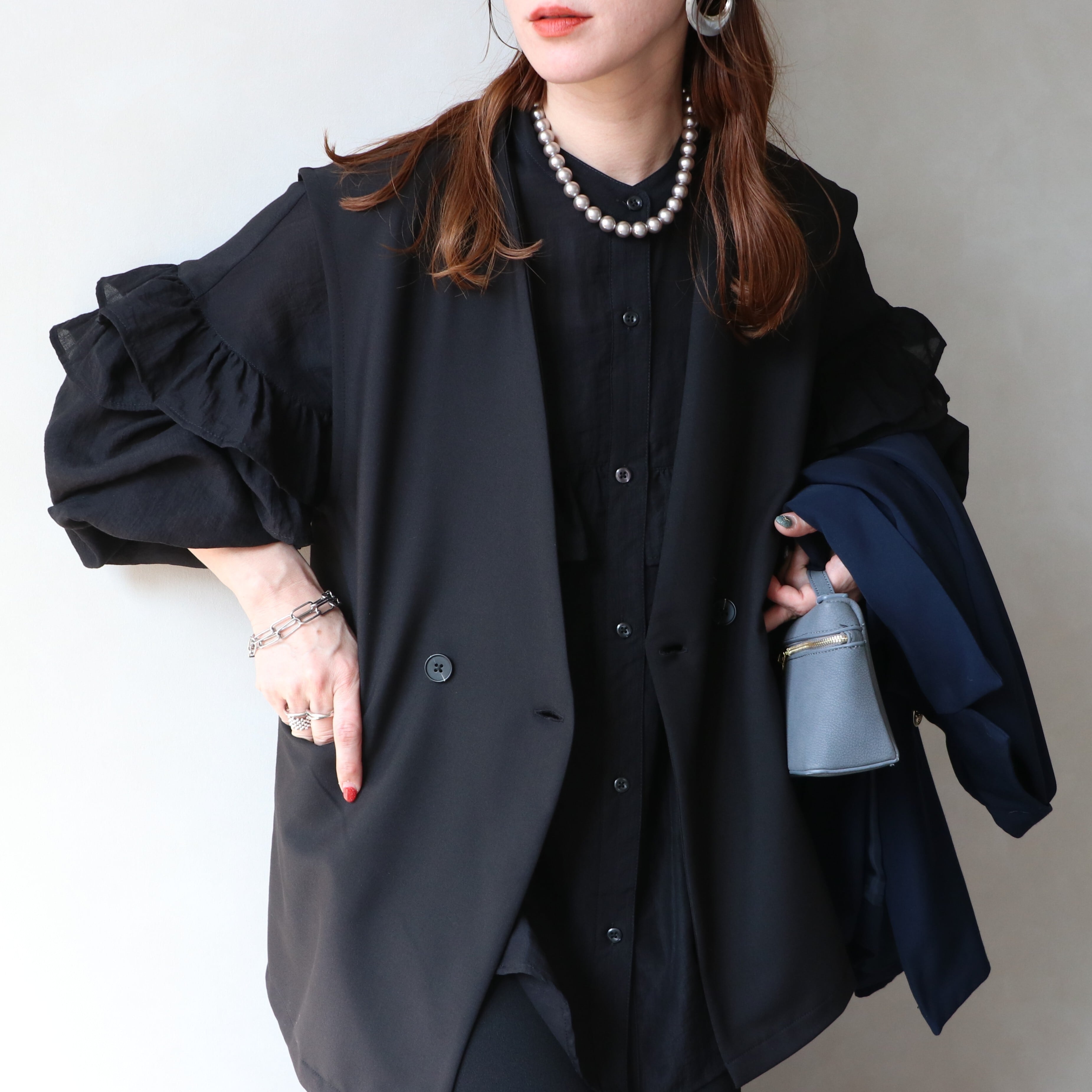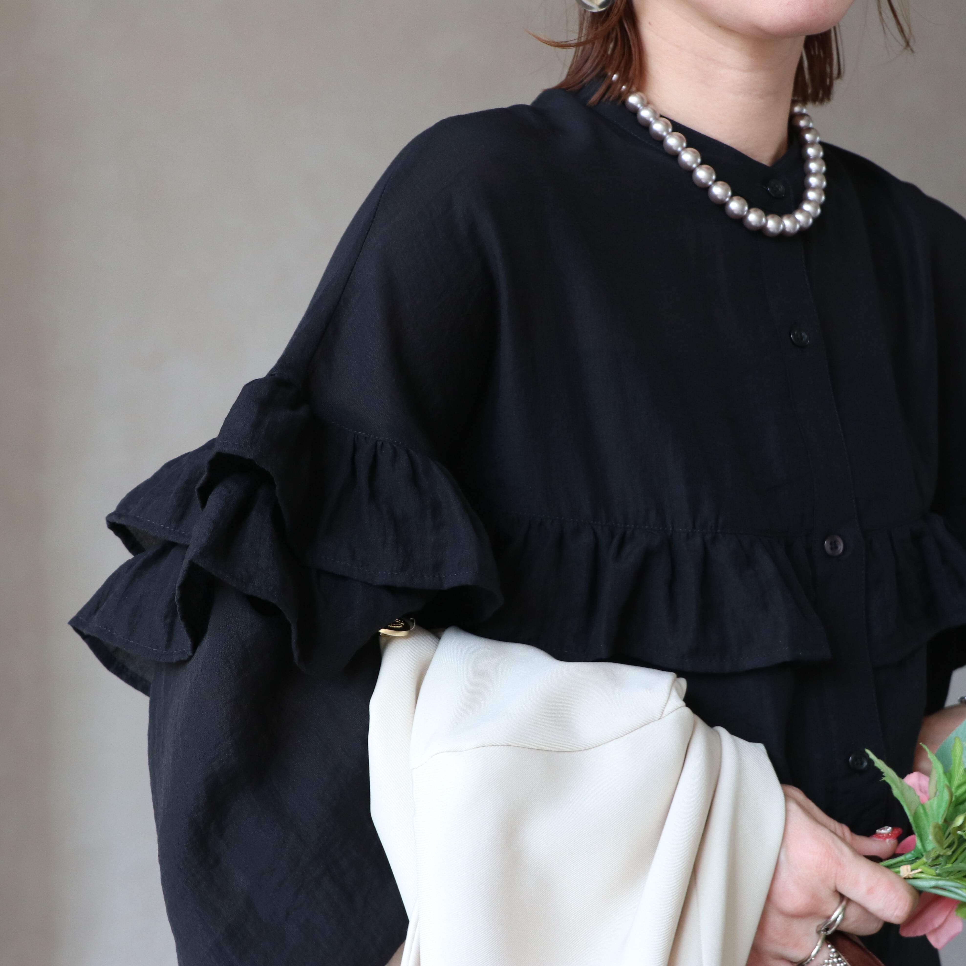 ベストやジャケットに合わせやすいようにスタンドカラーにすることでフロントが美しくフラットに。フォーマル感が出て、よりきちんと感のあるブラウスに仕上げております。