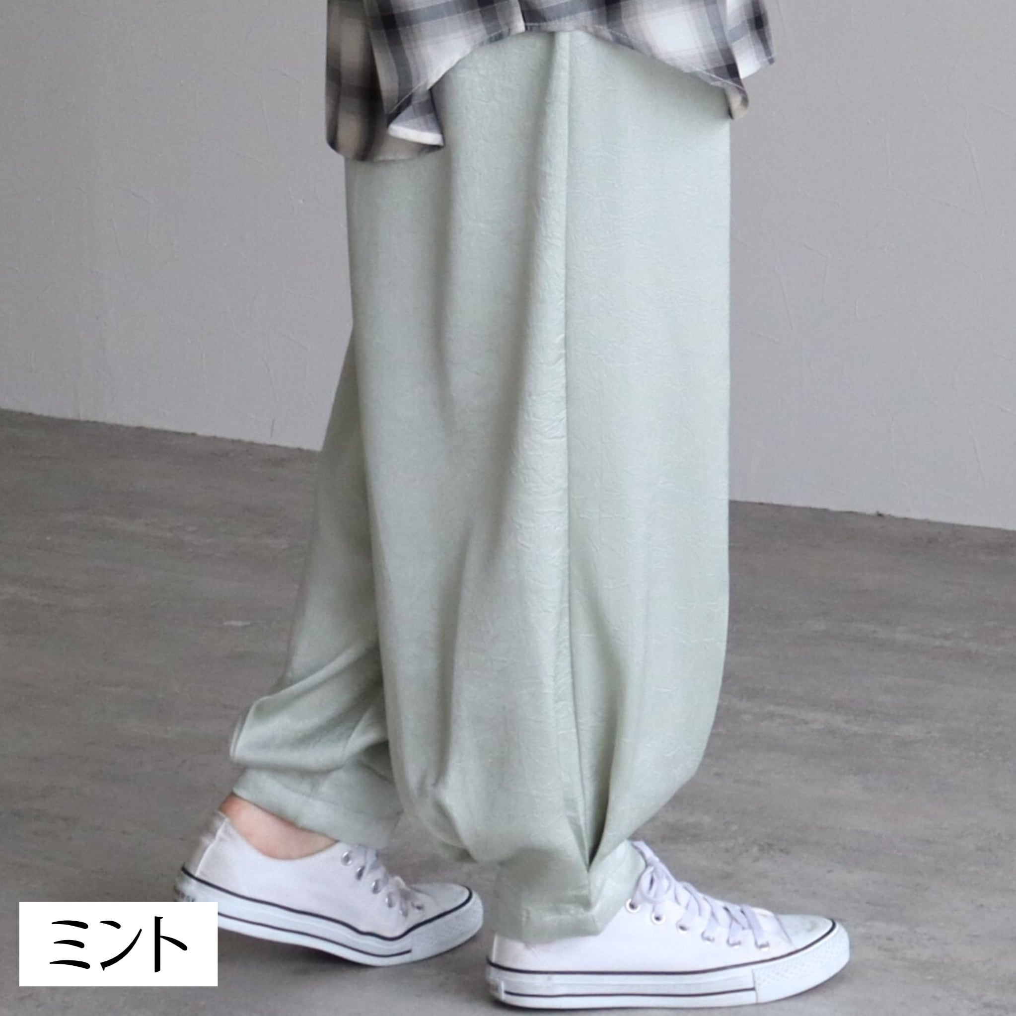 程よくゆとりのあるストレートシルエットで、美脚見えと動きやすさを両立しています。