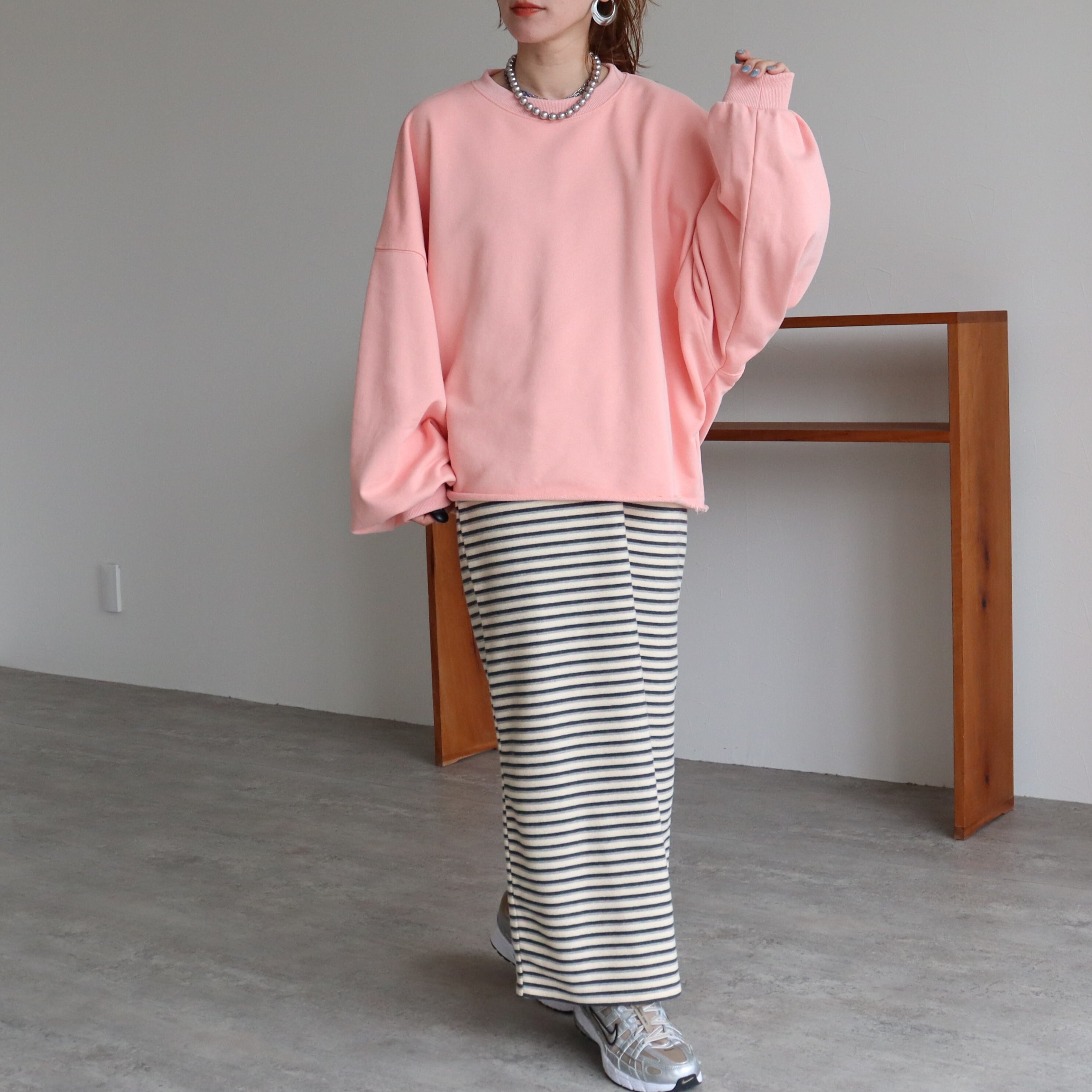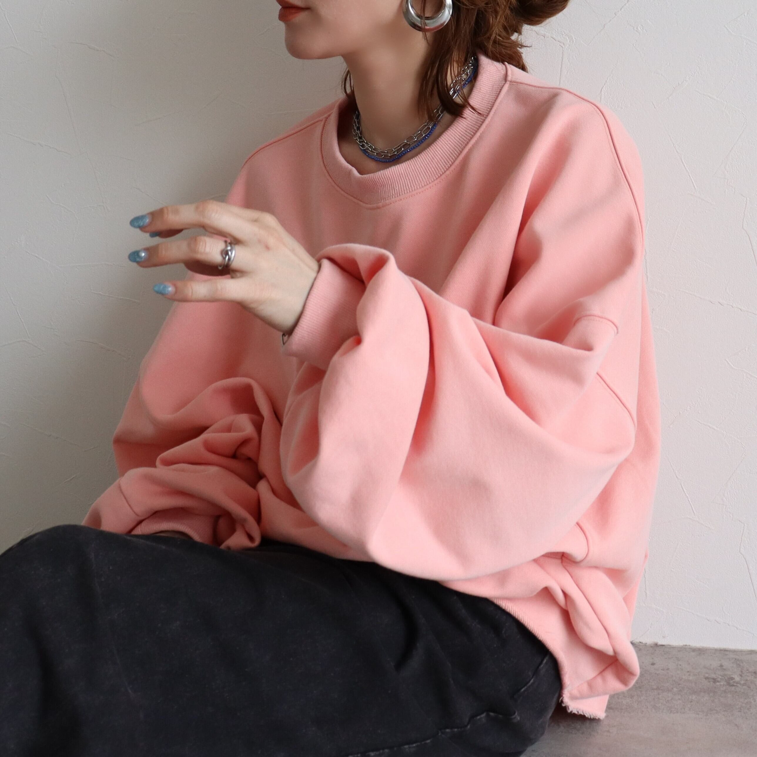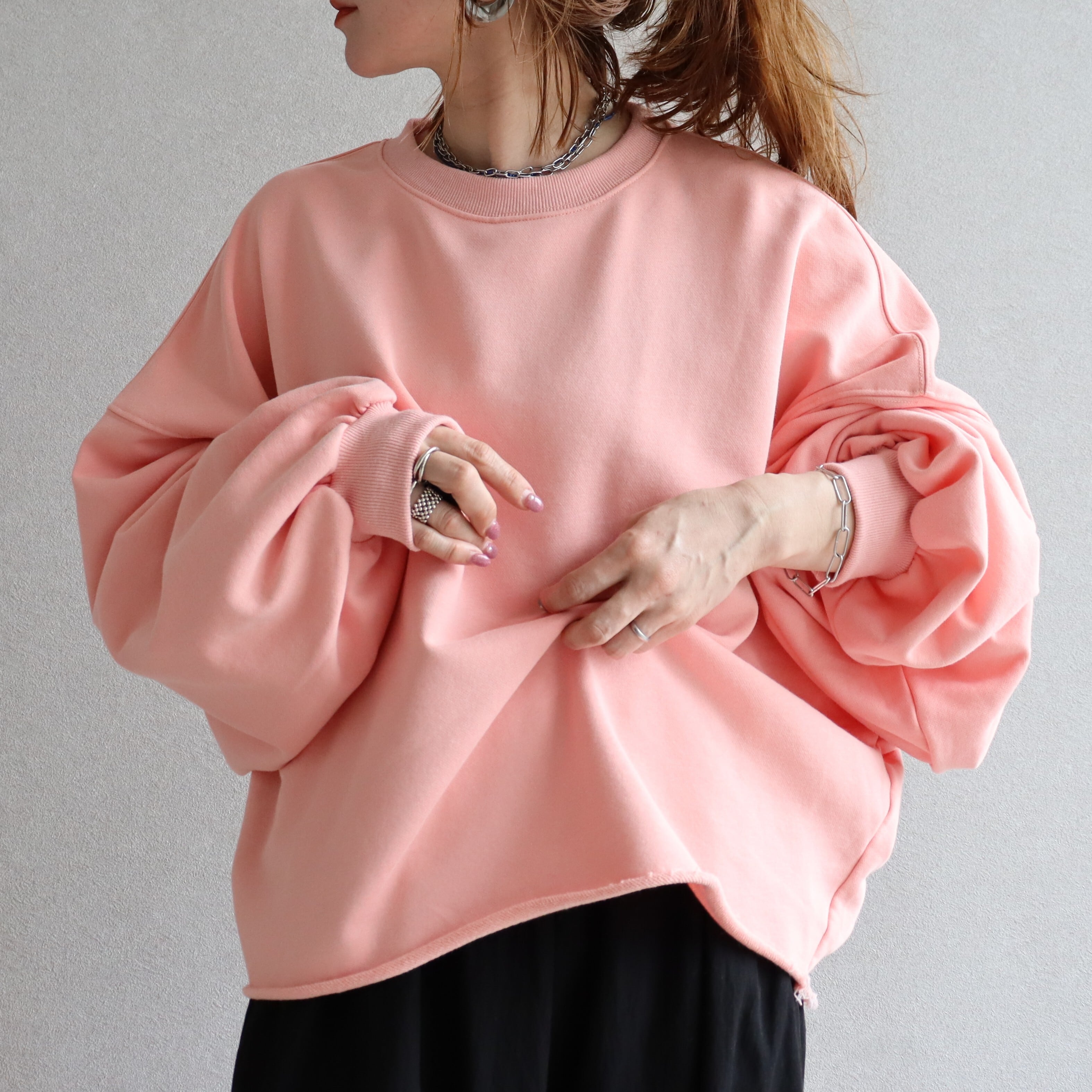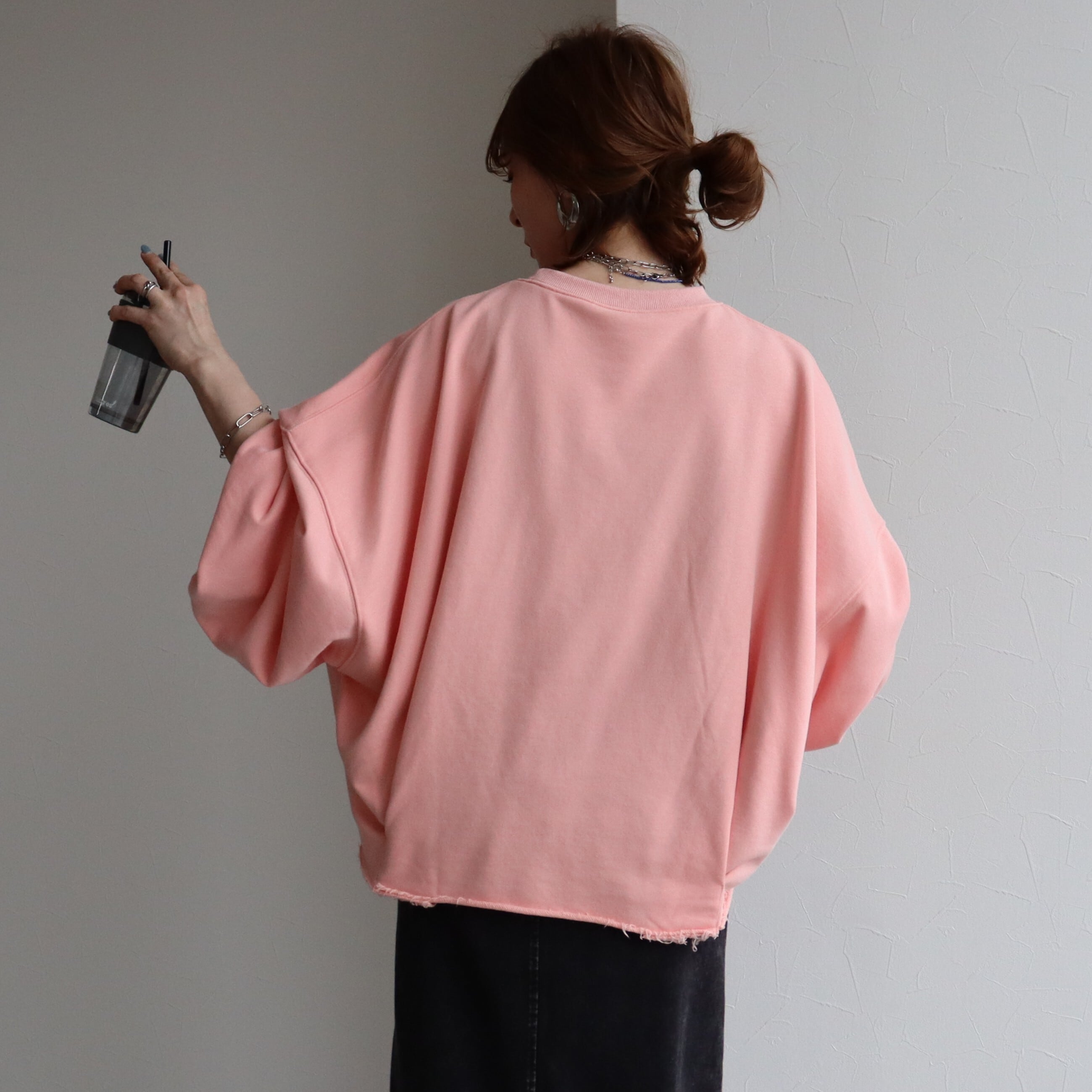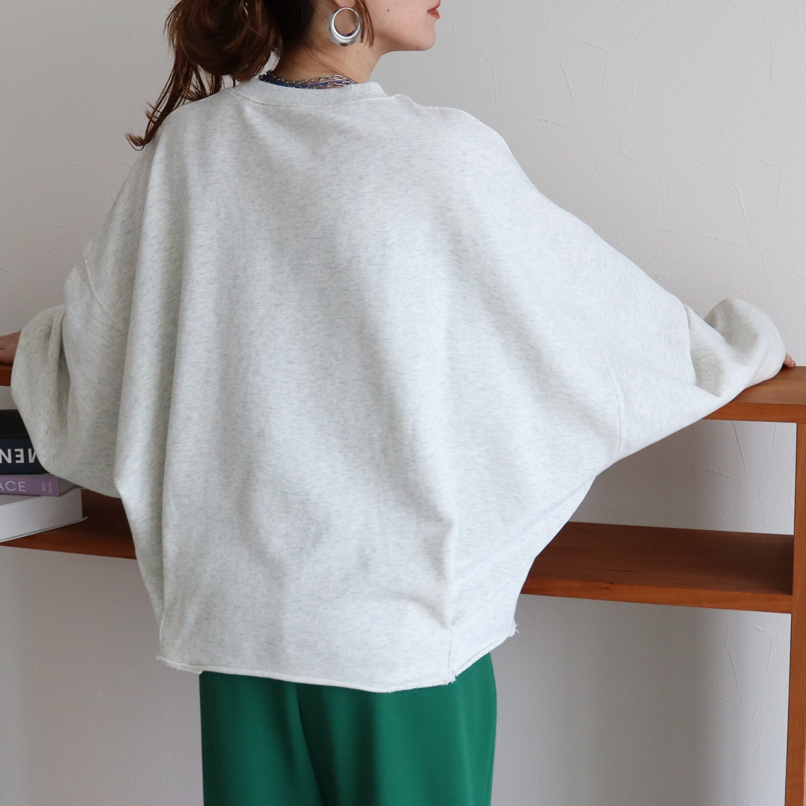 袖丈はたっぷりとした長袖で、丈感はヒップトップにかかる長さで、体型カバーにも効果的です。素材は綿混の裏毛スウェットでこれからの時期に嬉しい、ロンTとスウェットの中間のような厚みです!しっかりした軽やかさのバランスが魅力。