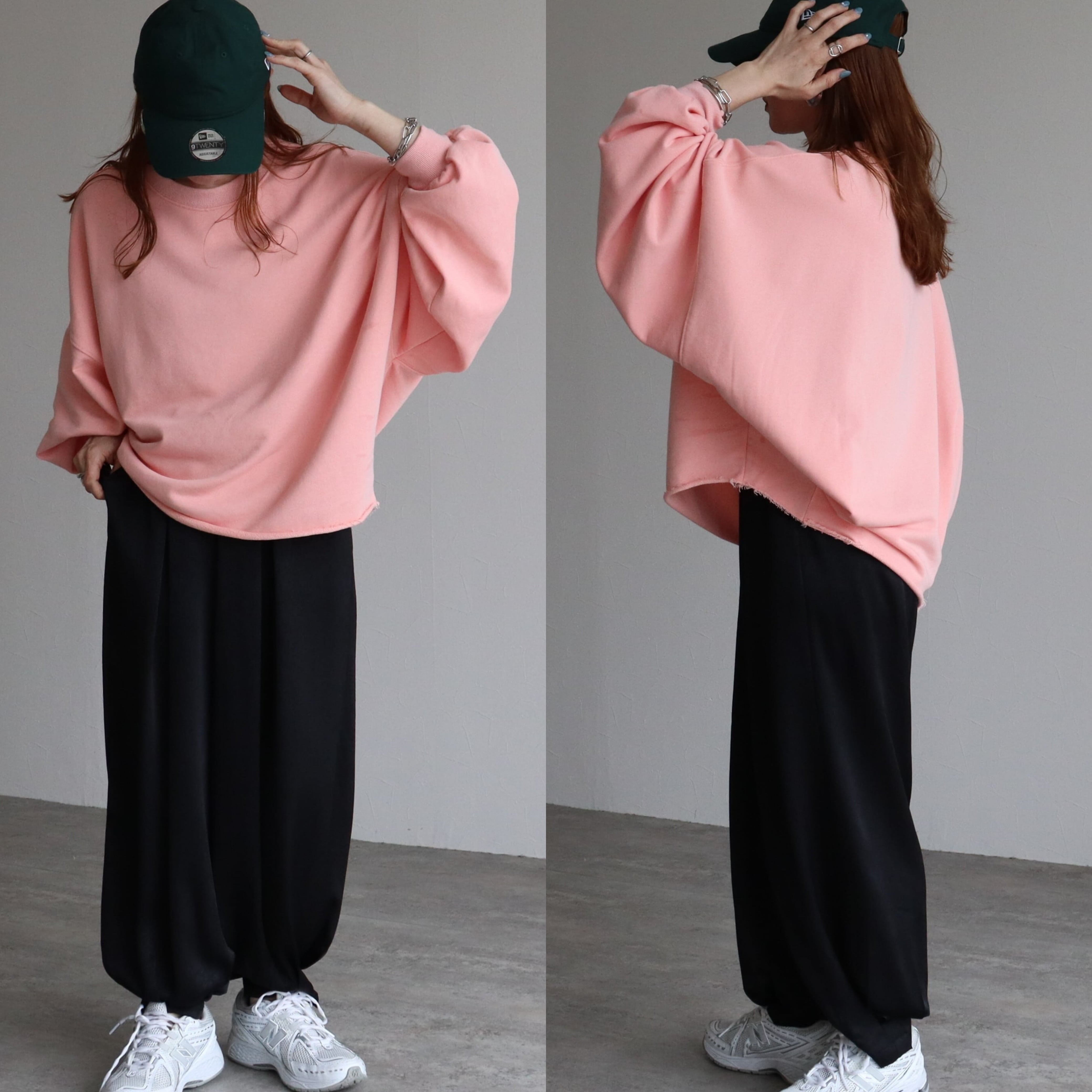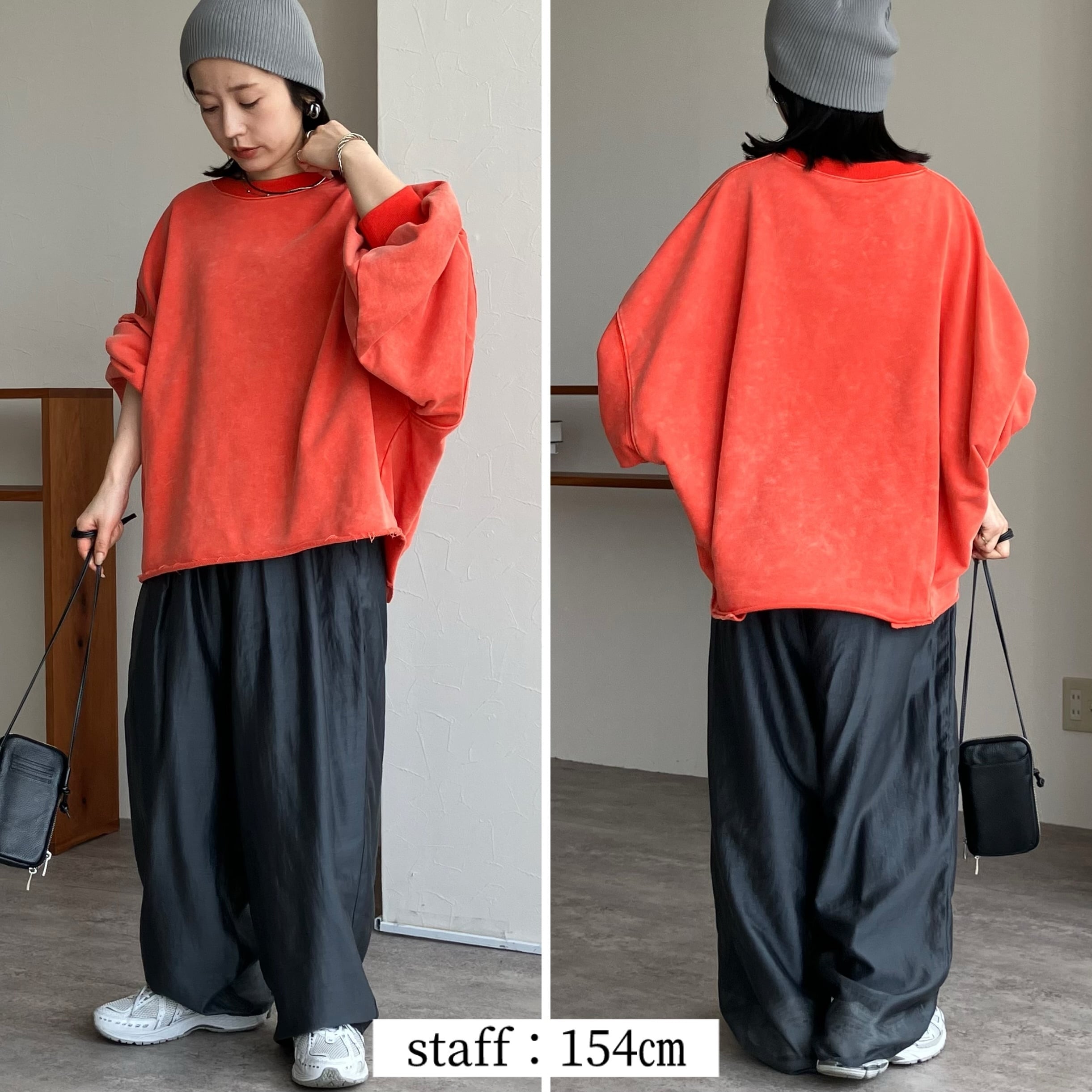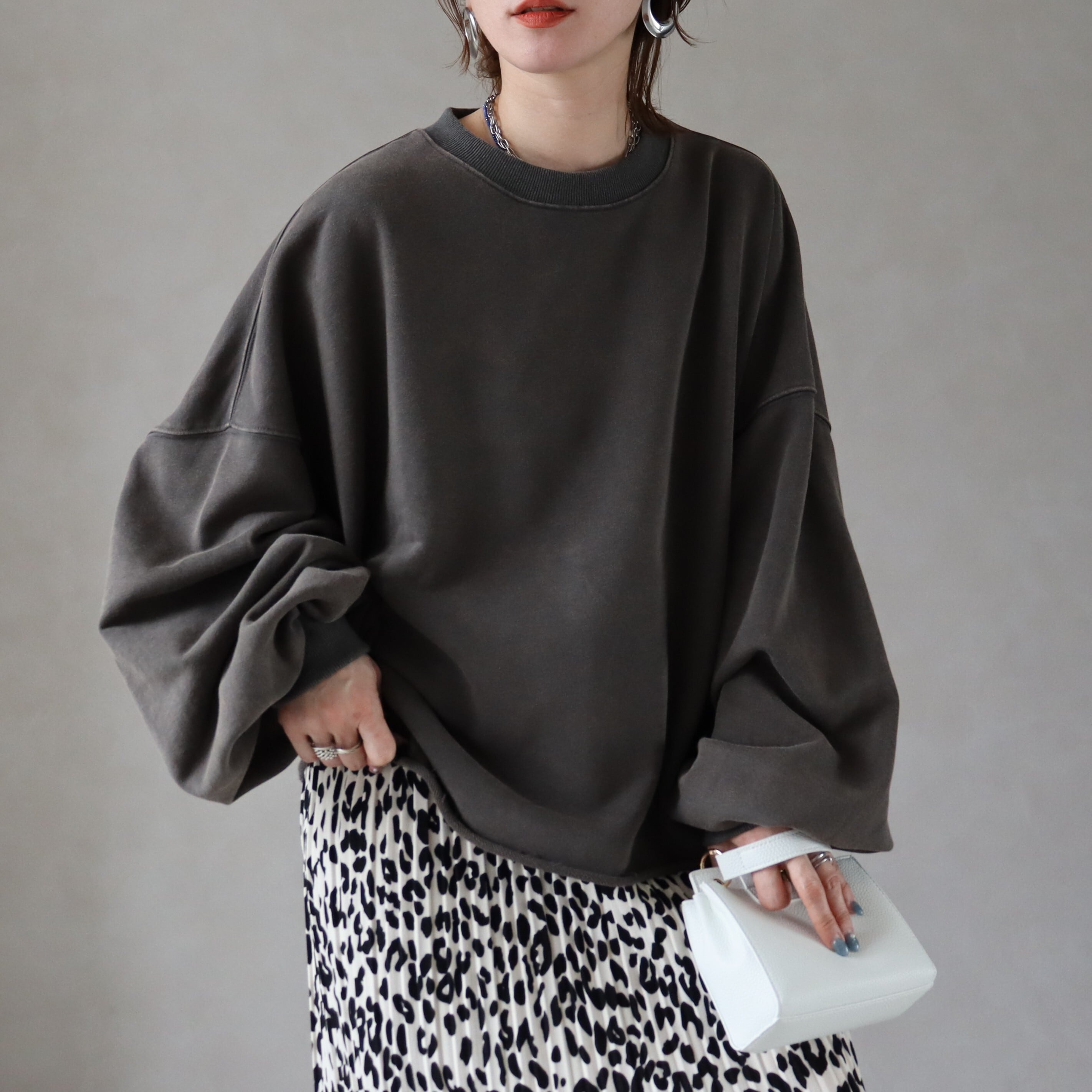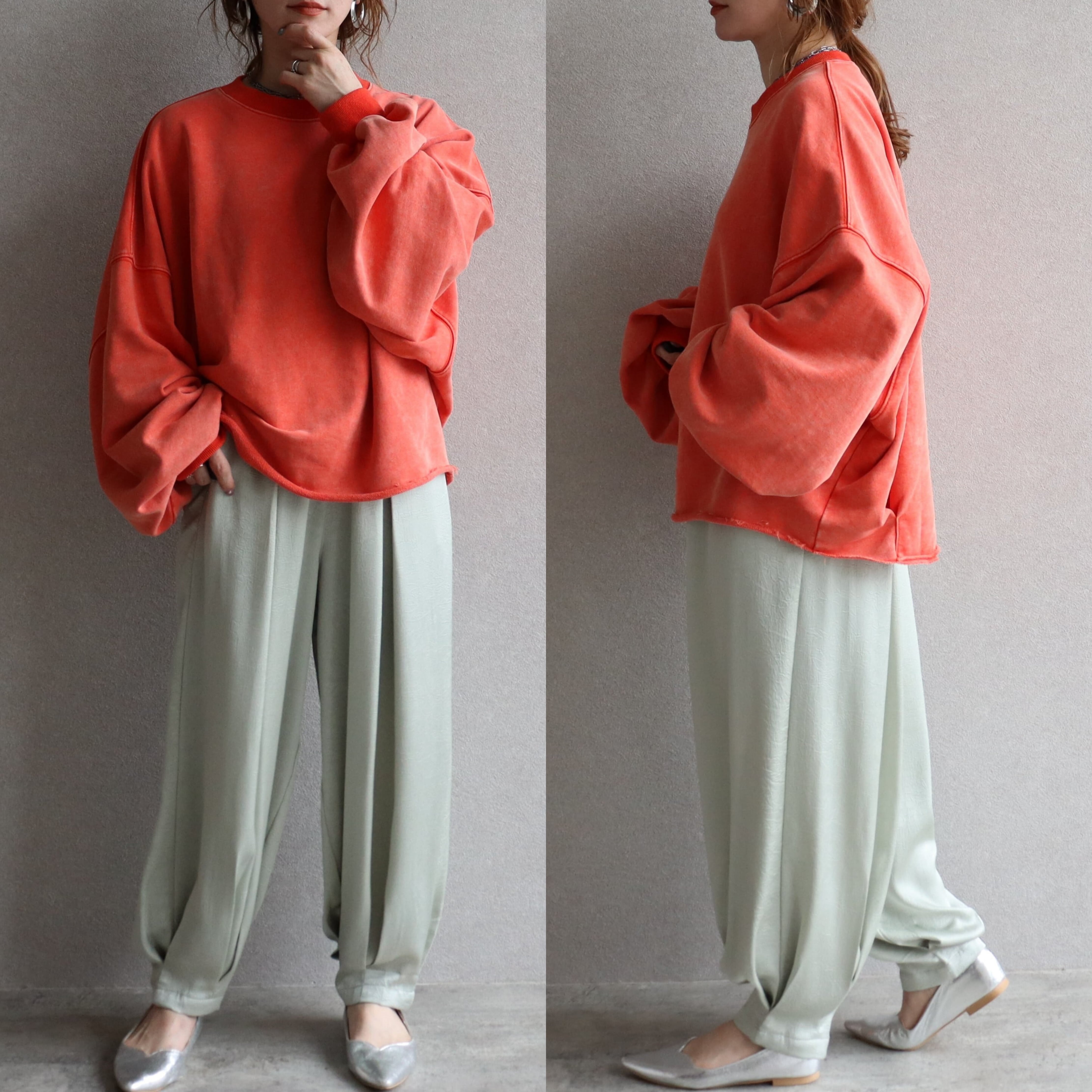 袖丈はたっぷりとした長袖で、丈感はヒップトップにかかる長さで、体型カバーにも効果的です。素材は綿混の裏毛スウェットでこれからの時期に嬉しい、ロンTとスウェットの中間のような厚みです!しっかりした軽やかさのバランスが魅力。