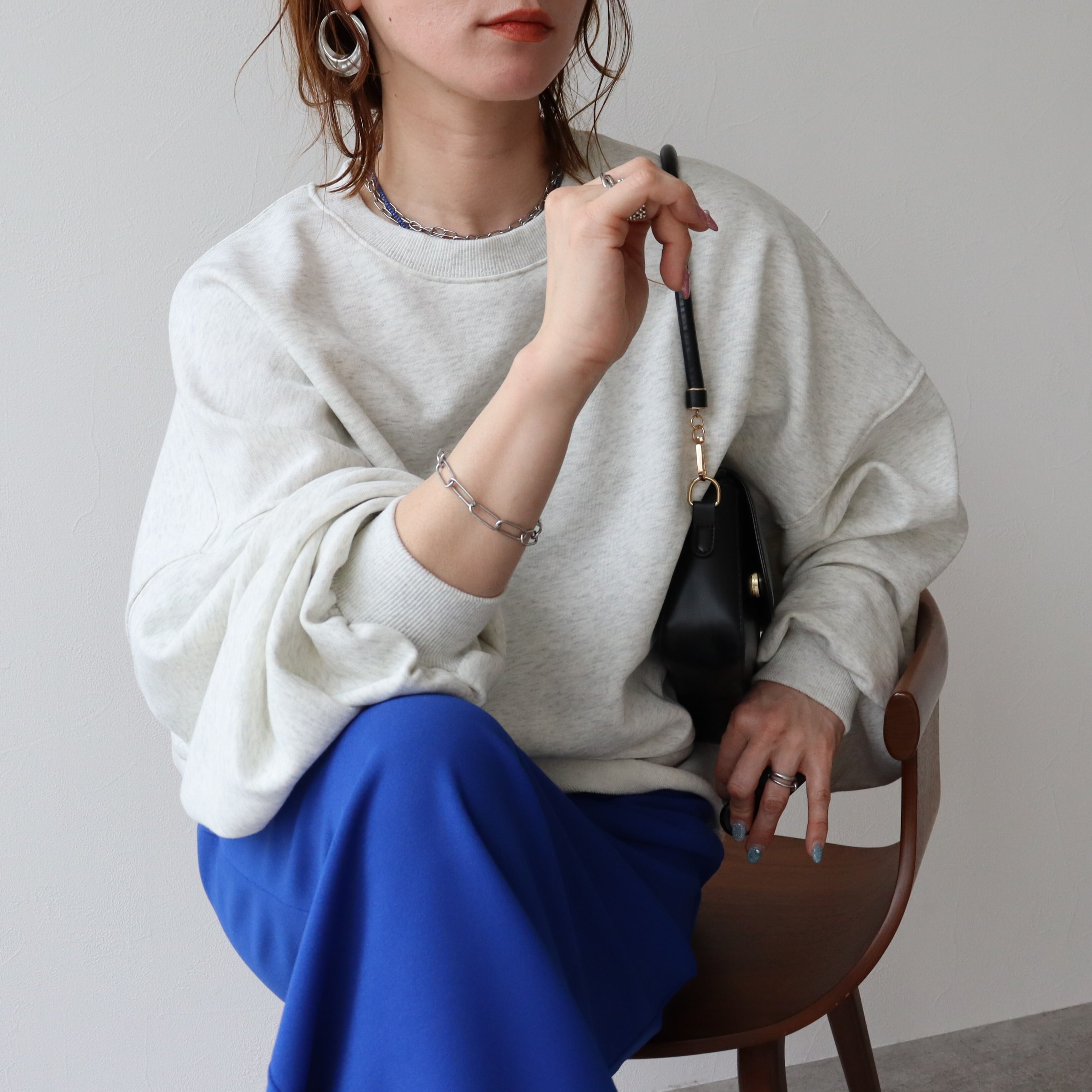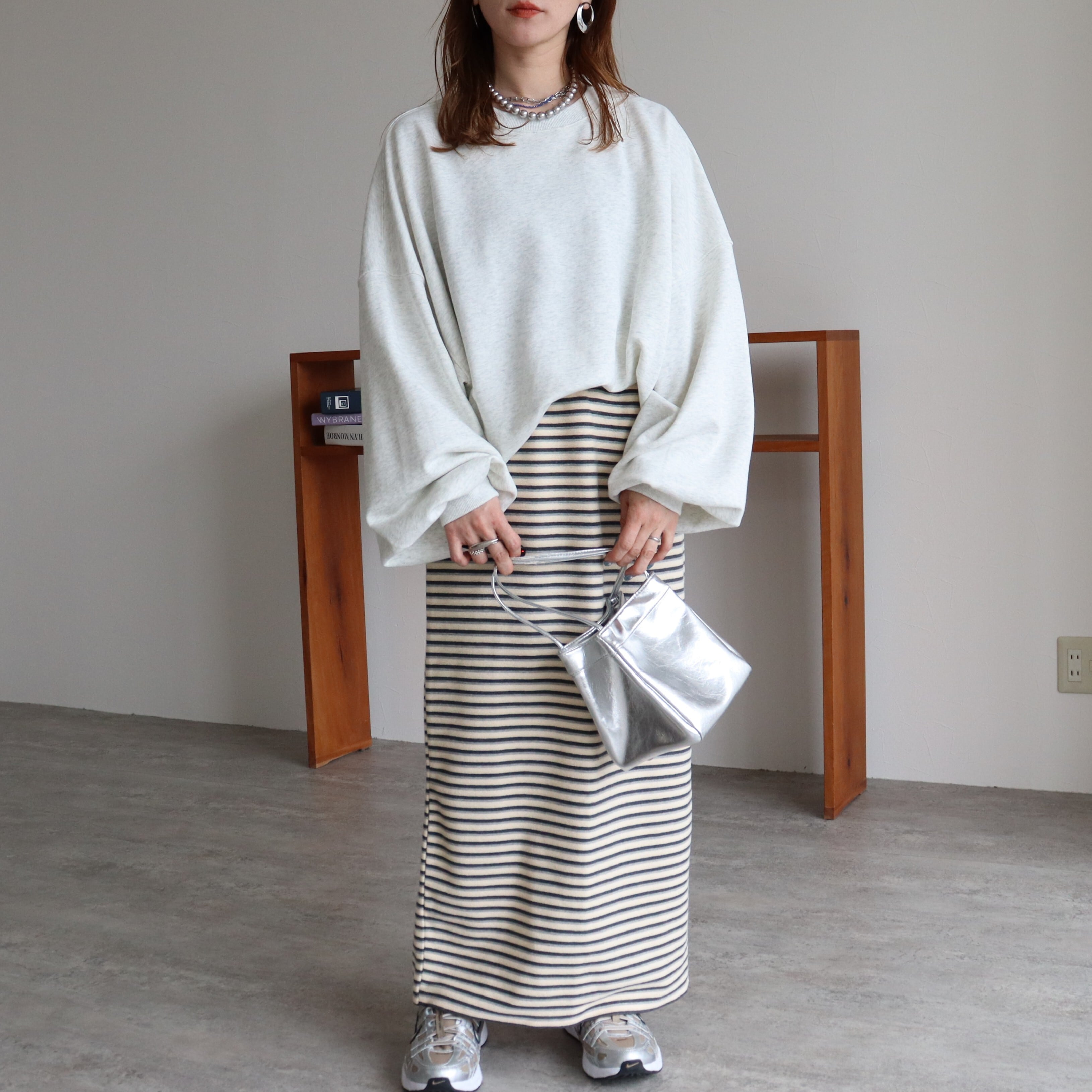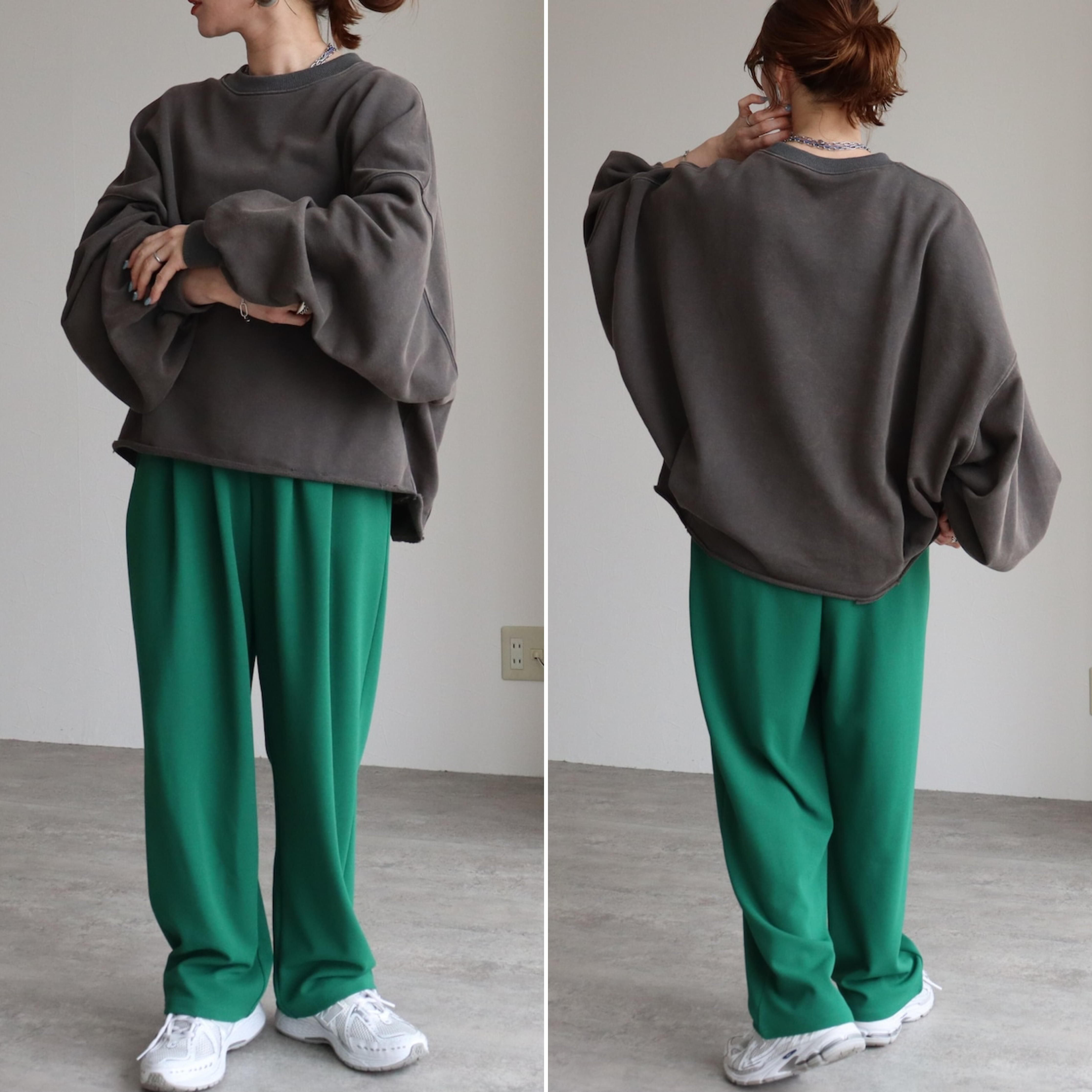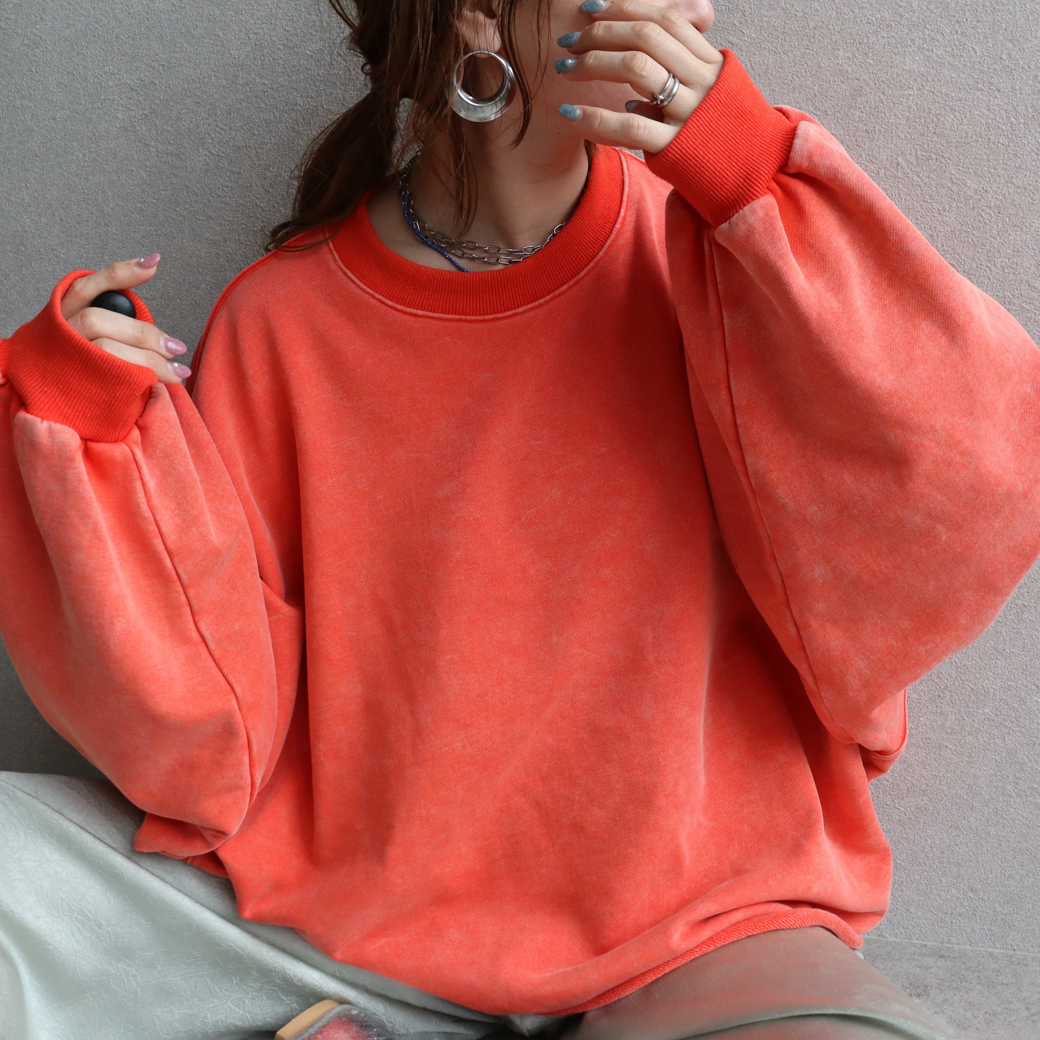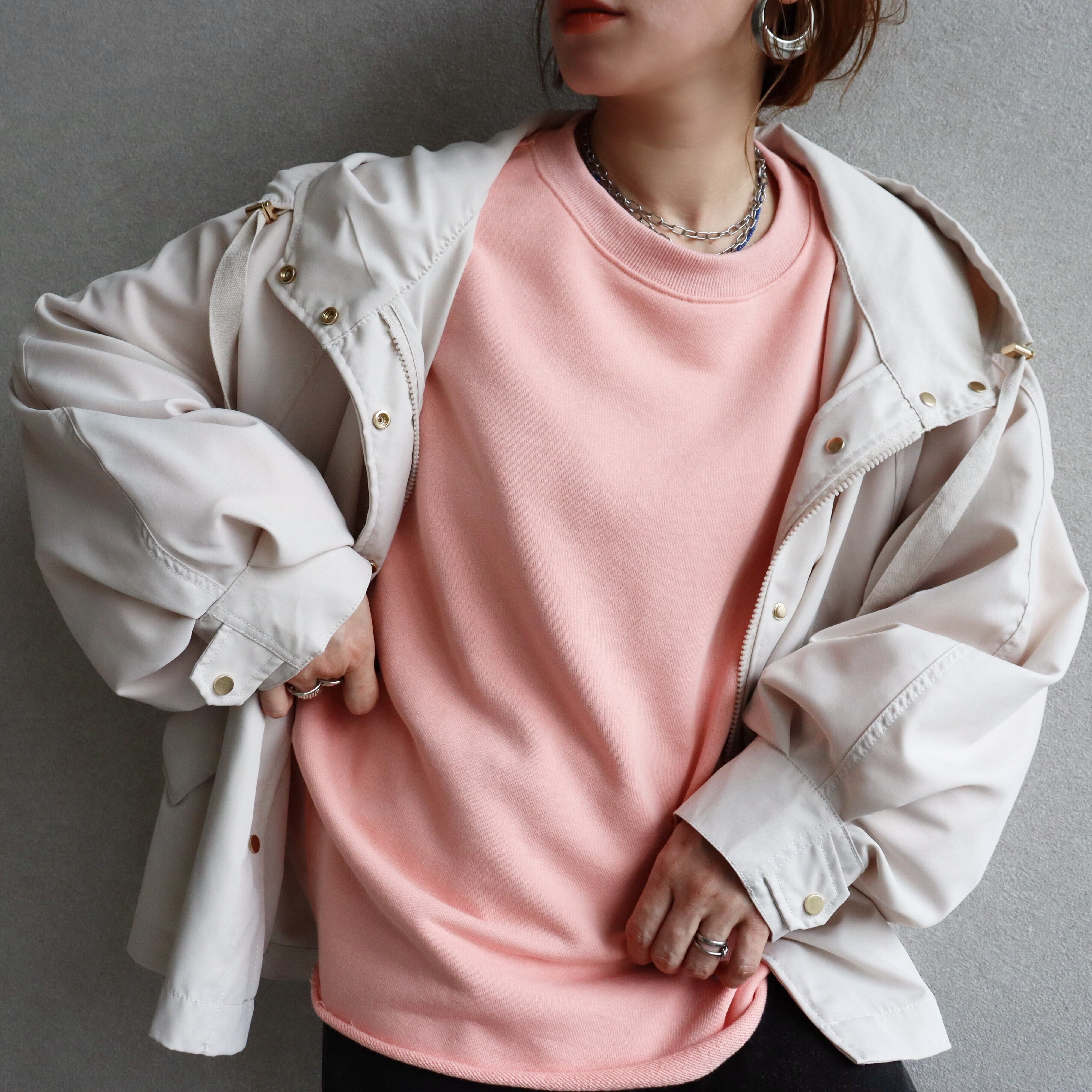 袖丈はたっぷりとした長袖で、丈感はヒップトップにかかる長さで、体型カバーにも効果的です。素材は綿混の裏毛スウェットでこれからの時期に嬉しい、ロンTとスウェットの中間のような厚みです!しっかりした軽やかさのバランスが魅力。