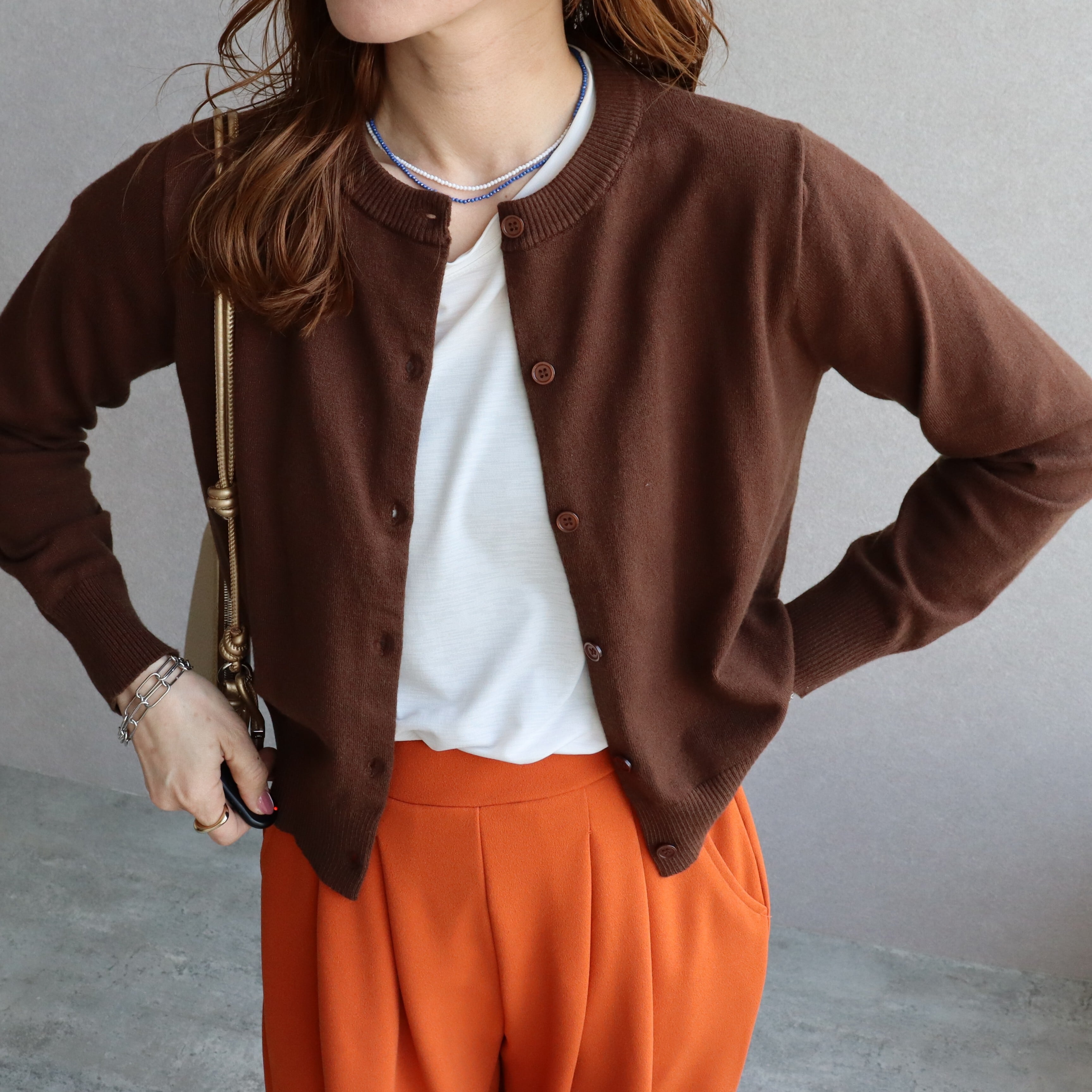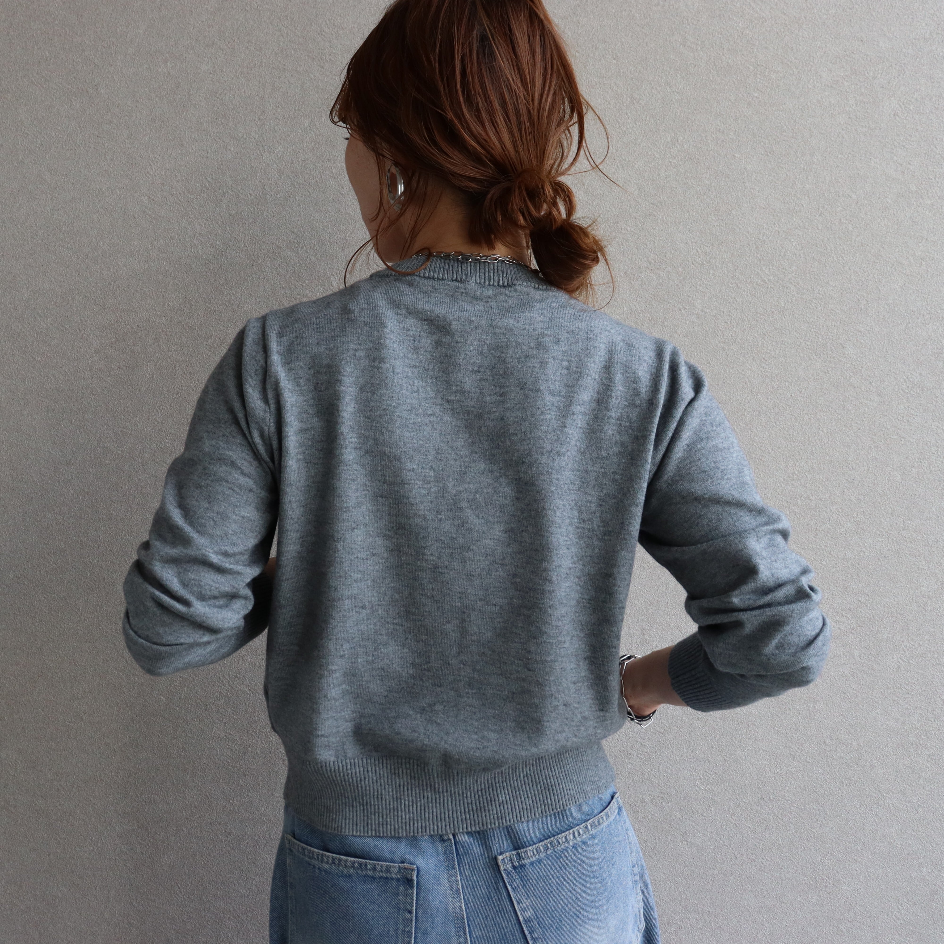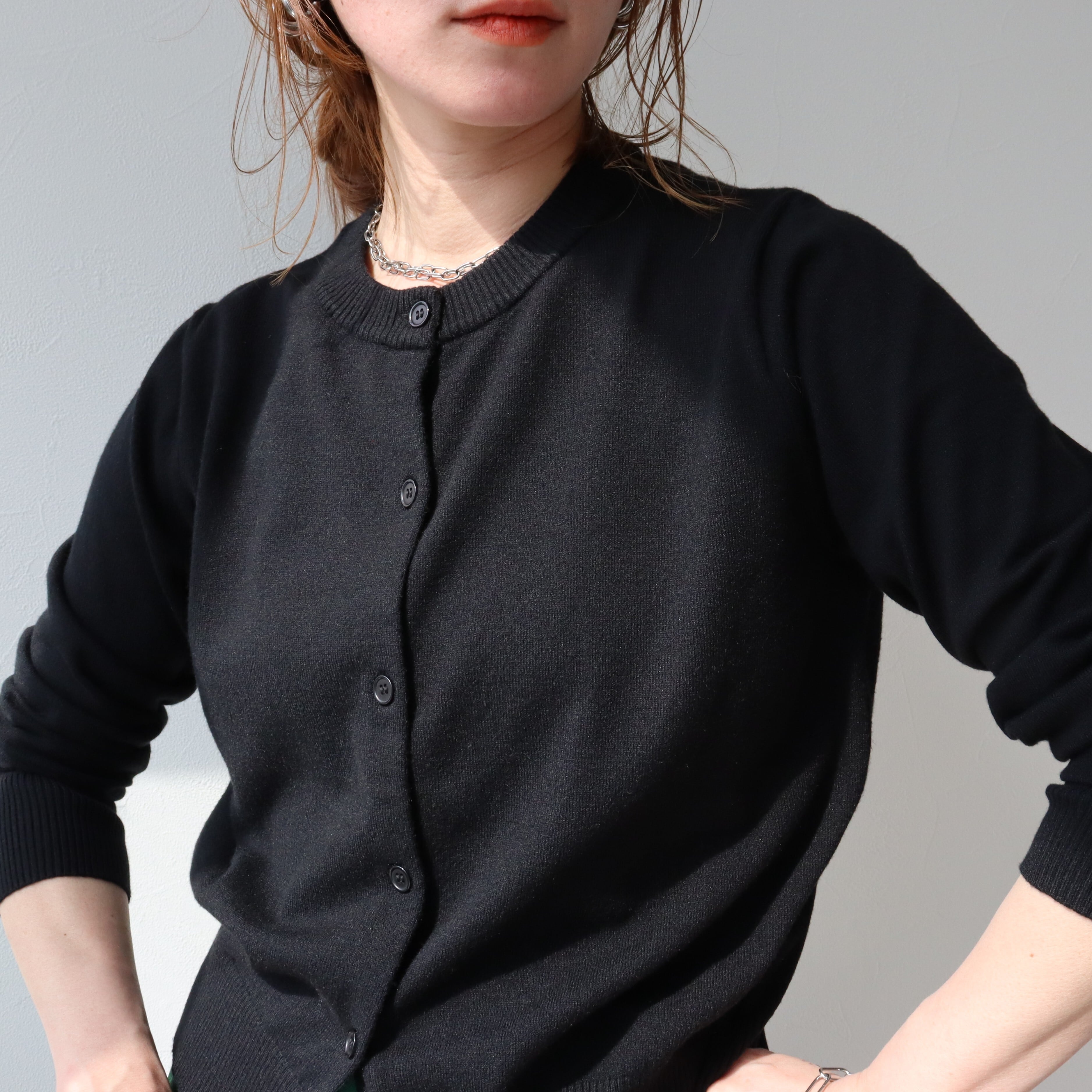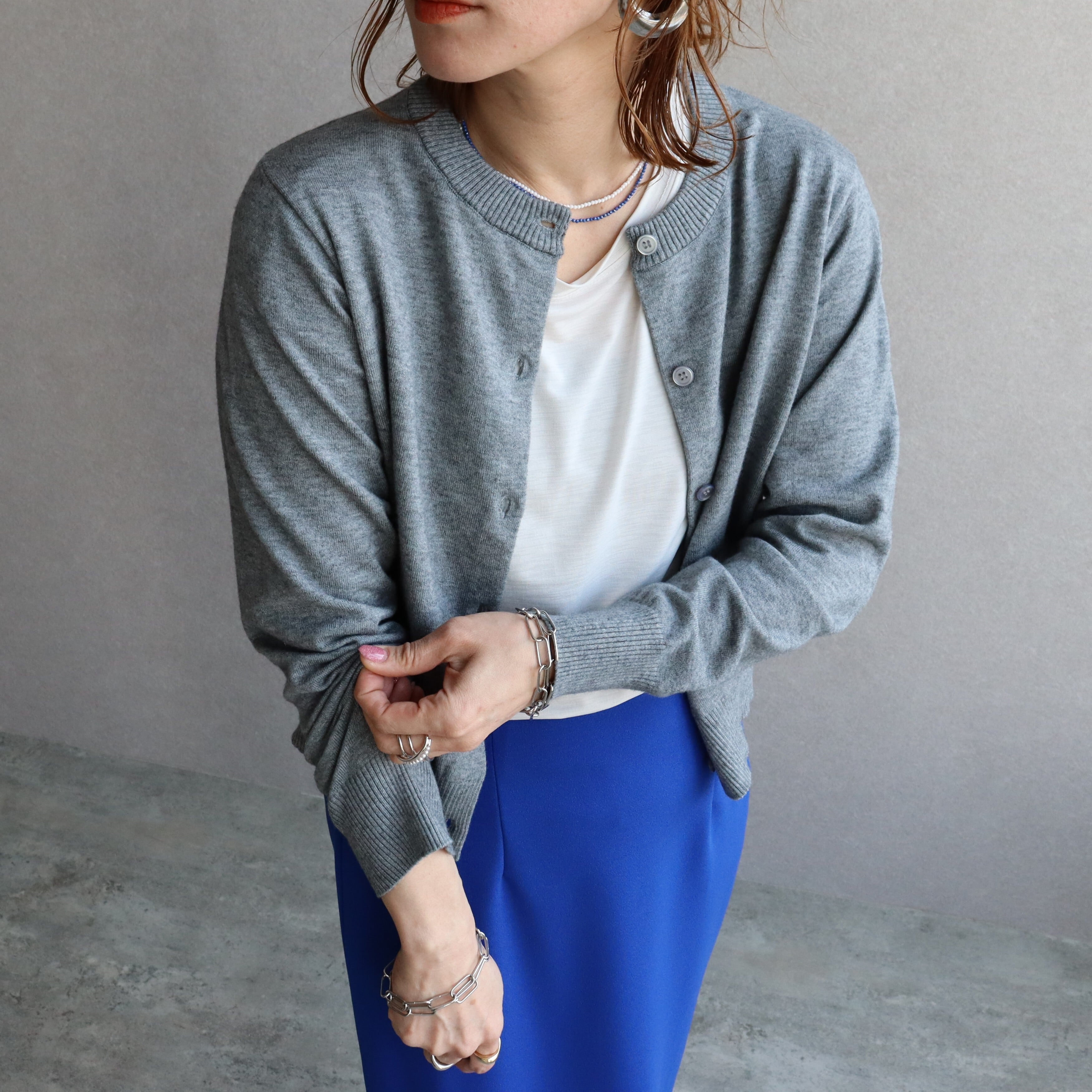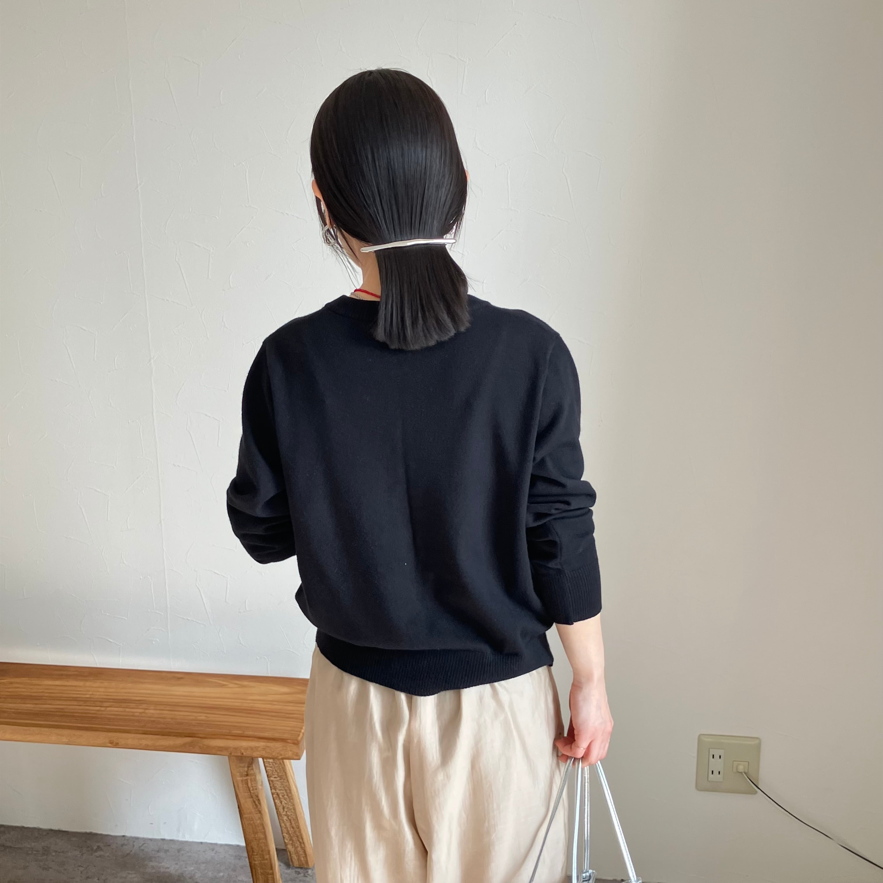 クルーネック×同色ボタンの控えめなデザインで、どんなコーデにも馴染む。