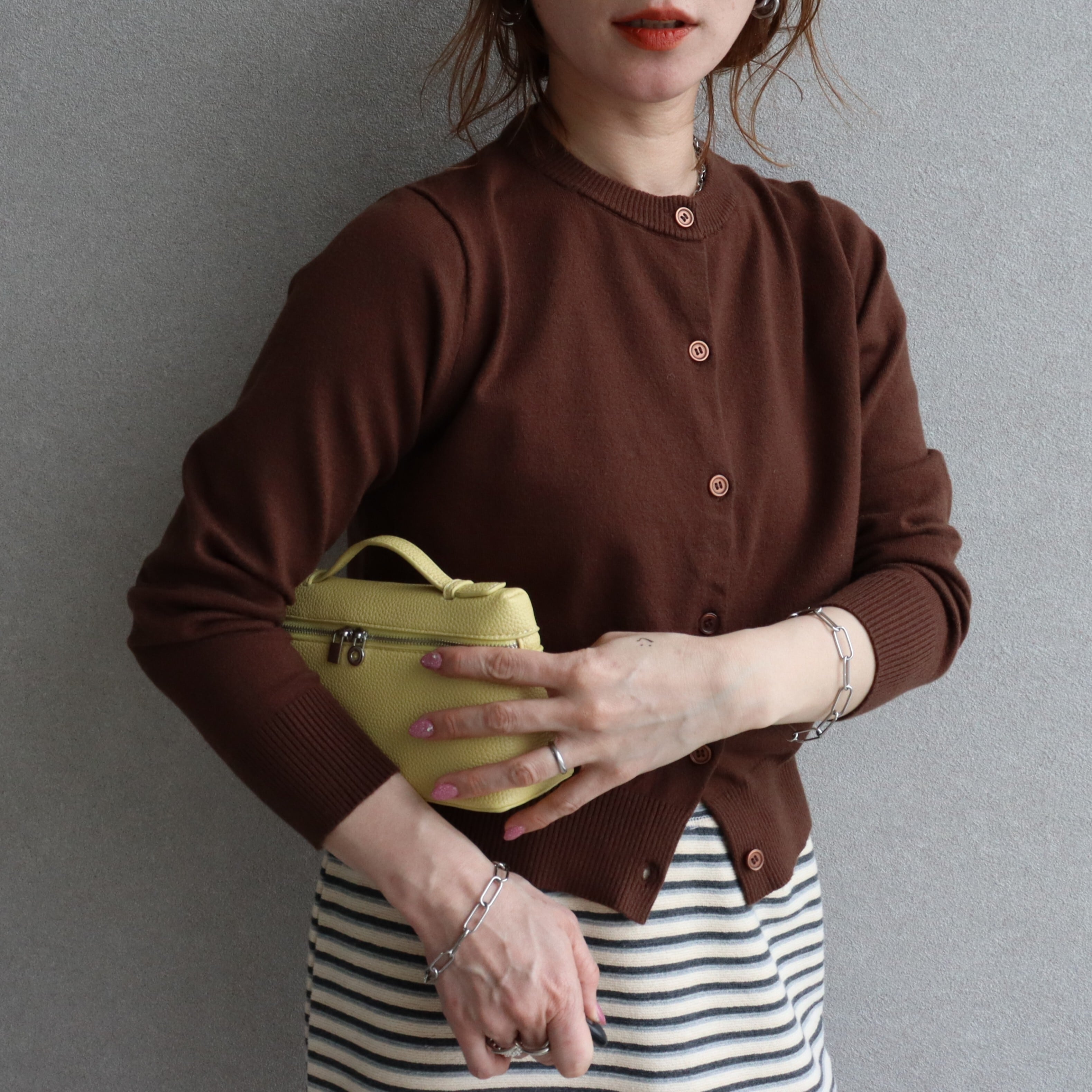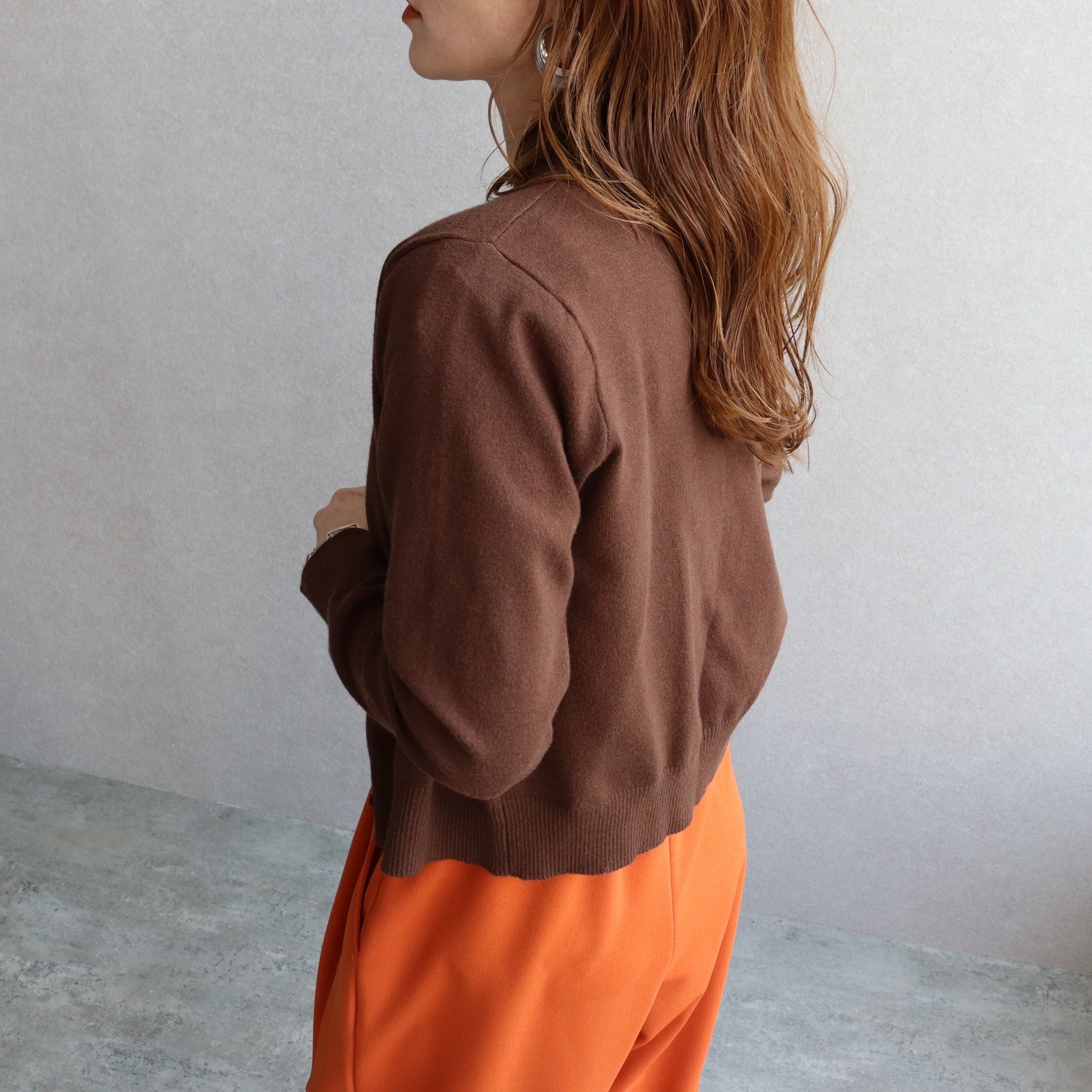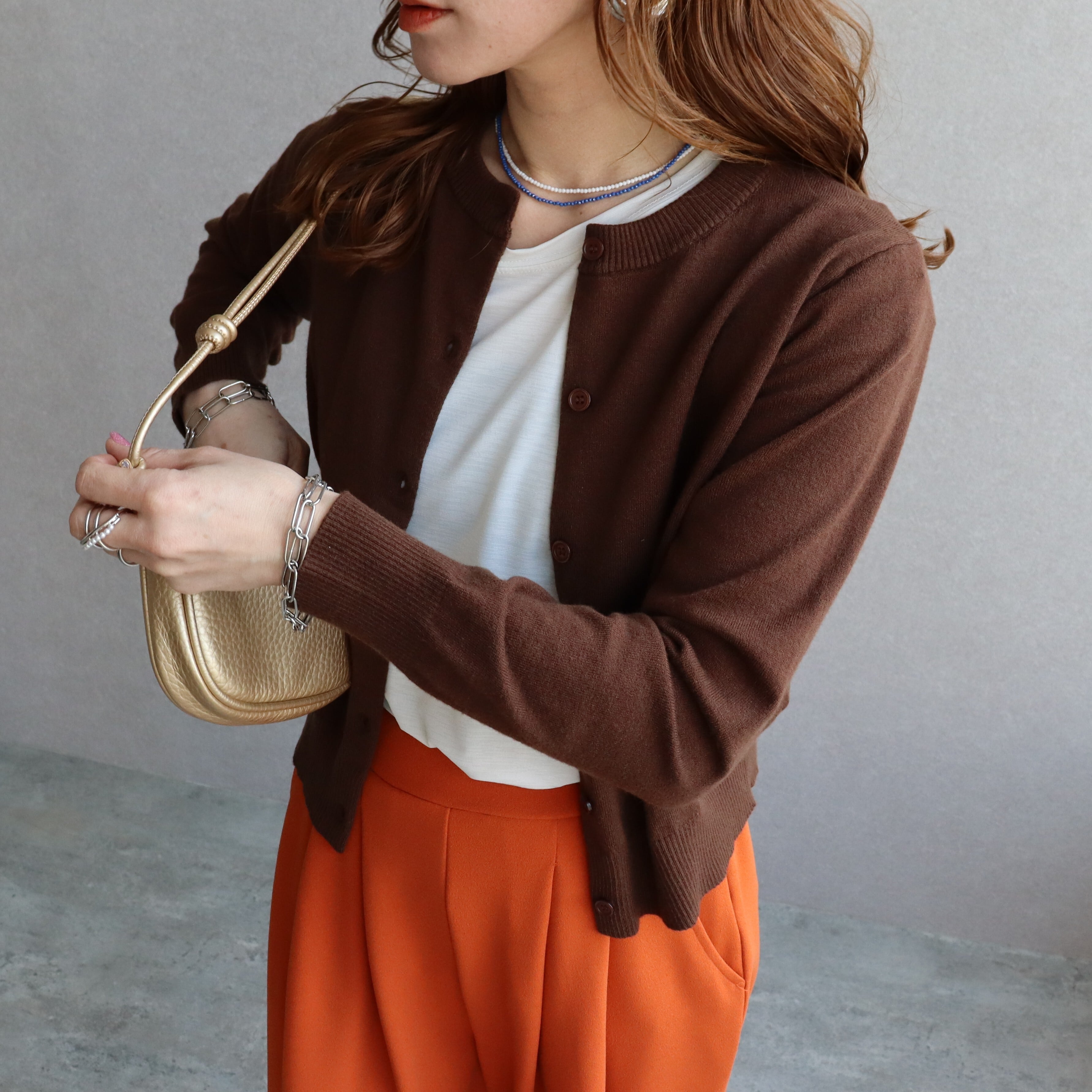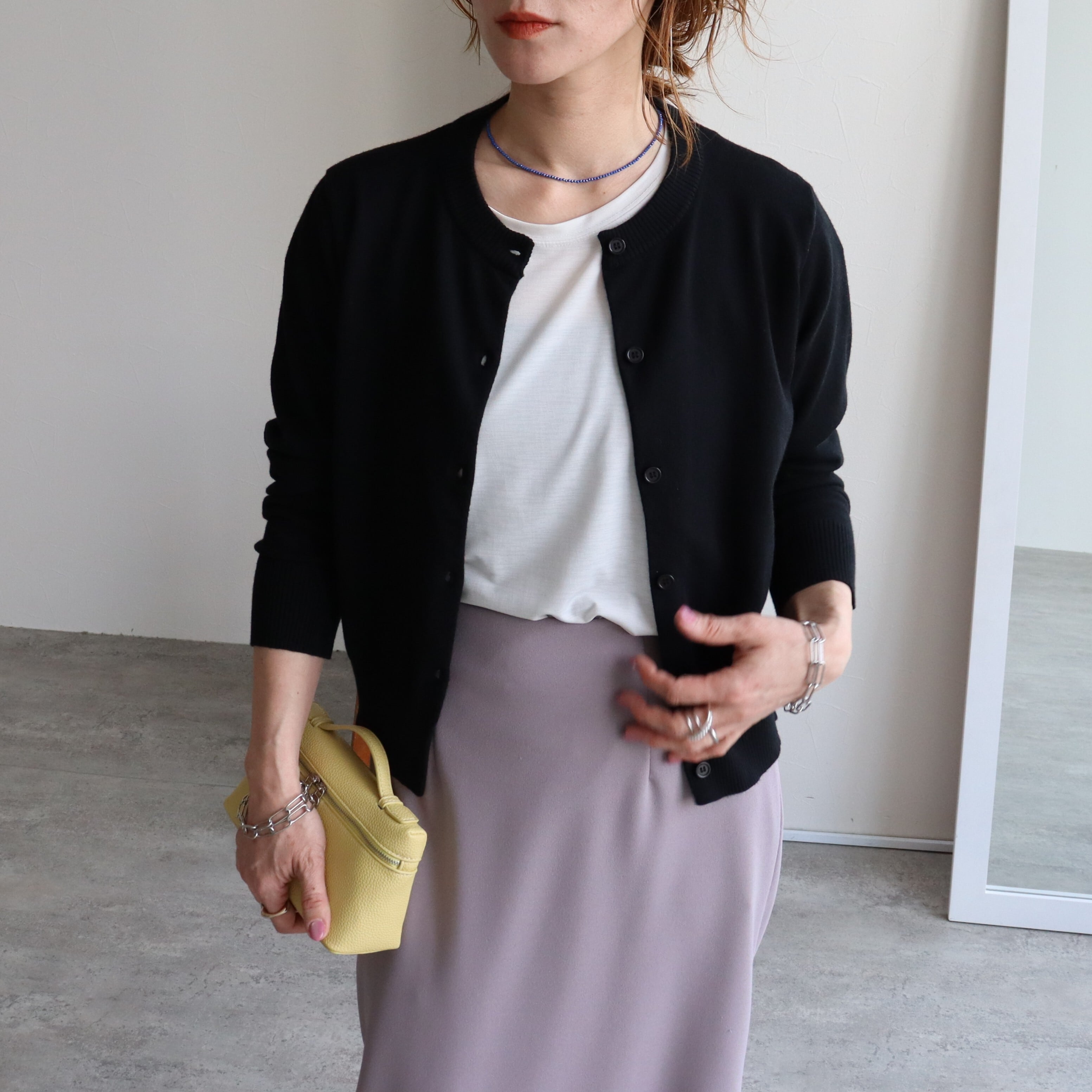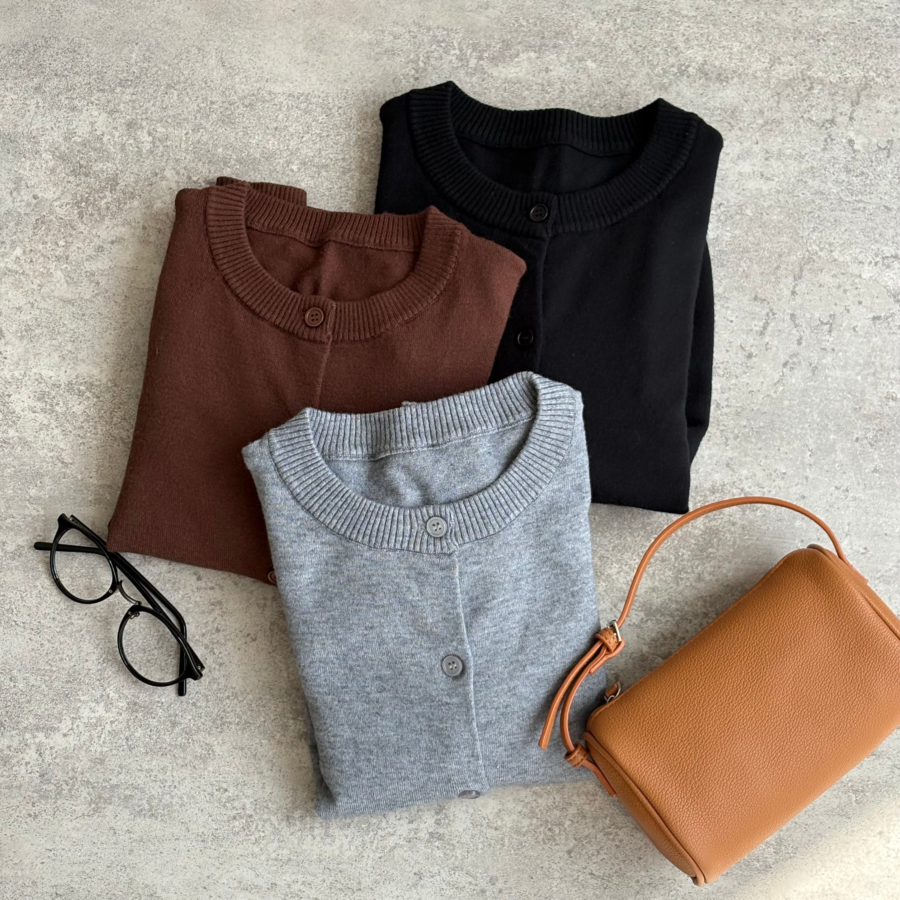 クルーネック×同色ボタンの控えめなデザインで、どんなコーデにも馴染む。
