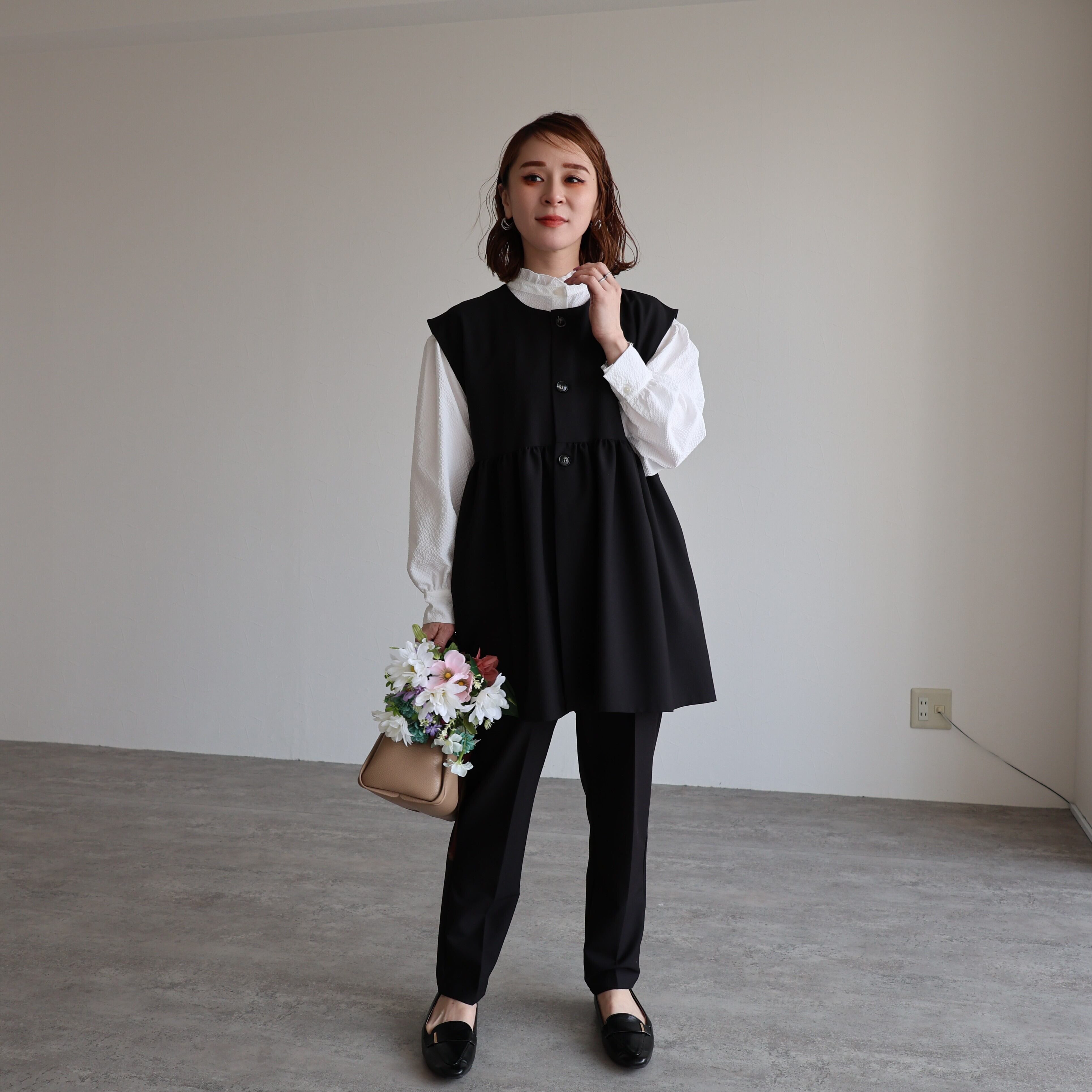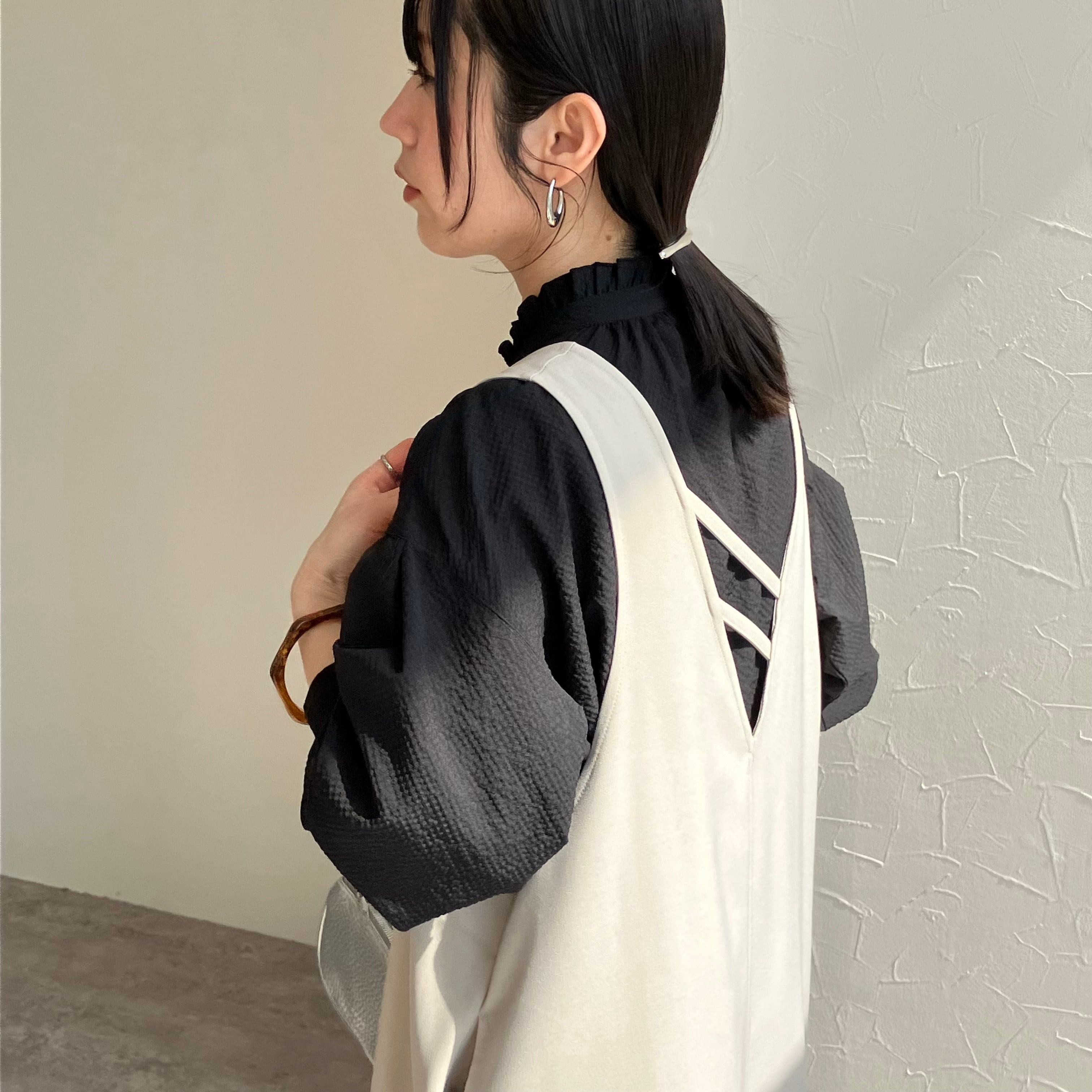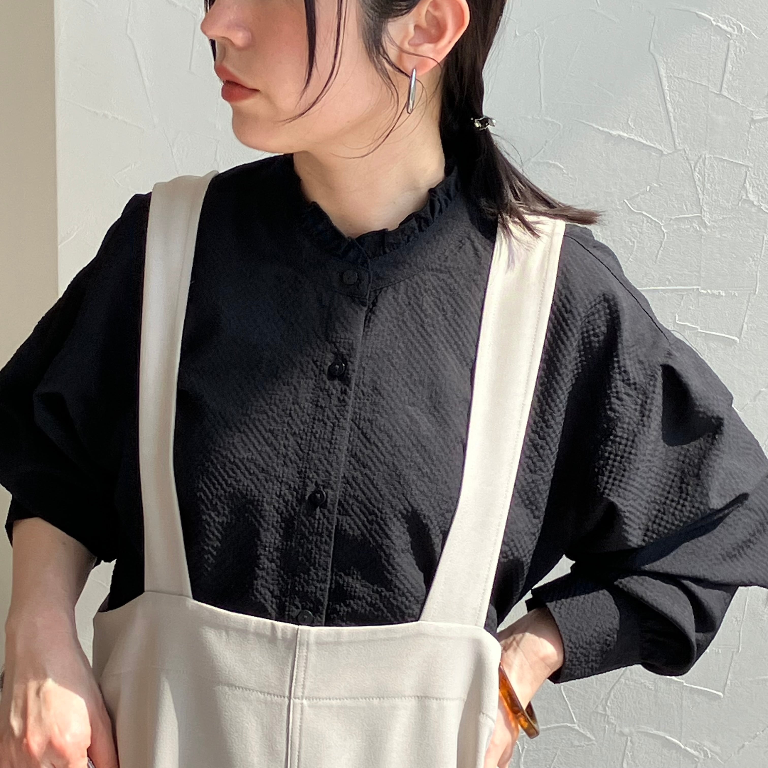 襟のフリルを活かして、ニットやスウェットとのレイヤードのアクセントに◎