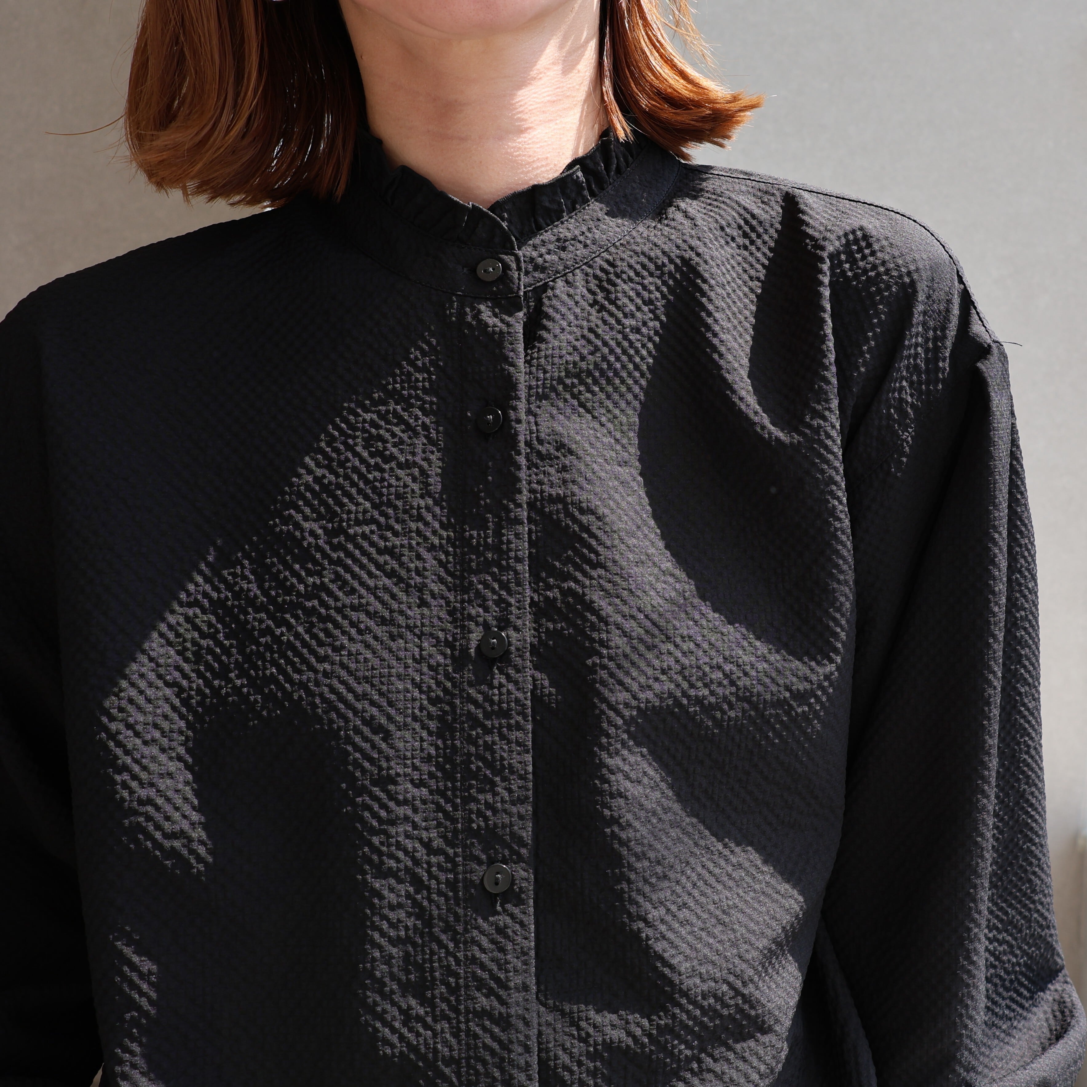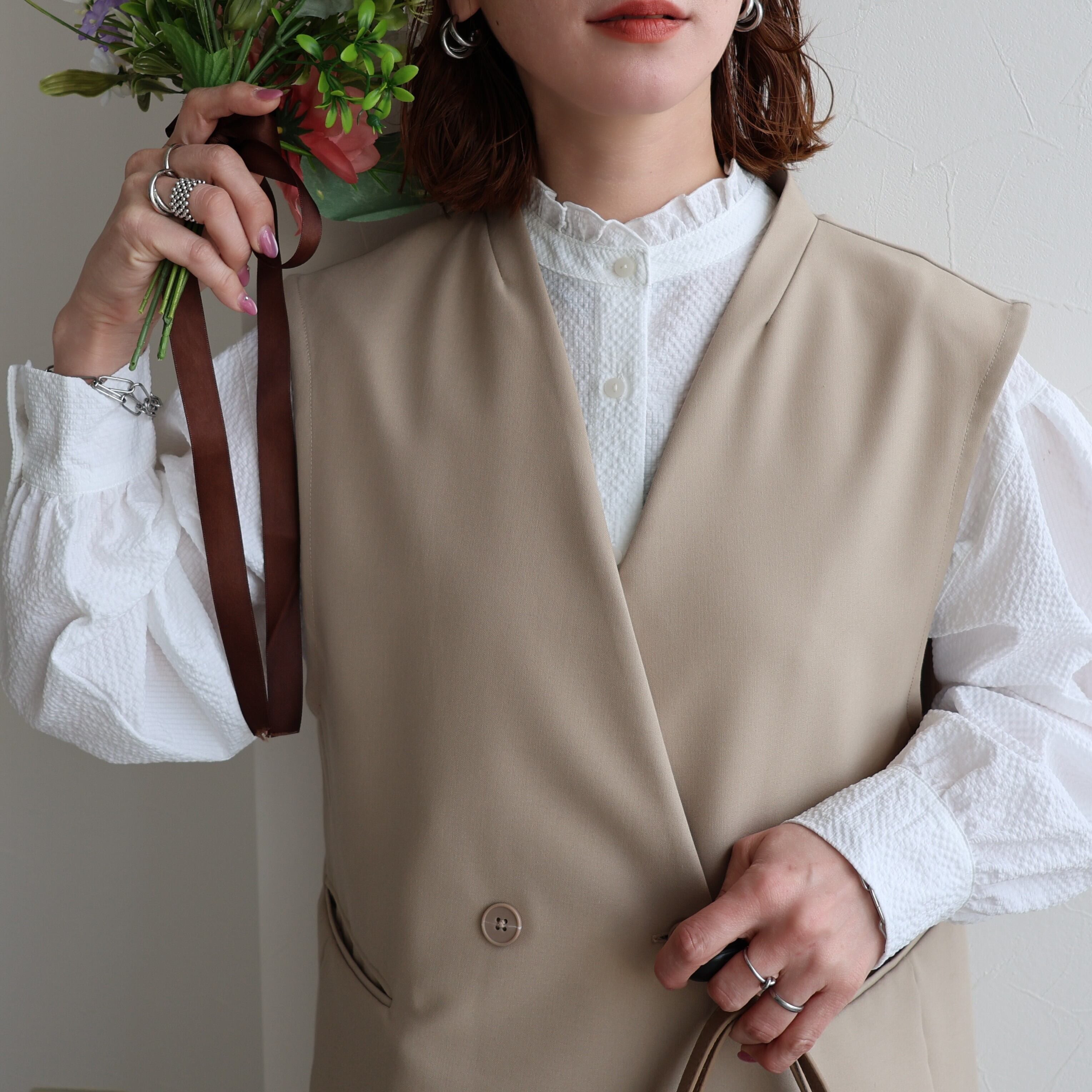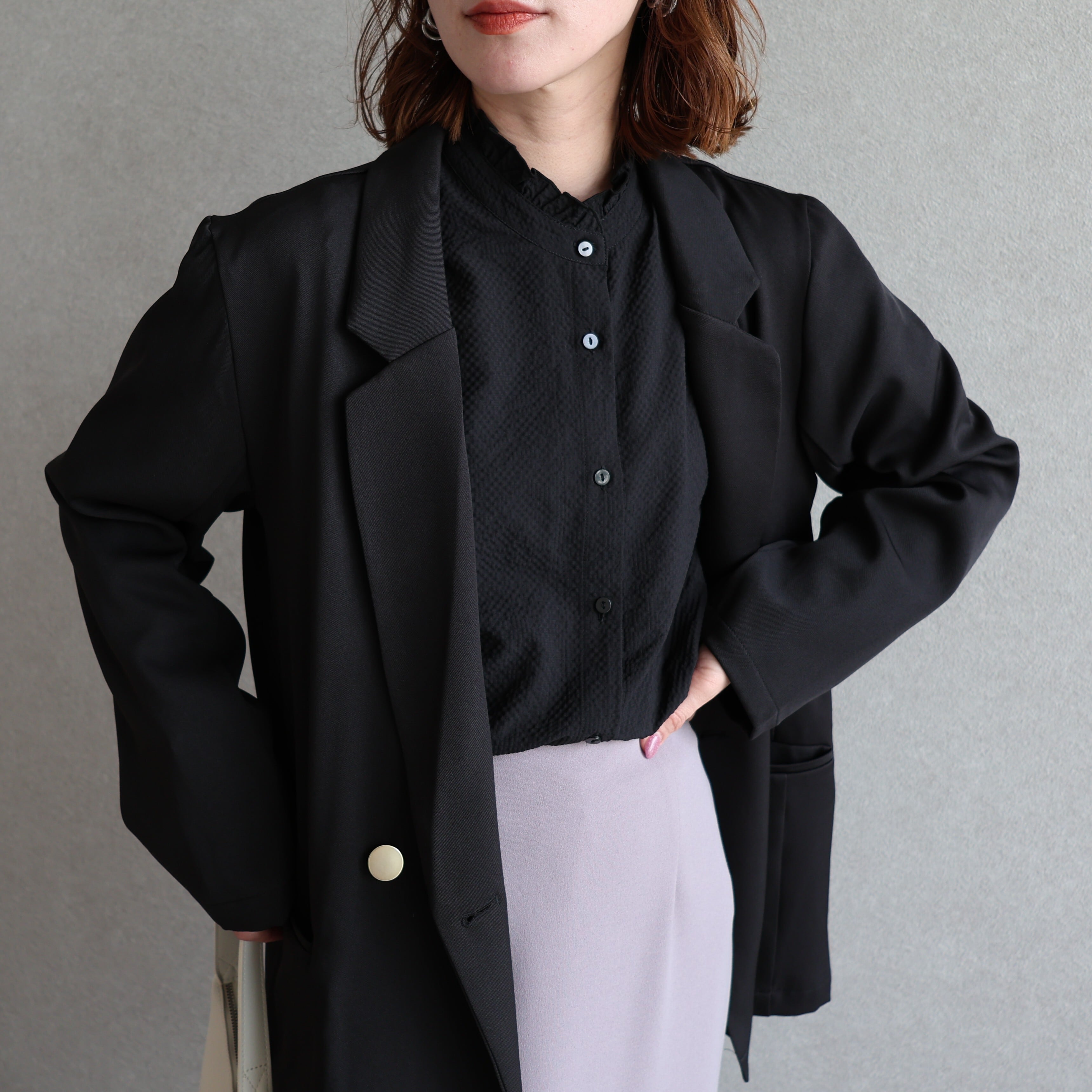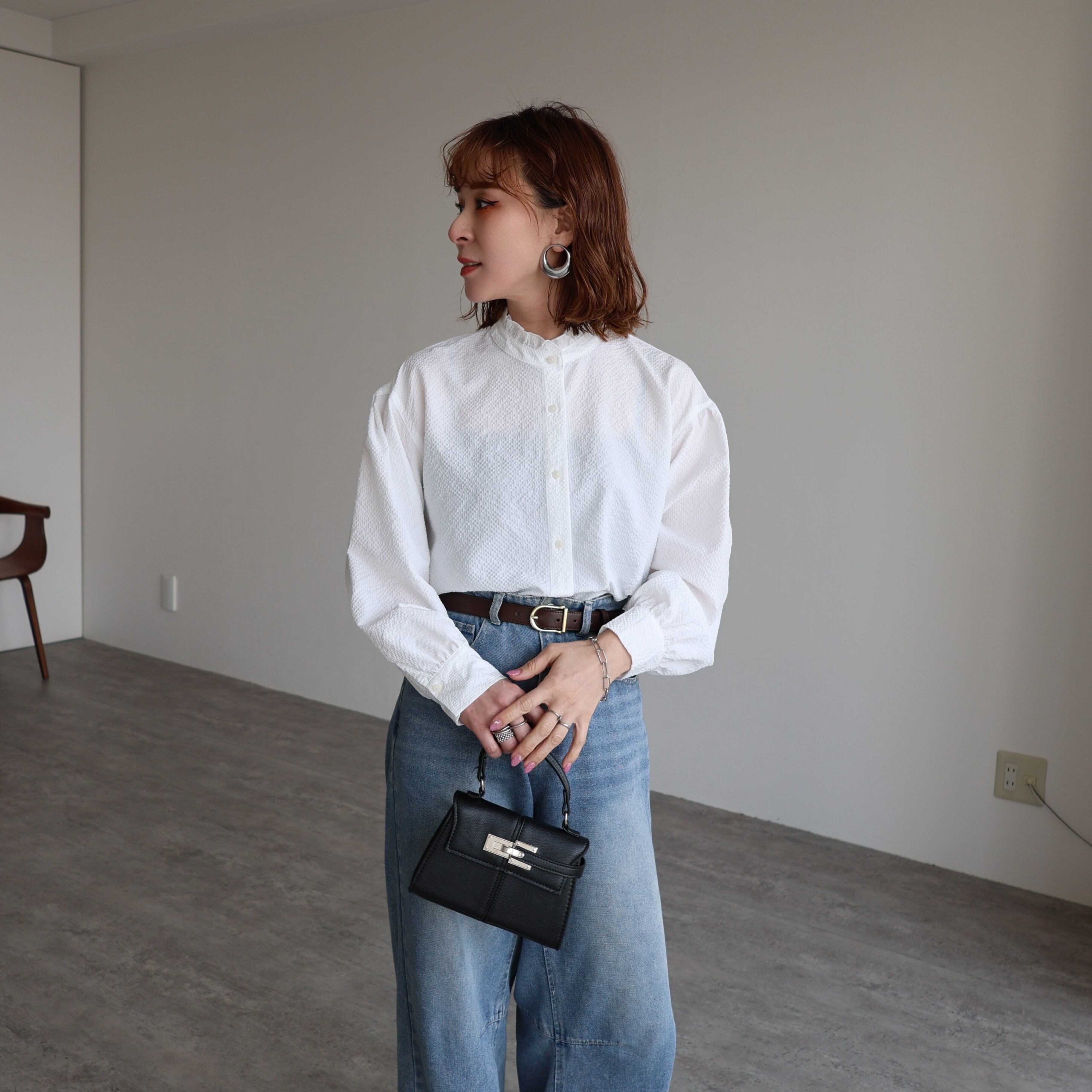 襟のフリルを活かして、ニットやスウェットとのレイヤードのアクセントに◎