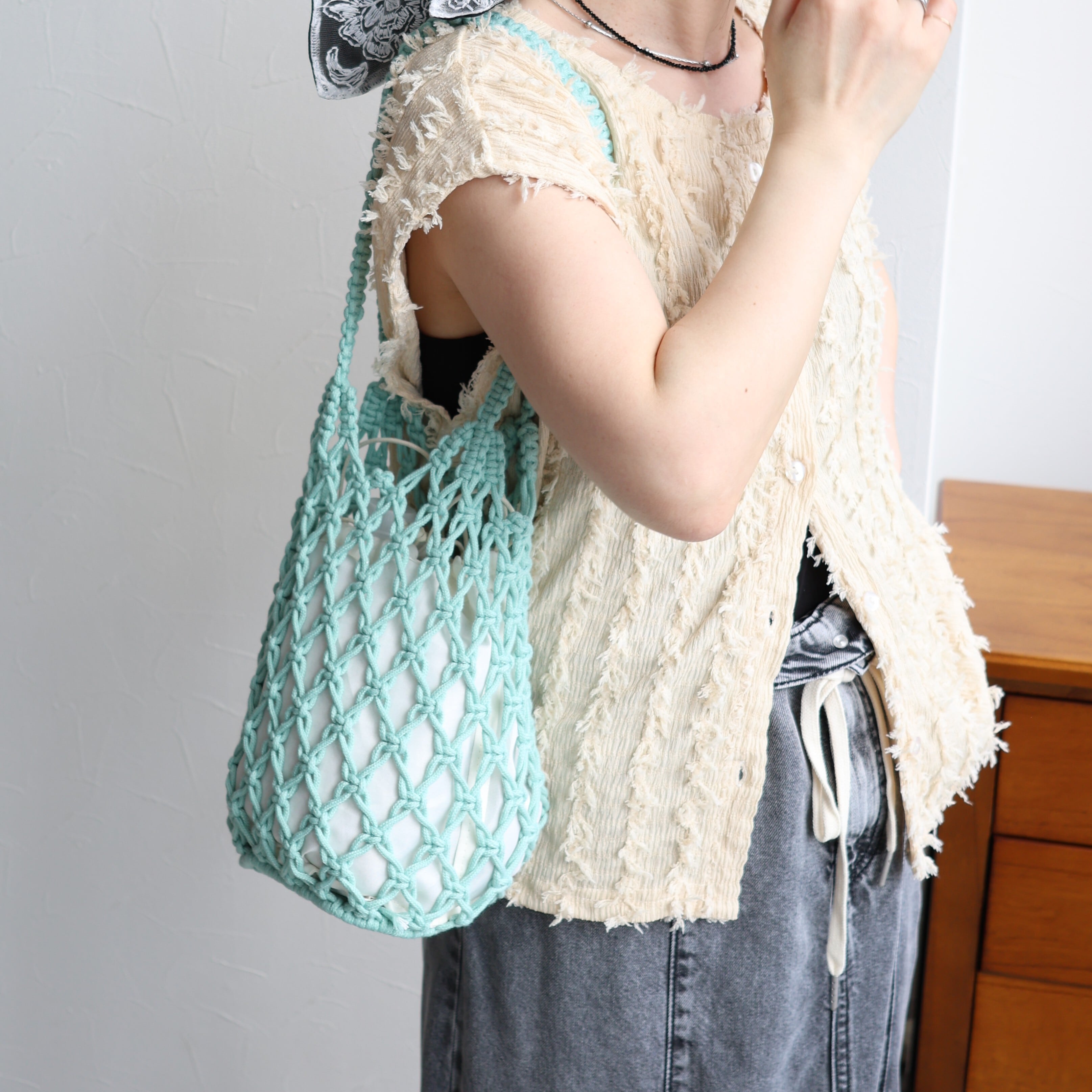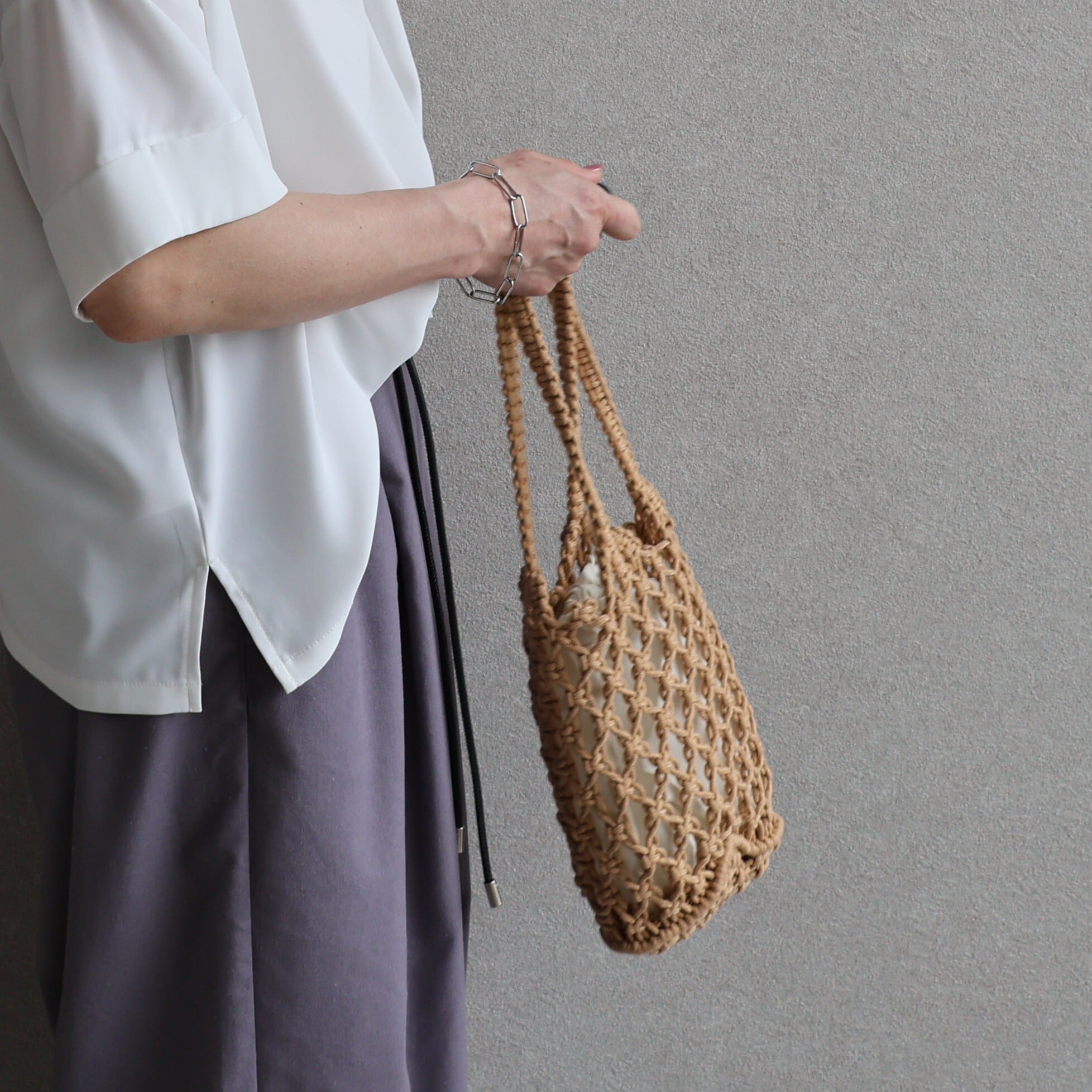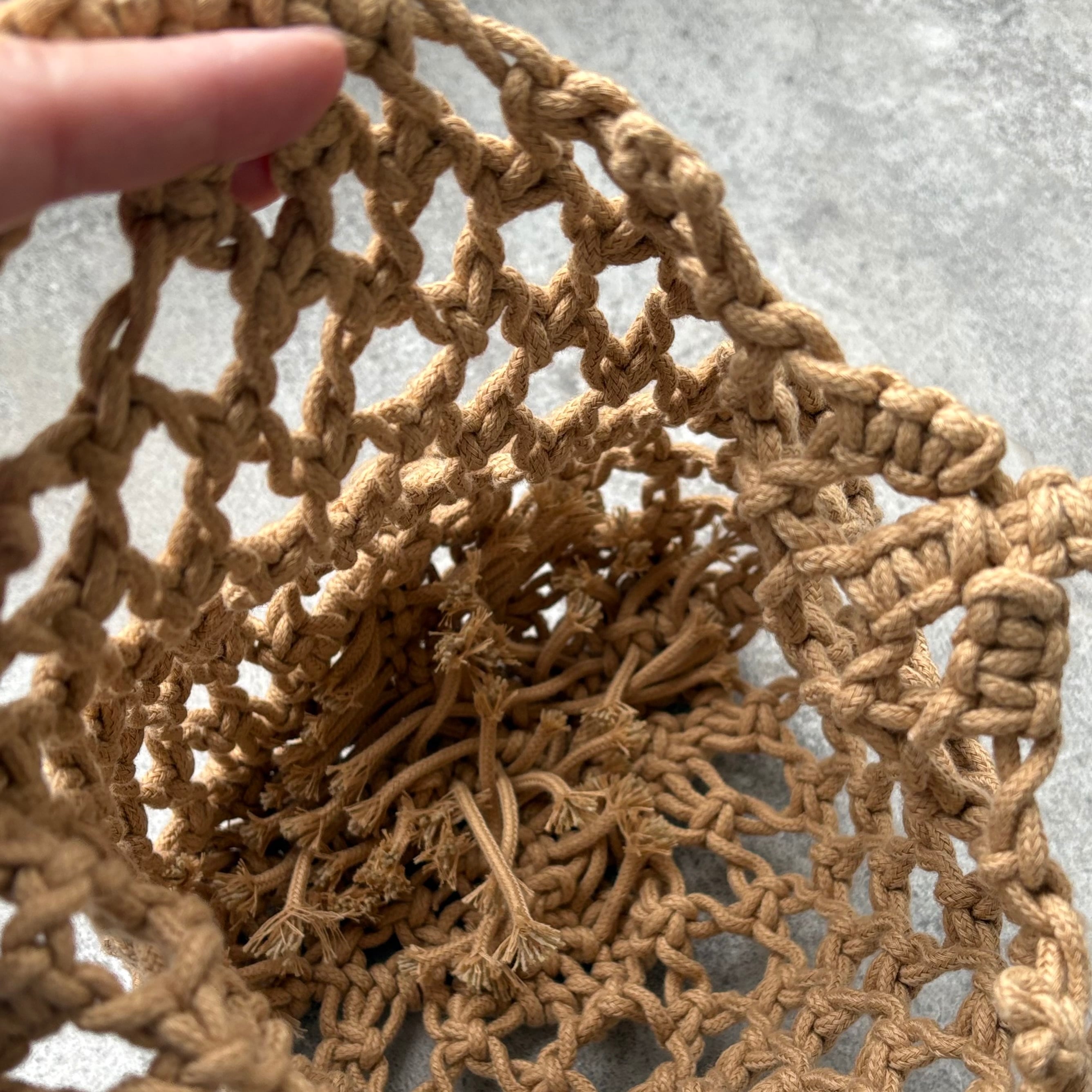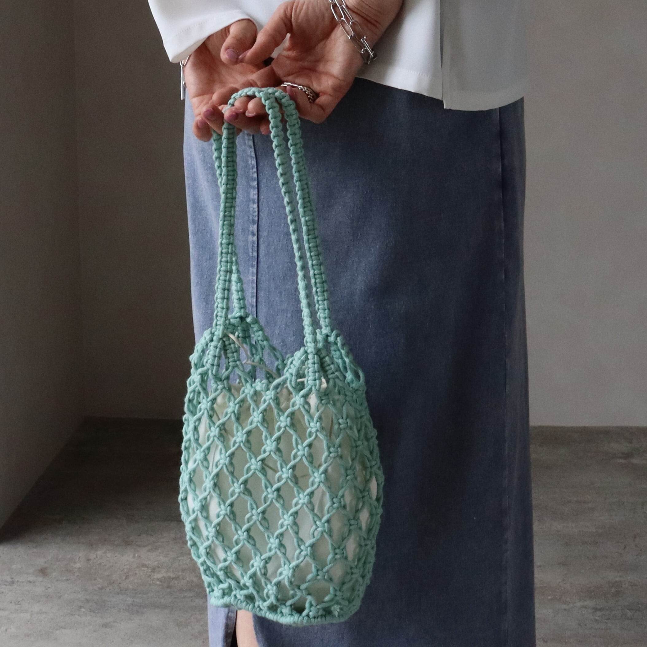 ハンドメイドで丁寧に編み上げられたコードのマクラメバッグ。