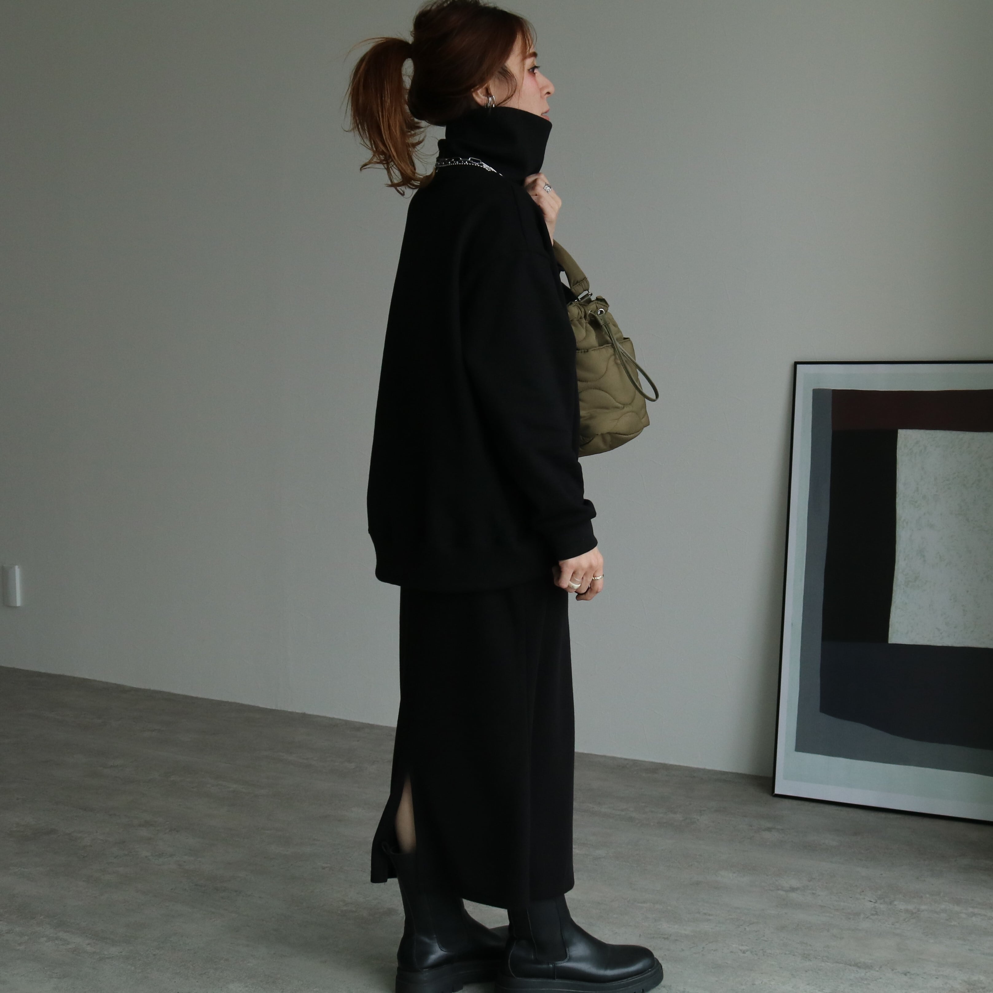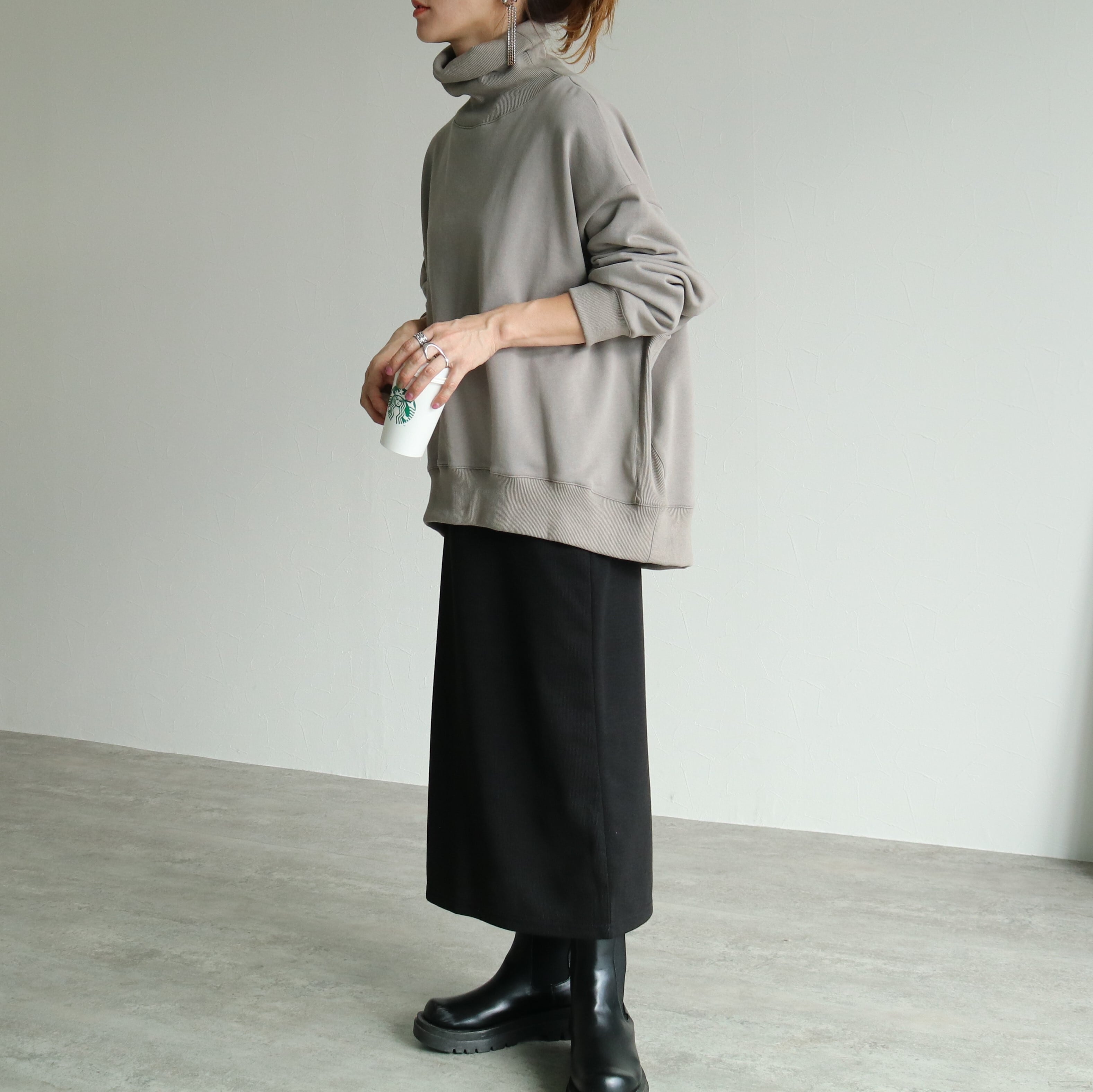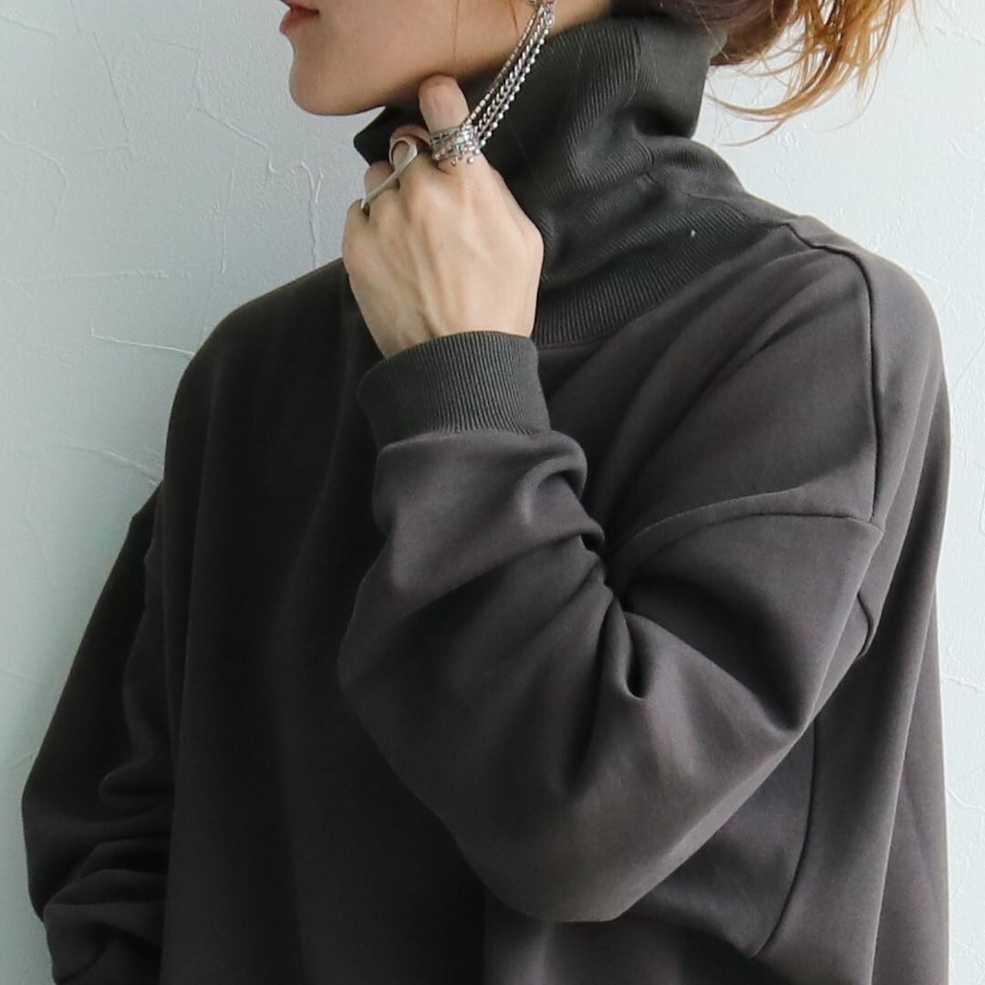 ハイネックのリブがスウェットなのにグッと大人っぽい印象に◎