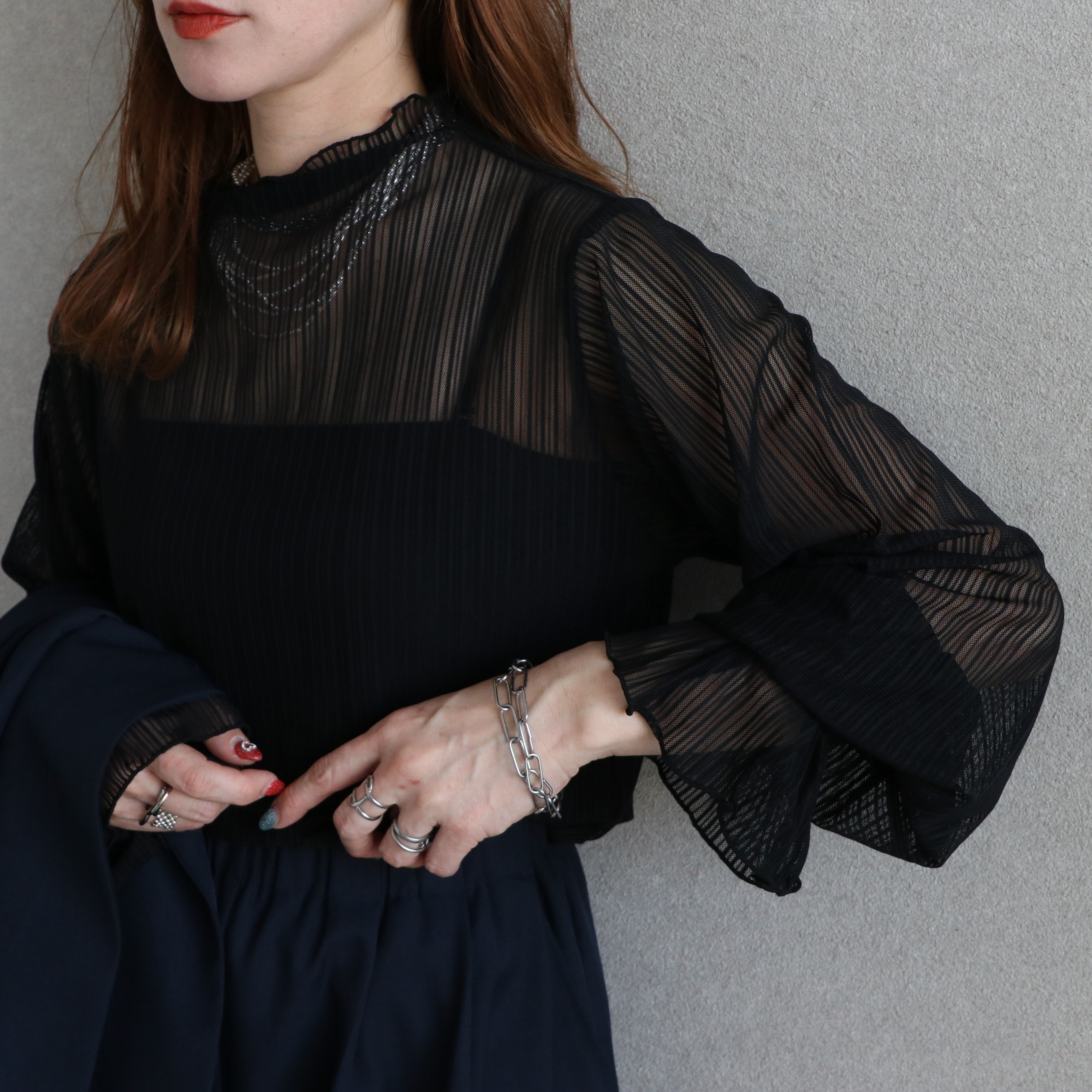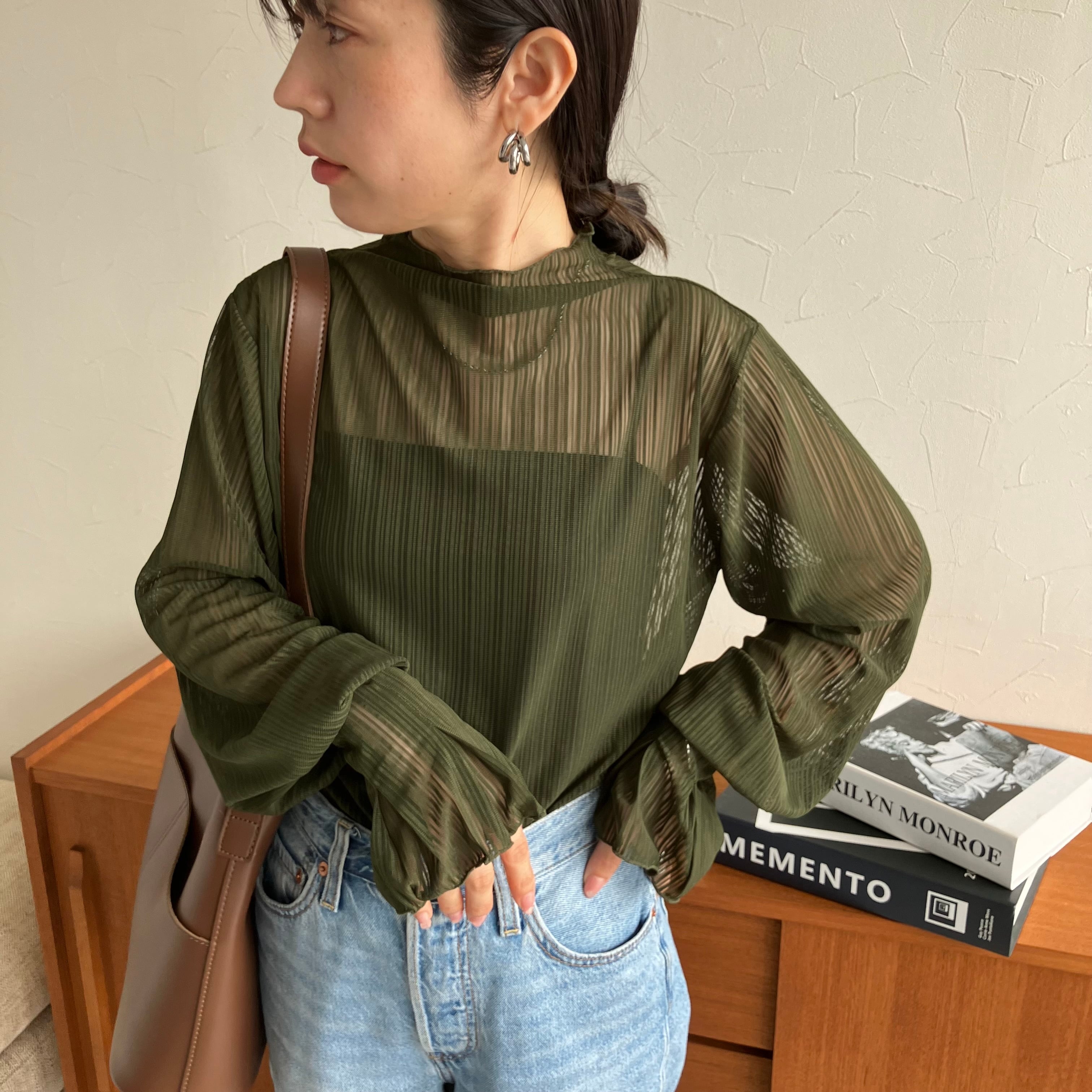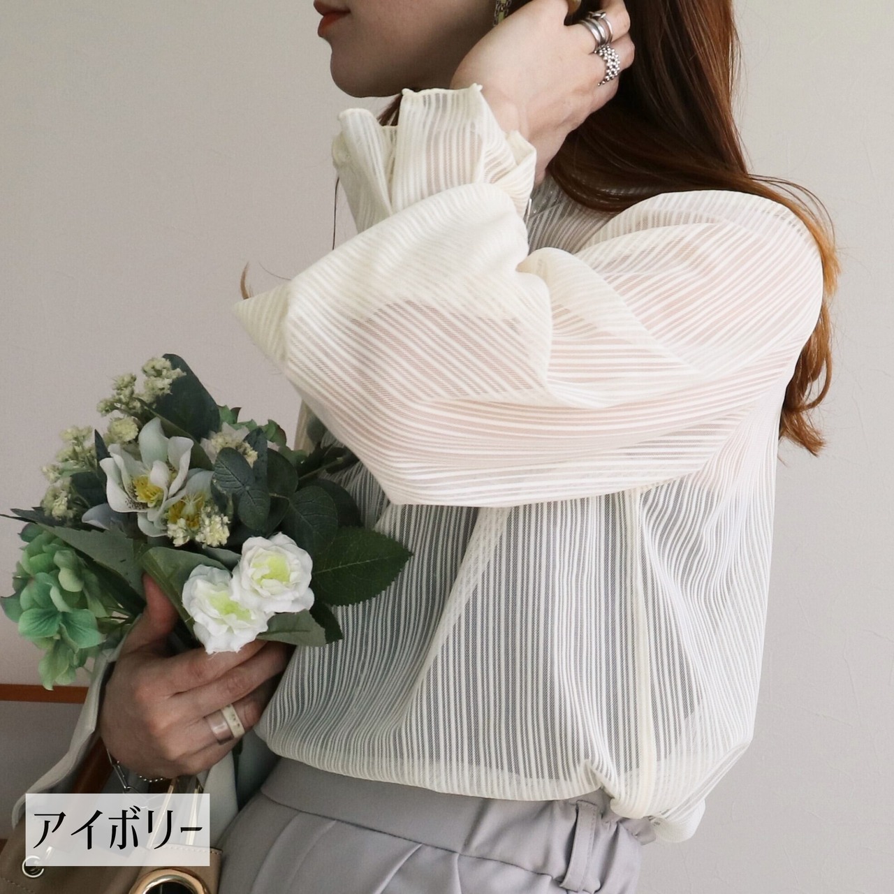 シアーストライプで大人の透け感を演出する秋ブラウス。