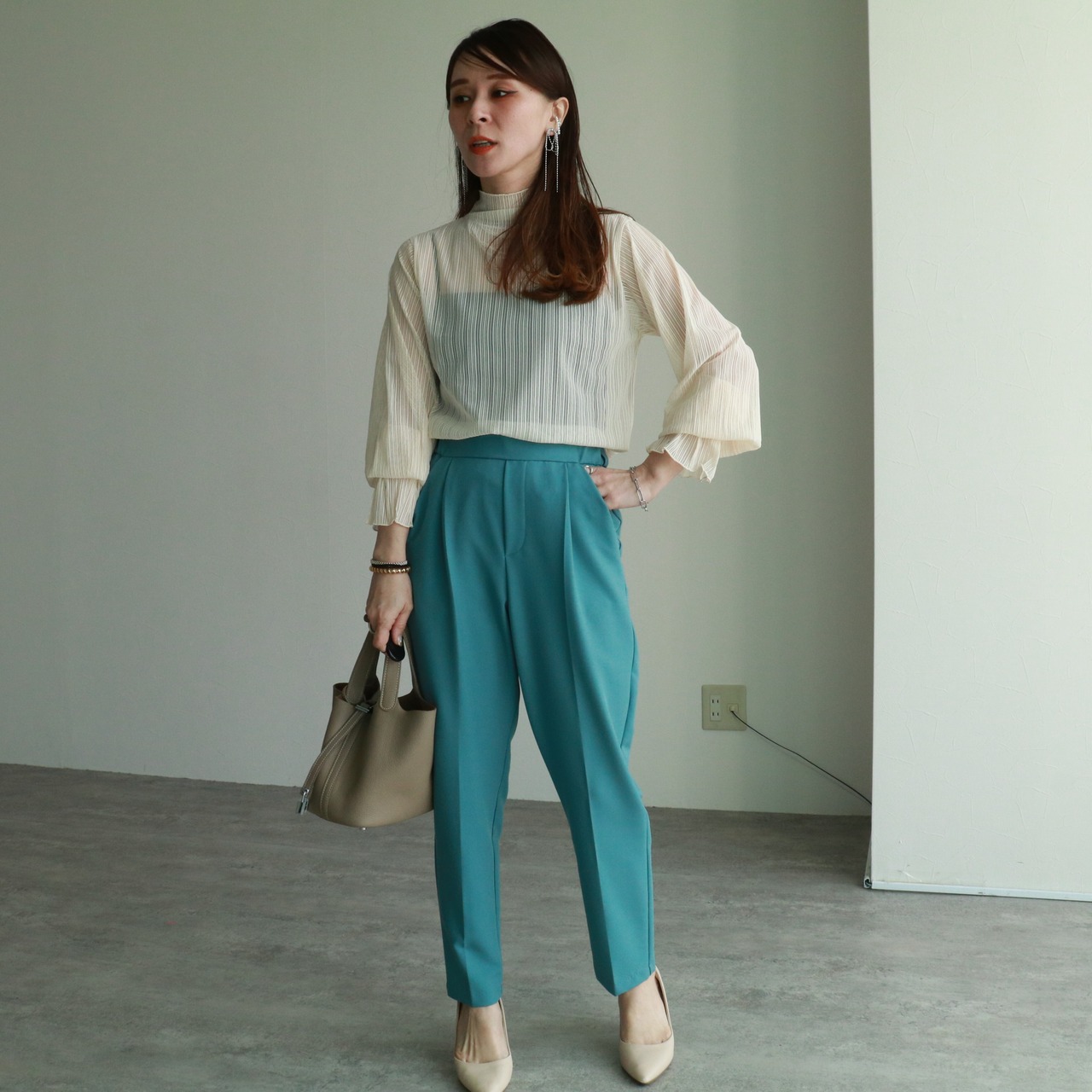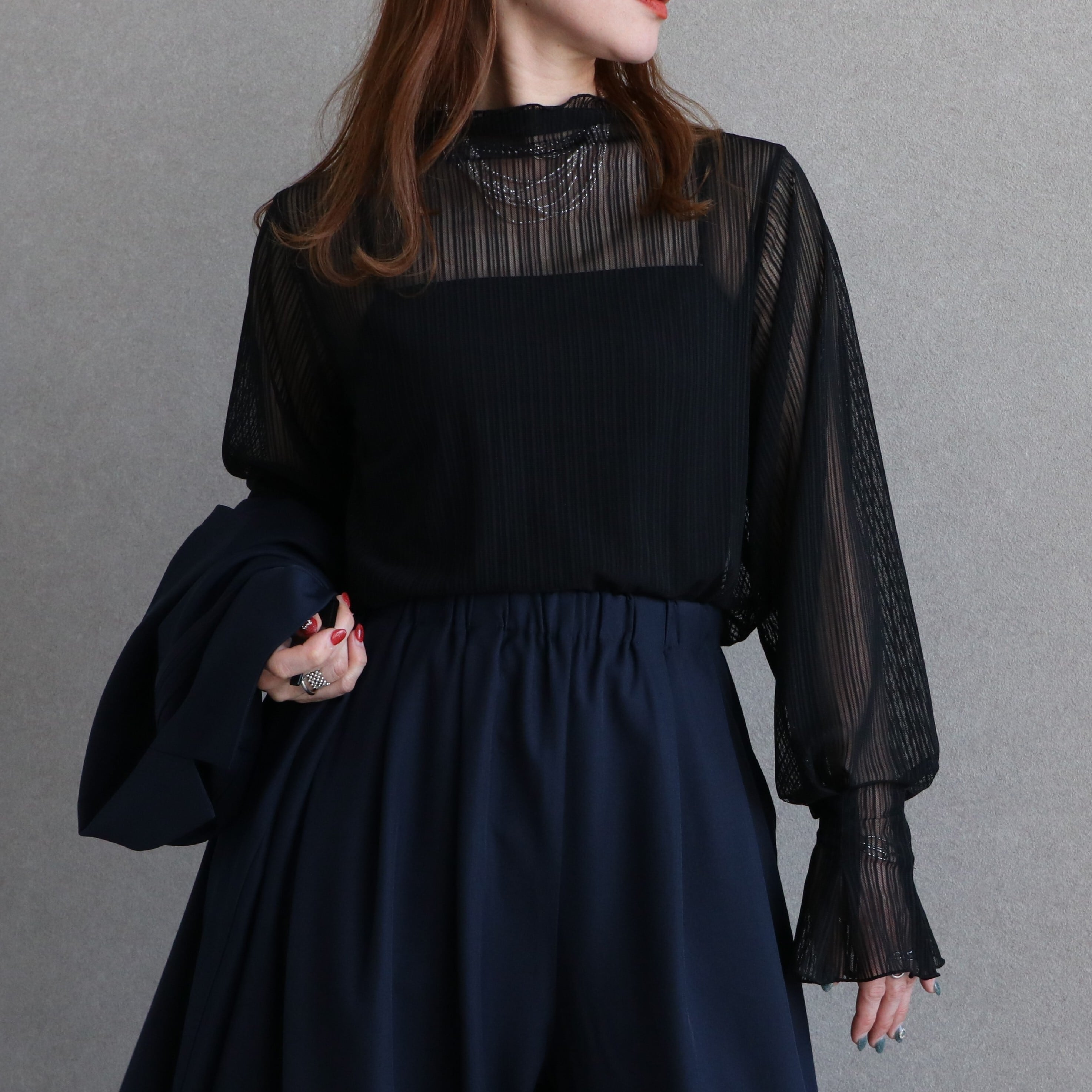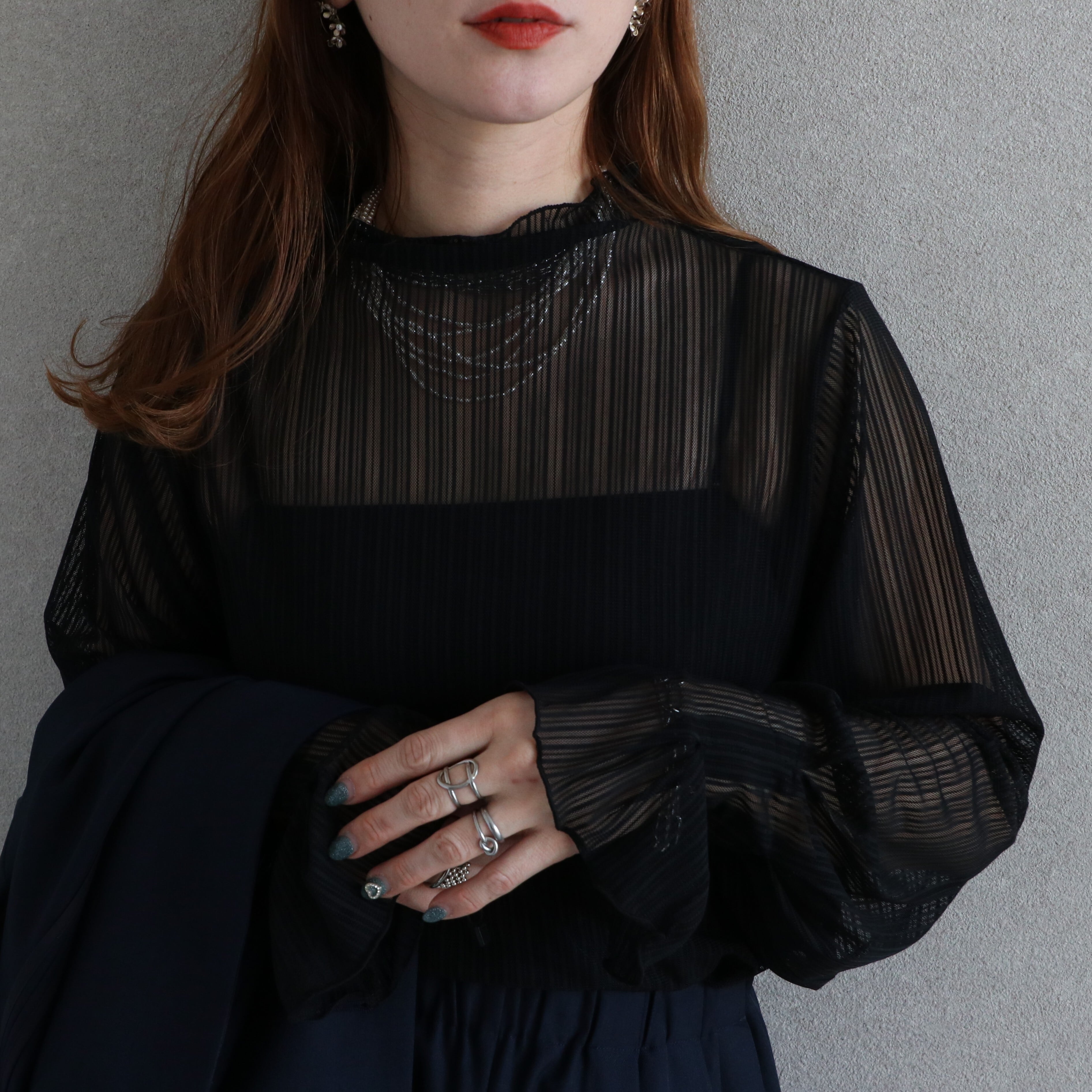 シアーストライプで大人の透け感を演出する秋ブラウス。