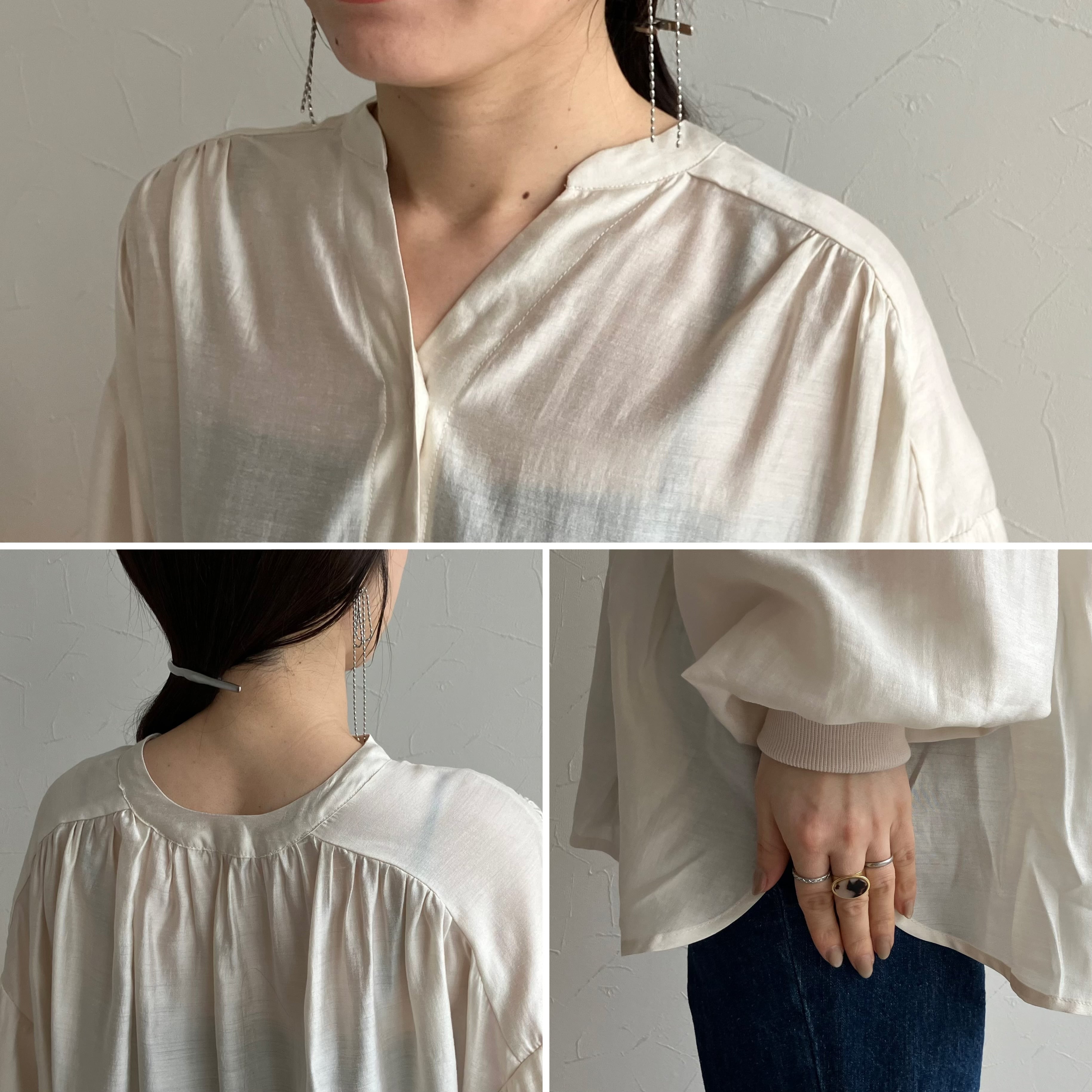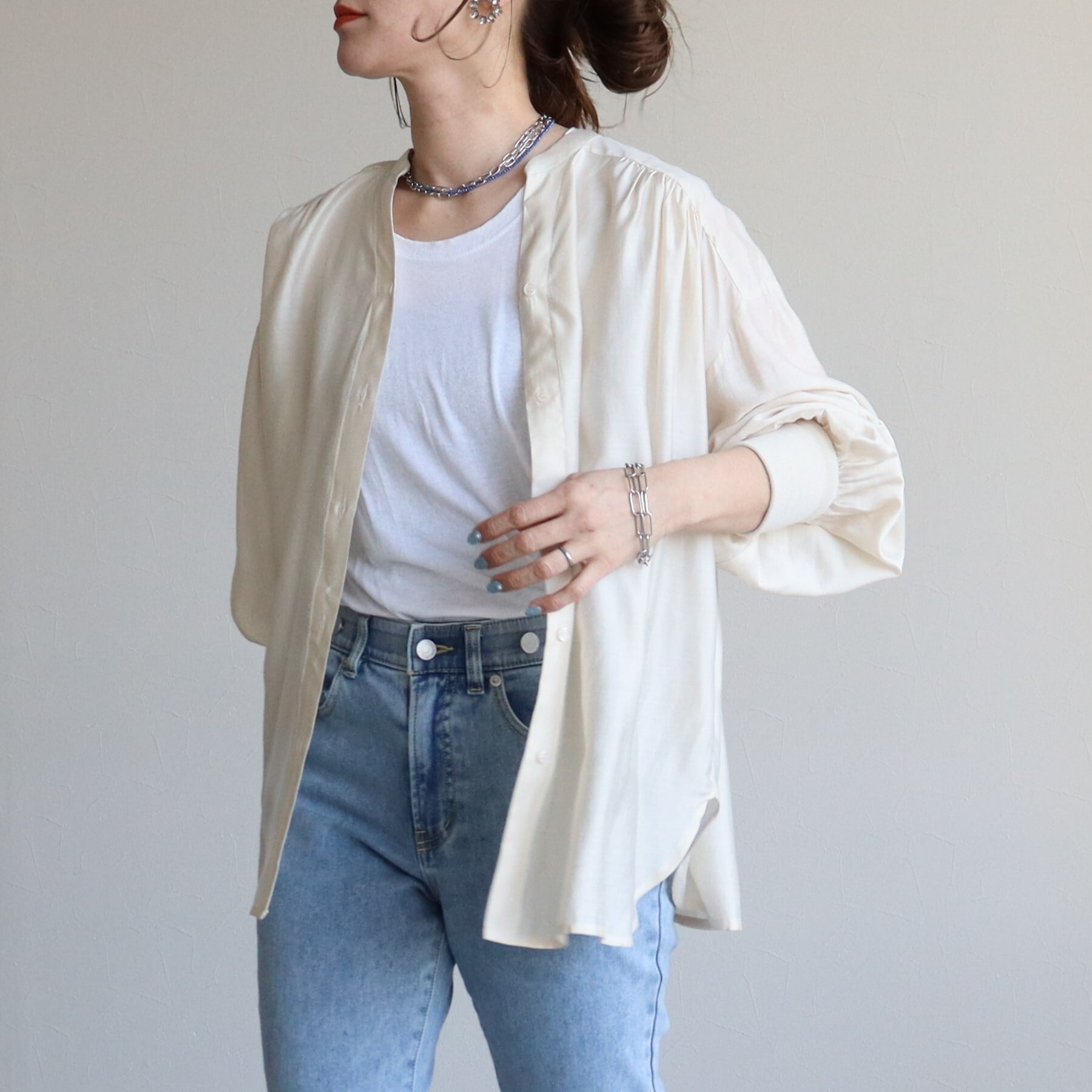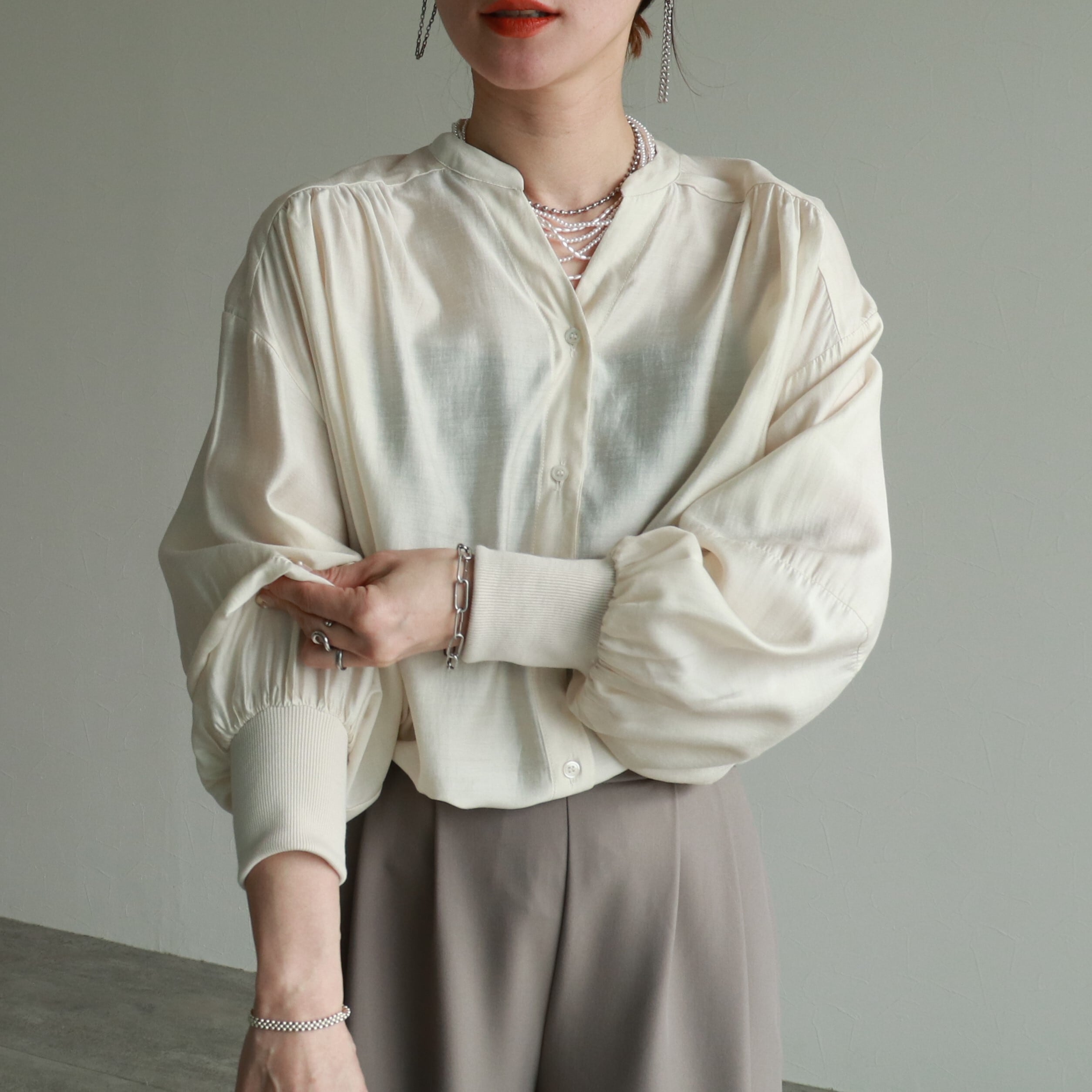 首元のスキッパーデザインは大人な雰囲気を醸し、ショートネックレスなどとも相性抜群。ぜひお手持ちのお気に入りアクセサリー合わせでお楽しみください。