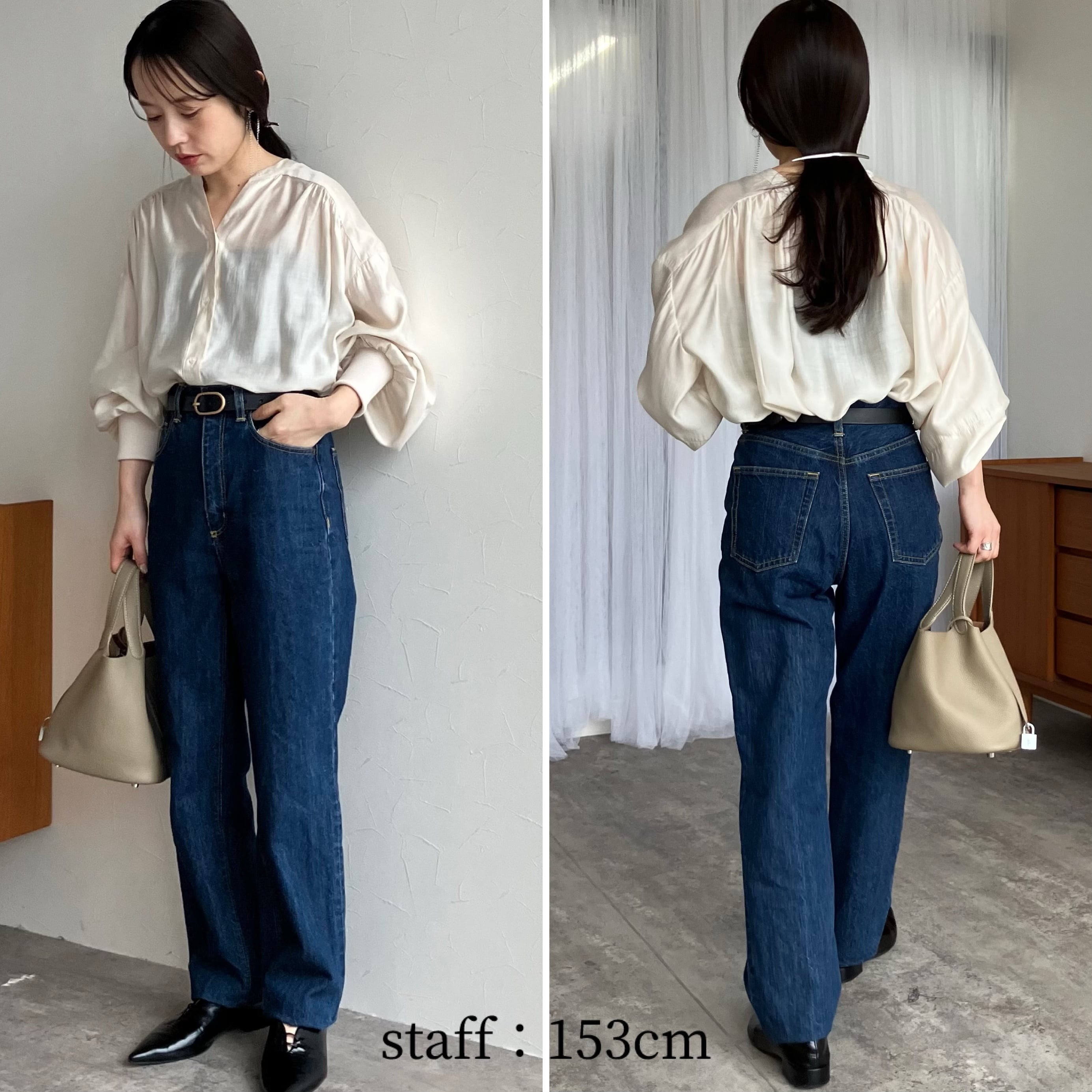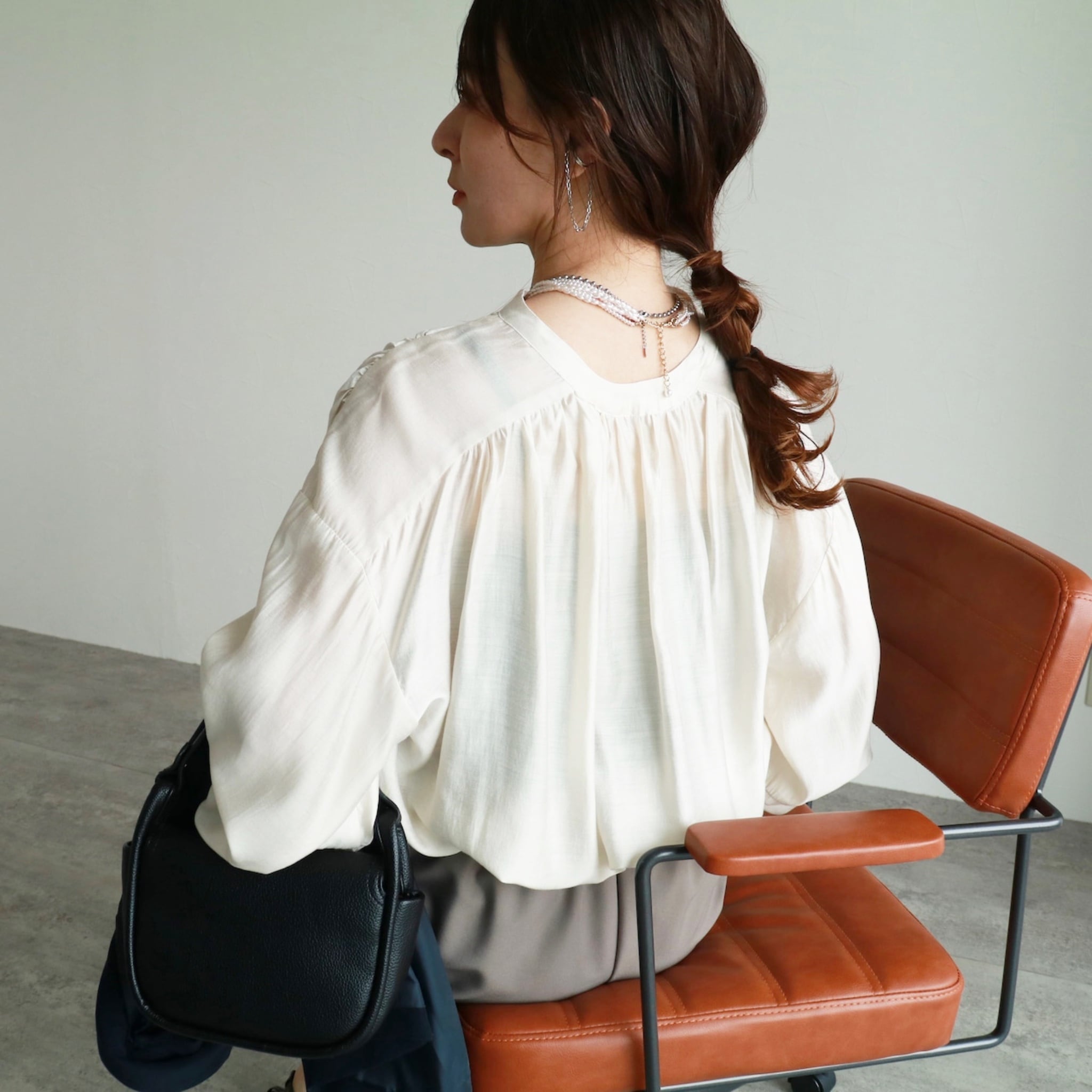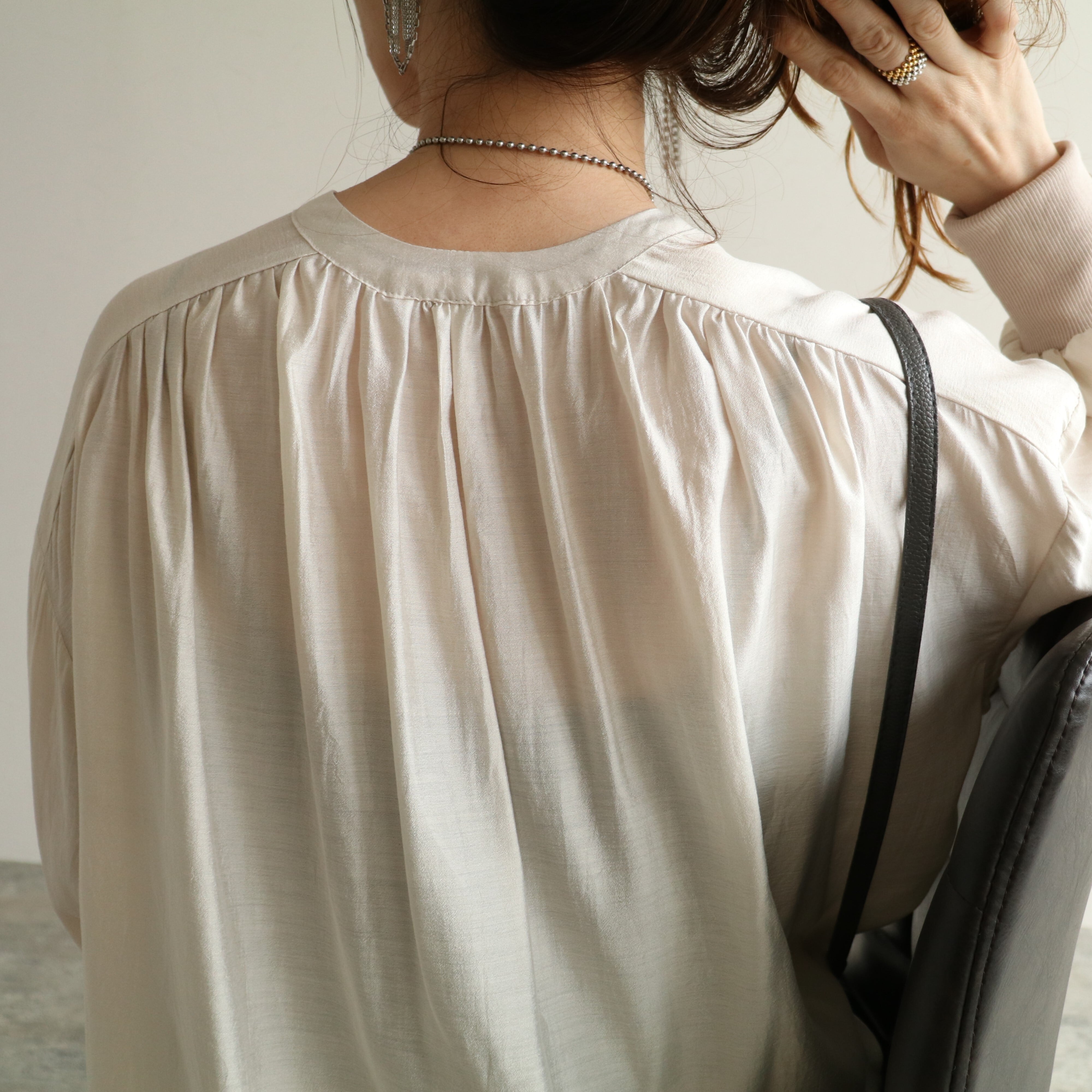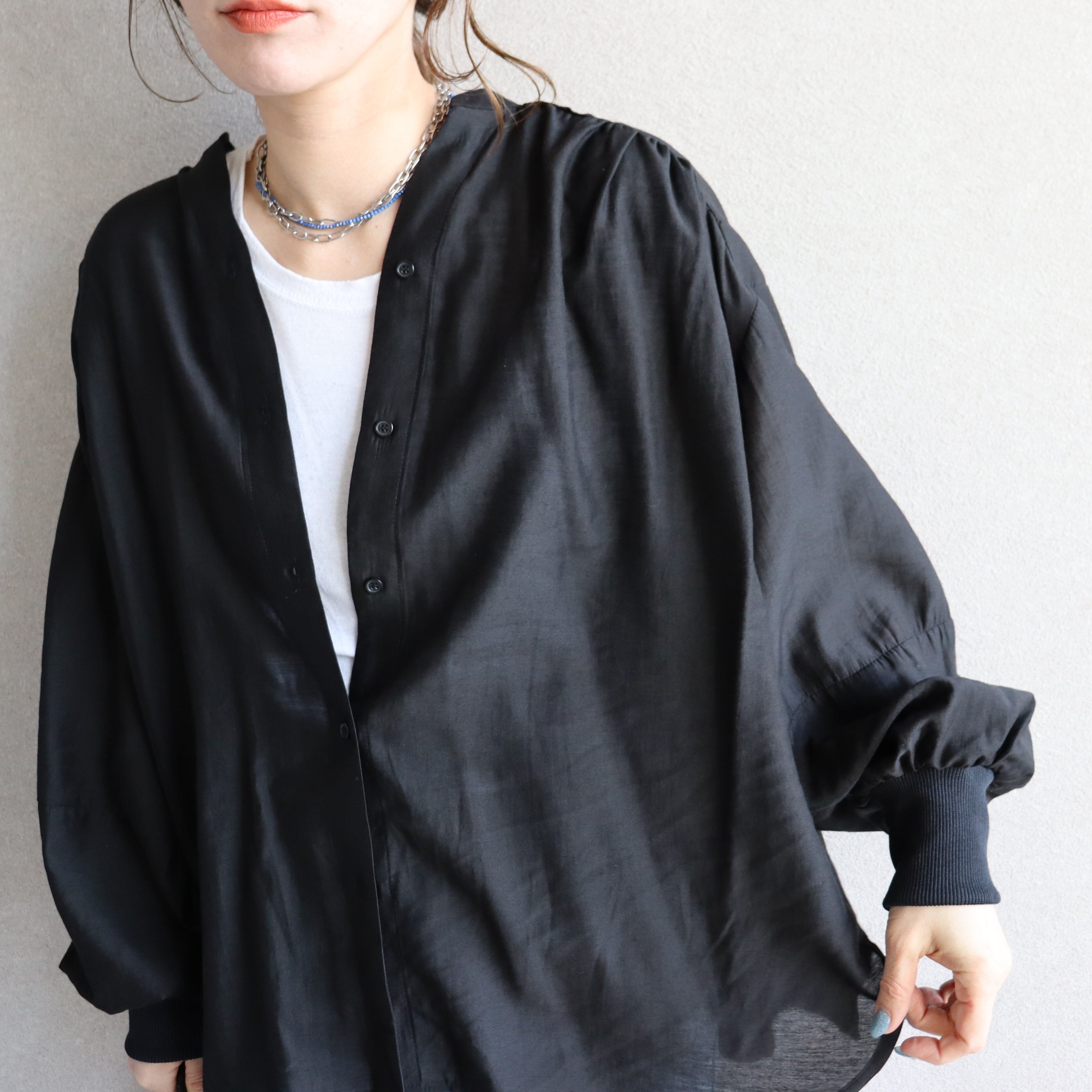 首元のスキッパーデザインは大人な雰囲気を醸し、ショートネックレスなどとも相性抜群。ぜひお手持ちのお気に入りアクセサリー合わせでお楽しみください。