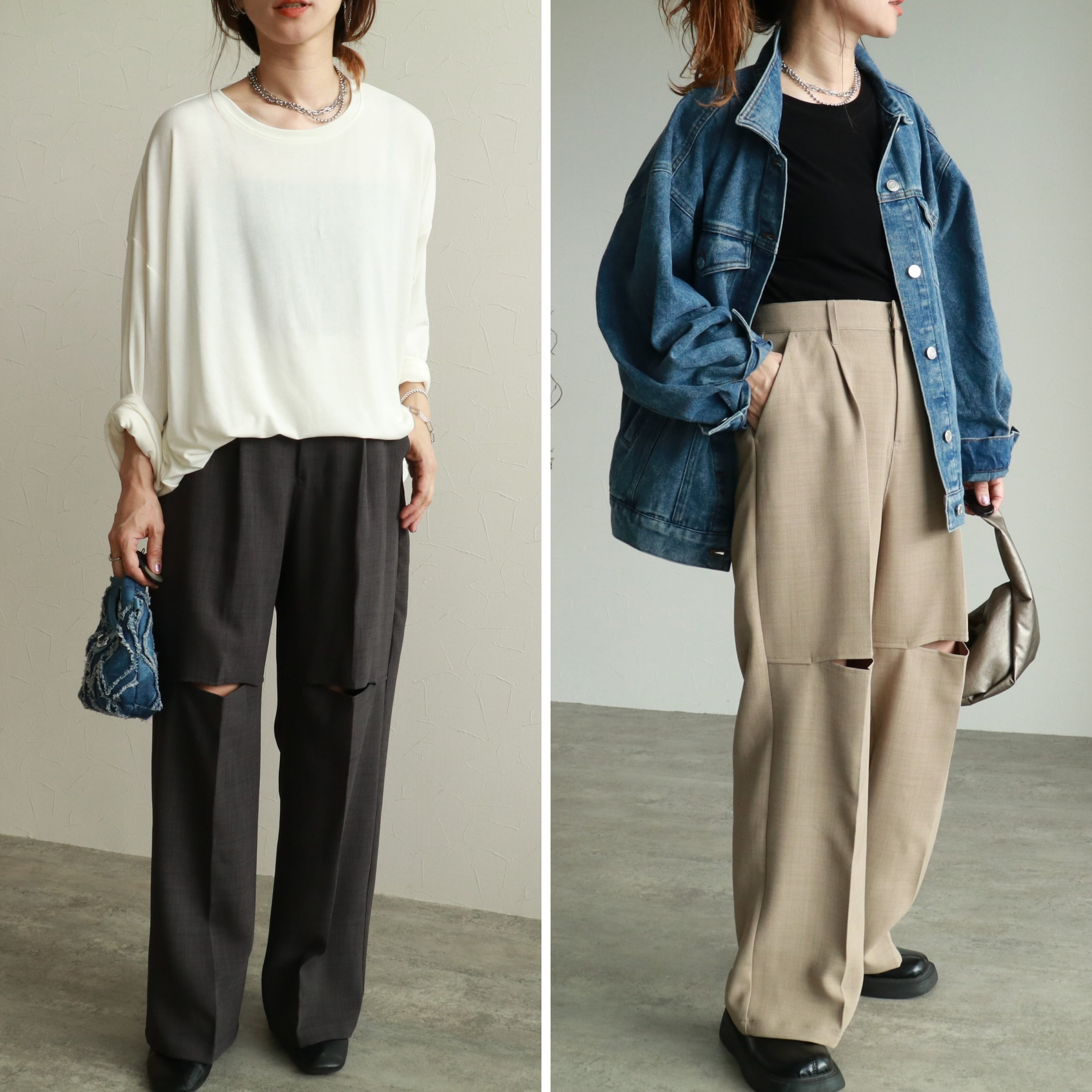 膝の上にくる位置にスリットが施されており、トレンド感もありつつしっかりと脚長効果も演出できます。後ろウエストがゴム仕様となっており、履き心地抜群です◎!