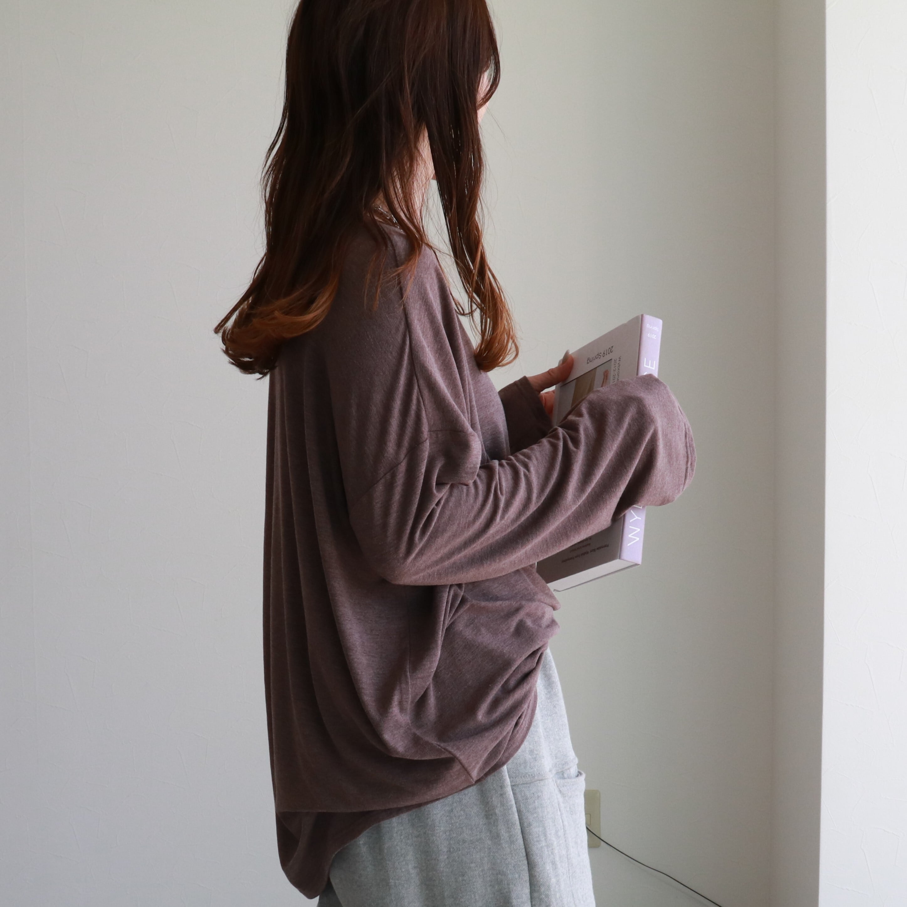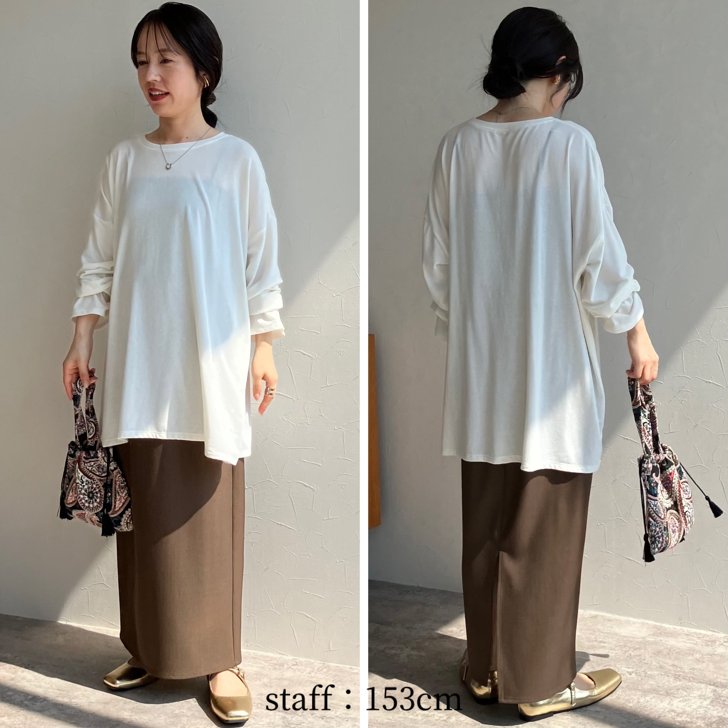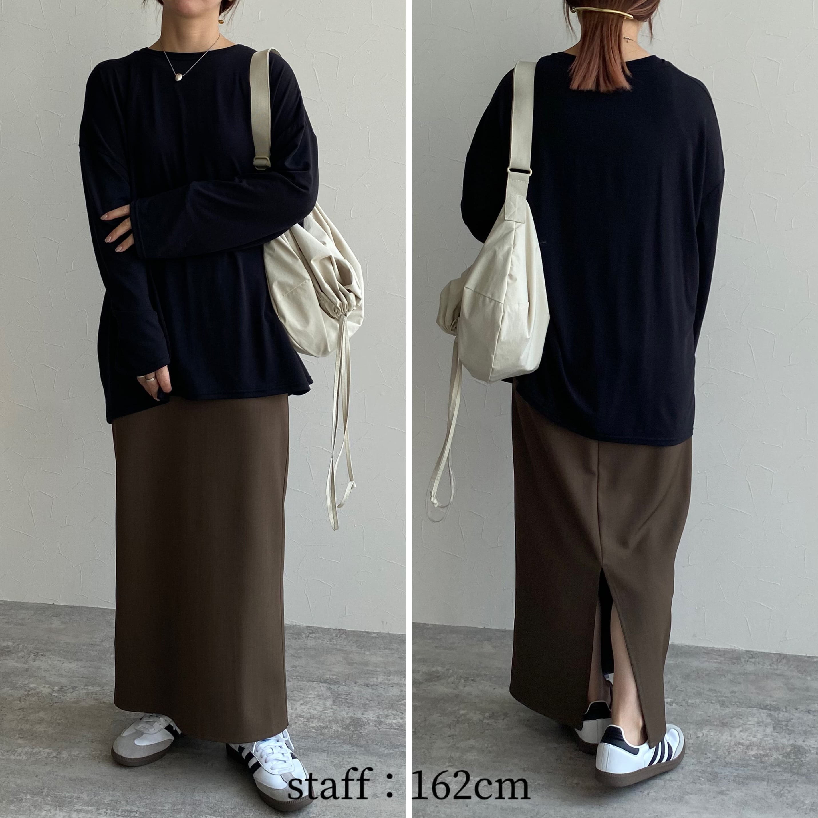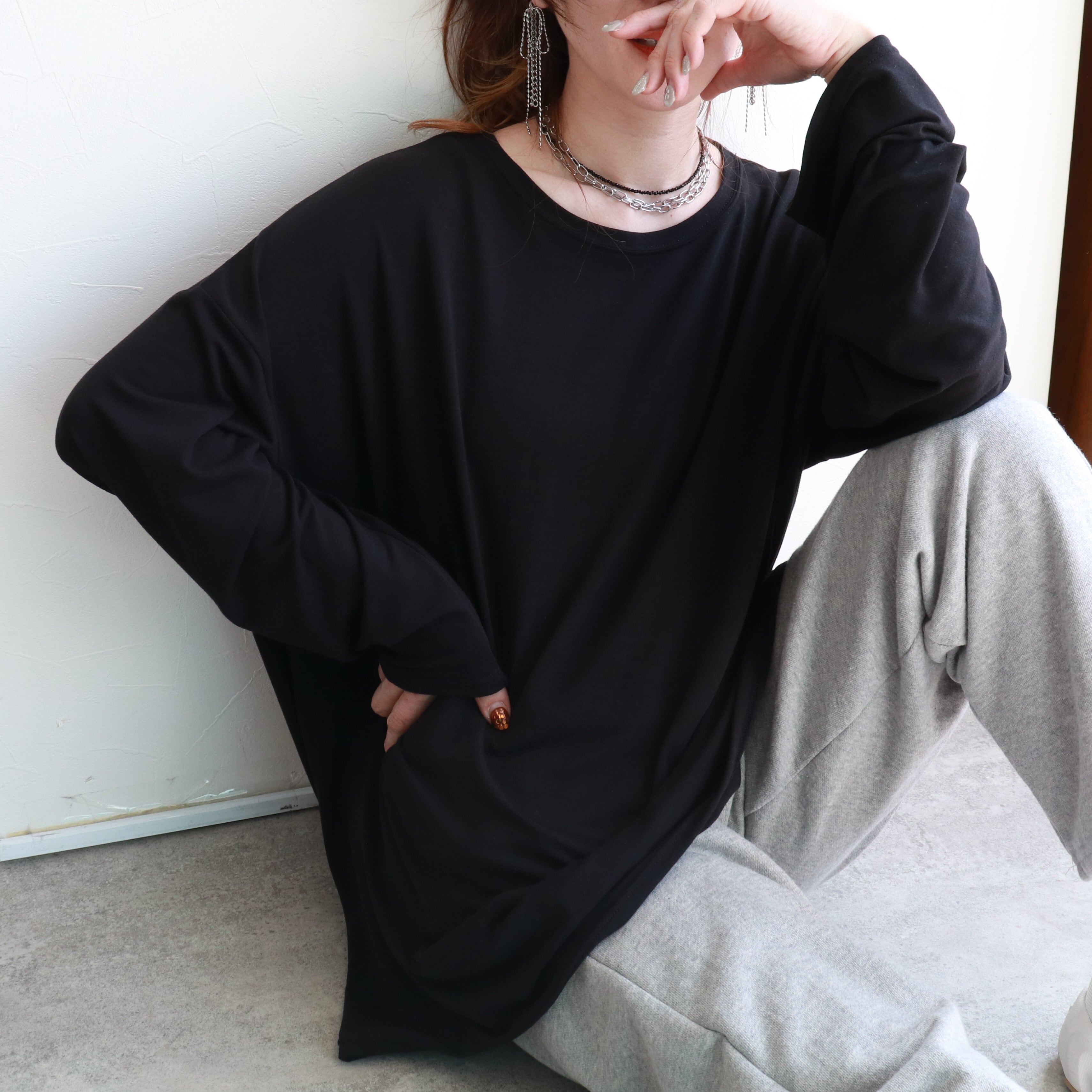 落ち感のある素材と、たっぷりととった身幅と相まってストレスフリーな着心地。衿元は細めのクルーネックでカジュアルのなかにも女性らしさが光ります。