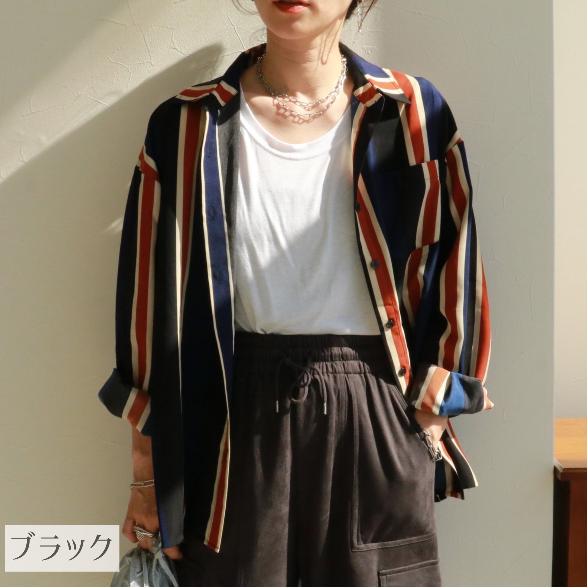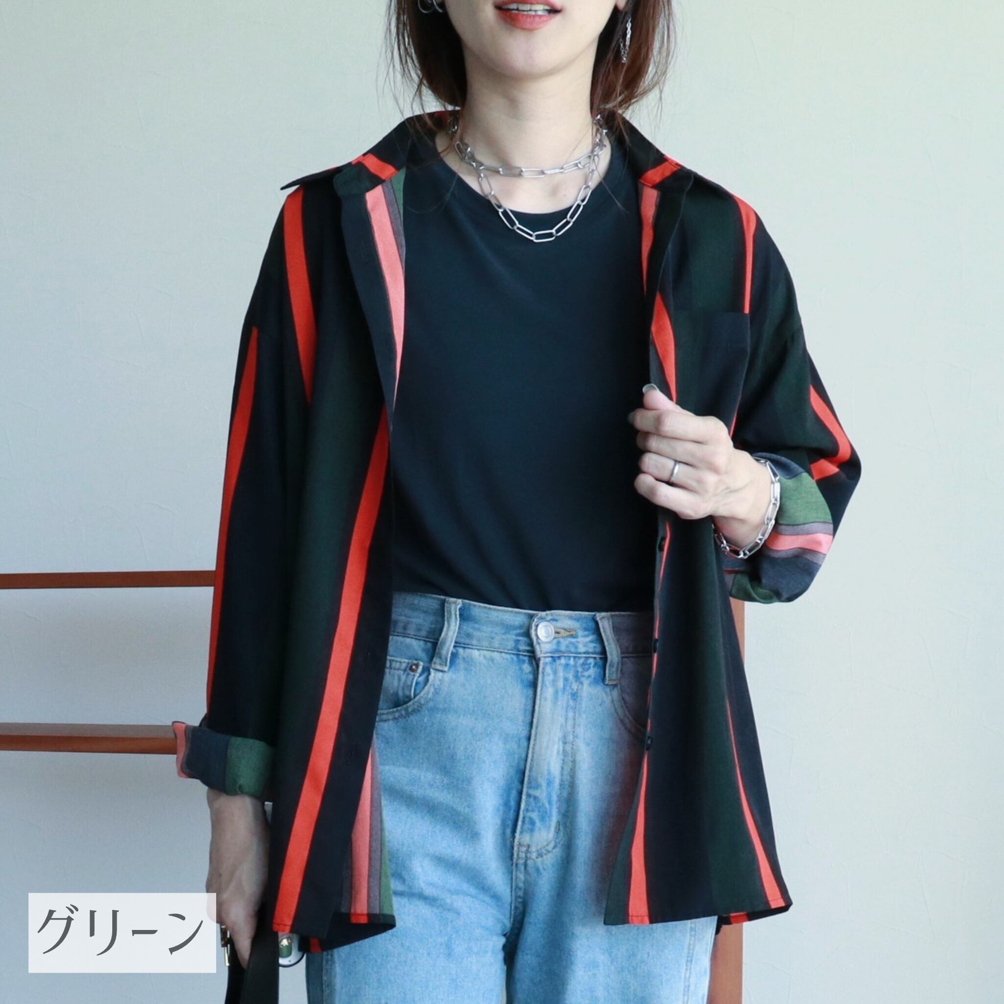 ワイドピッチでシックなカラーリングのストライプ柄でカジュアルにもきれいめにも使える一枚。オーバーサイズで長めの着丈がボディラインをカバーし、安心して着用いただけます。