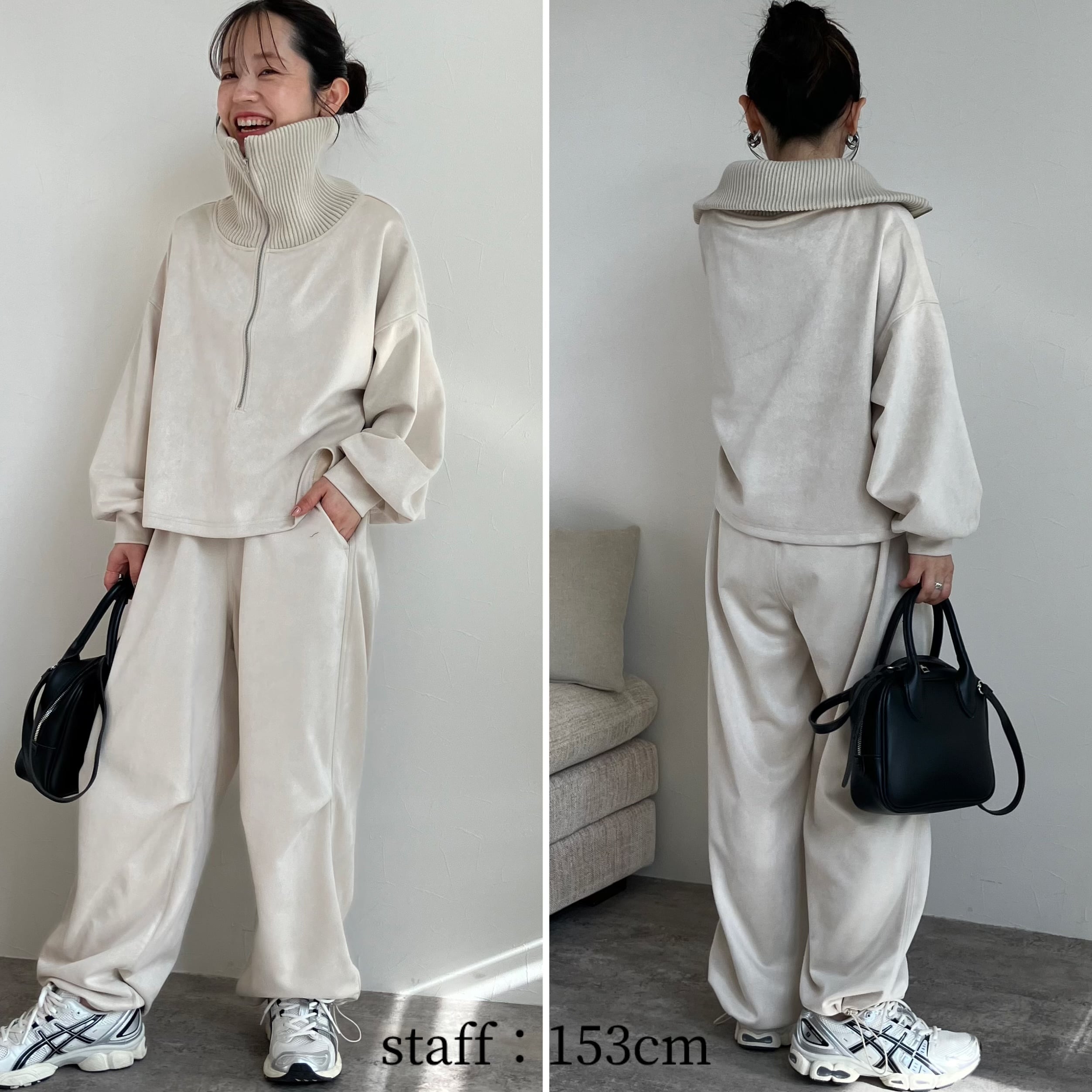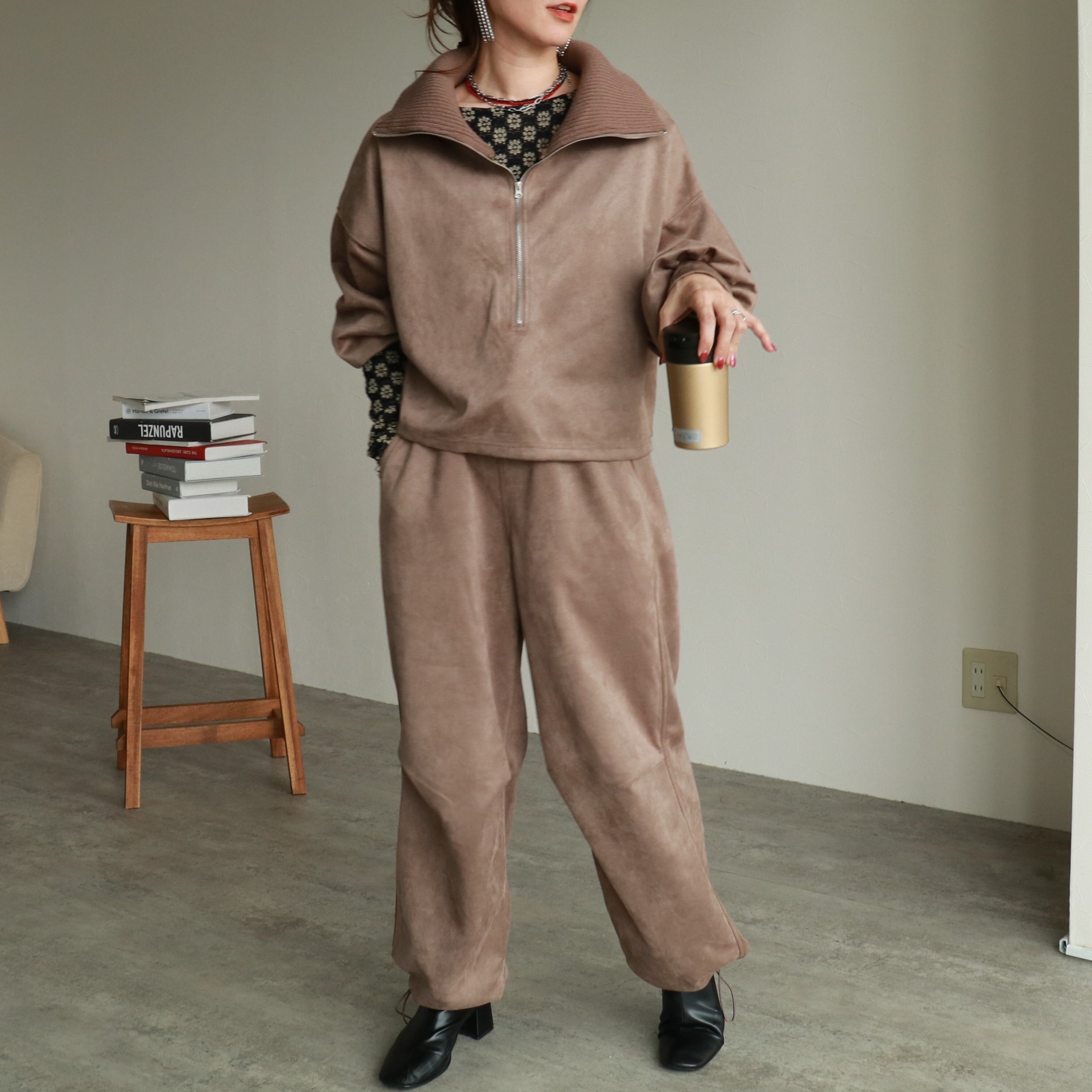 上品な光沢感と柔らかさのフェイクスエードを使用し、程よくゆとりのあるシルエットでストレスフリーに着用頂けます。パンツはバックゴムで履き心地抜群◎セットアップはもちろん、別々に使用してもコーデのポイントになるアイテムです。