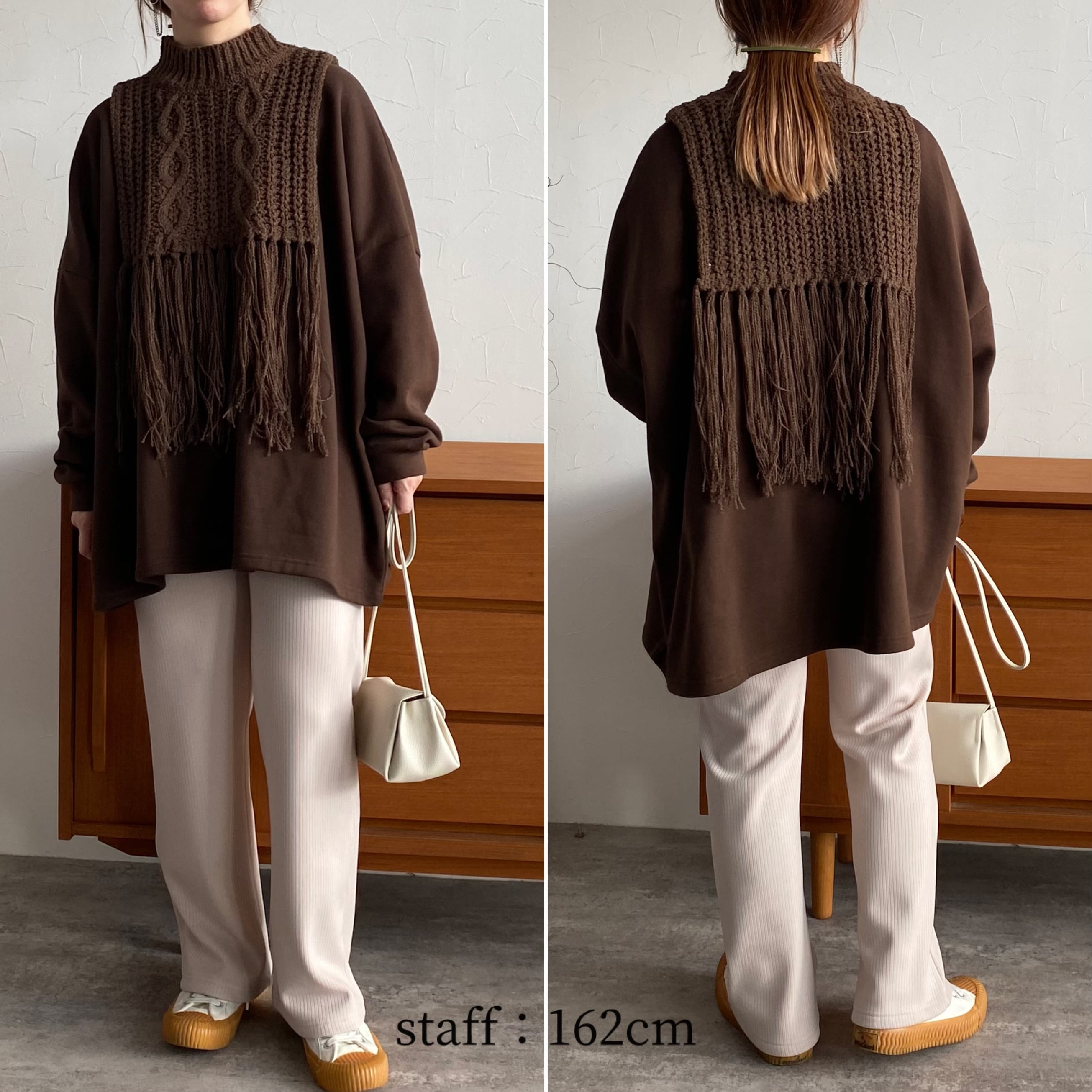フロント部分には立体的なケーブル編みが施されていて温かみとトレンド感を演出してくれます♩チクチク感のない軽やかで肌触りの良い素材感となっております!