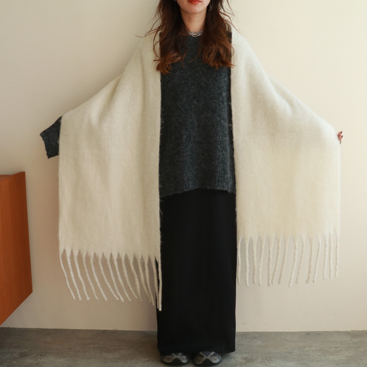 さまざまな巻き方を楽しめる大判マフラー