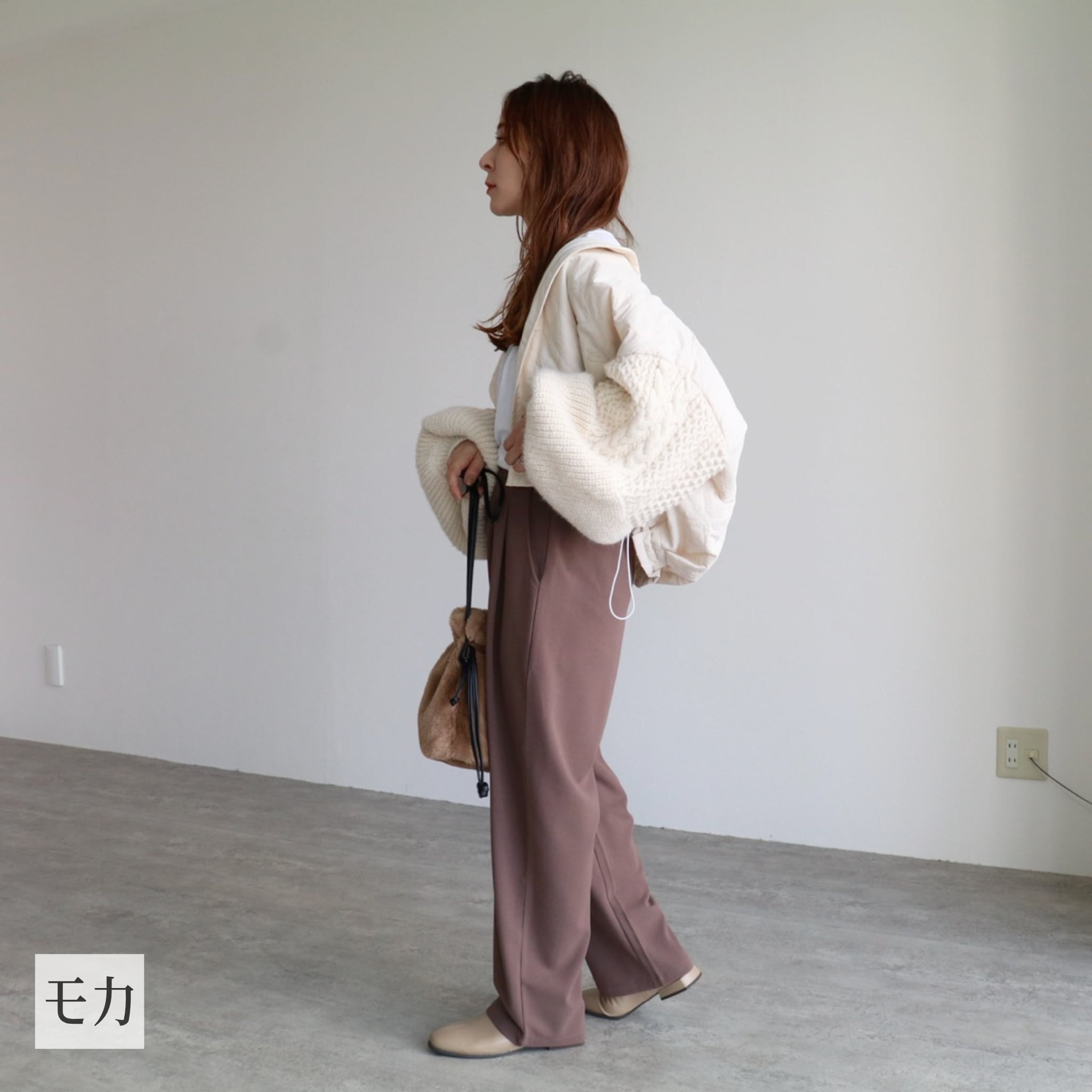 ウエストは前がフラットでインしても綺麗に収まるような仕様で、後ろはゴムになっており、楽な穿き心地となっております。