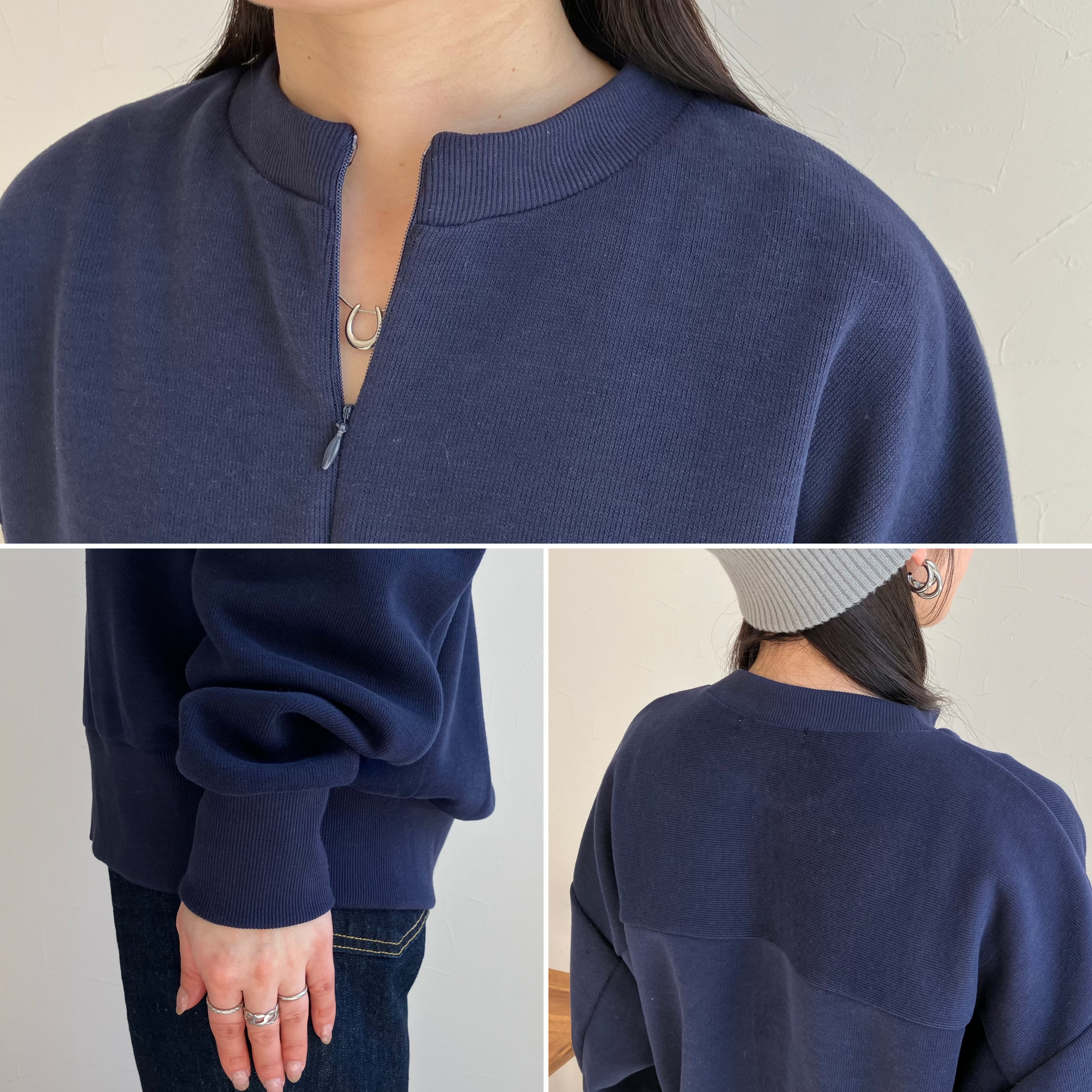 ZIPを全部閉めて着るのはもちろん、全部開けると襟元に抜け感が出たり、気分に合わせて変えられるのも嬉しいポイント◎